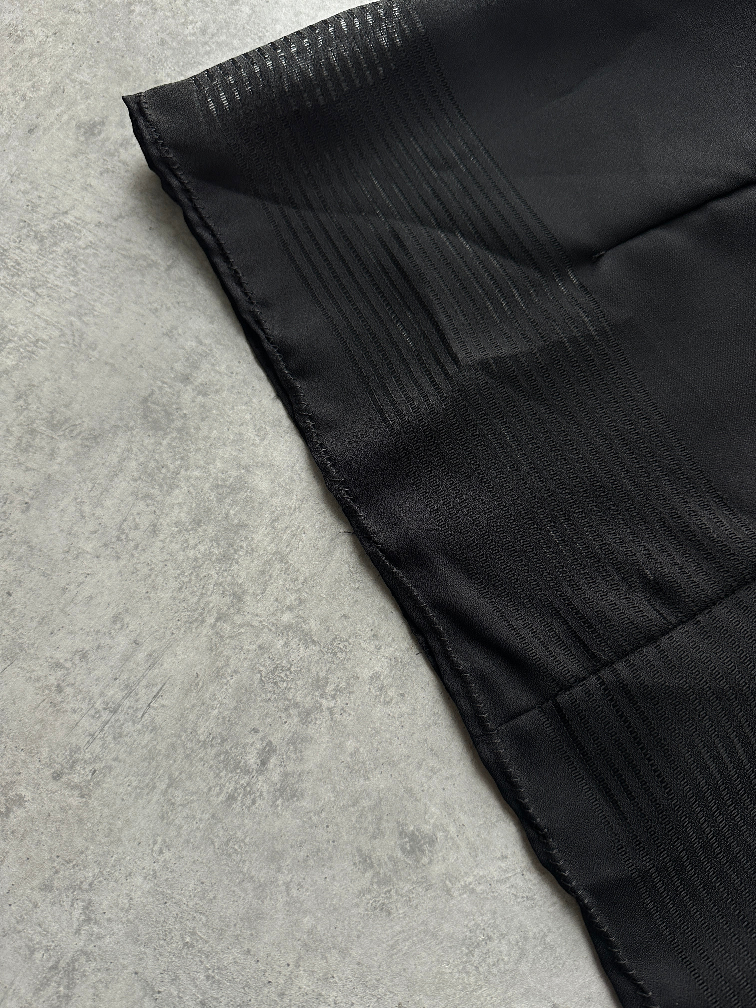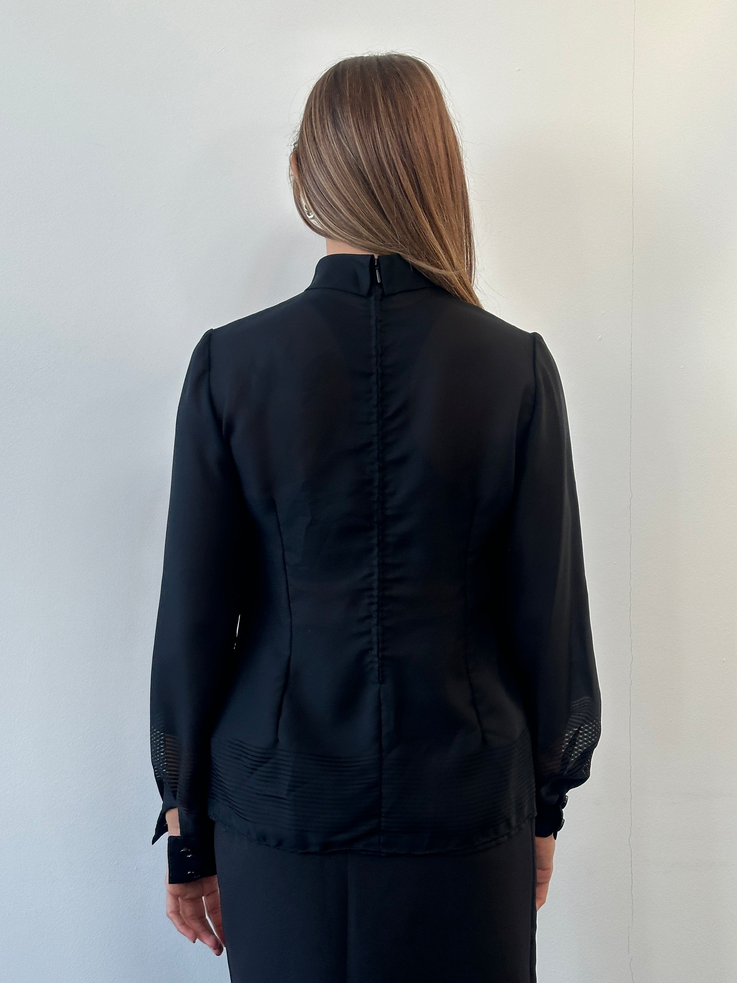 Vintage black sheer long sleeve top featuring a rolled collar, subtle stripe panels at the hem and sleeves and a minimal zip-back fastening. A clean lightweight 1990s piece with a contemporary feel.