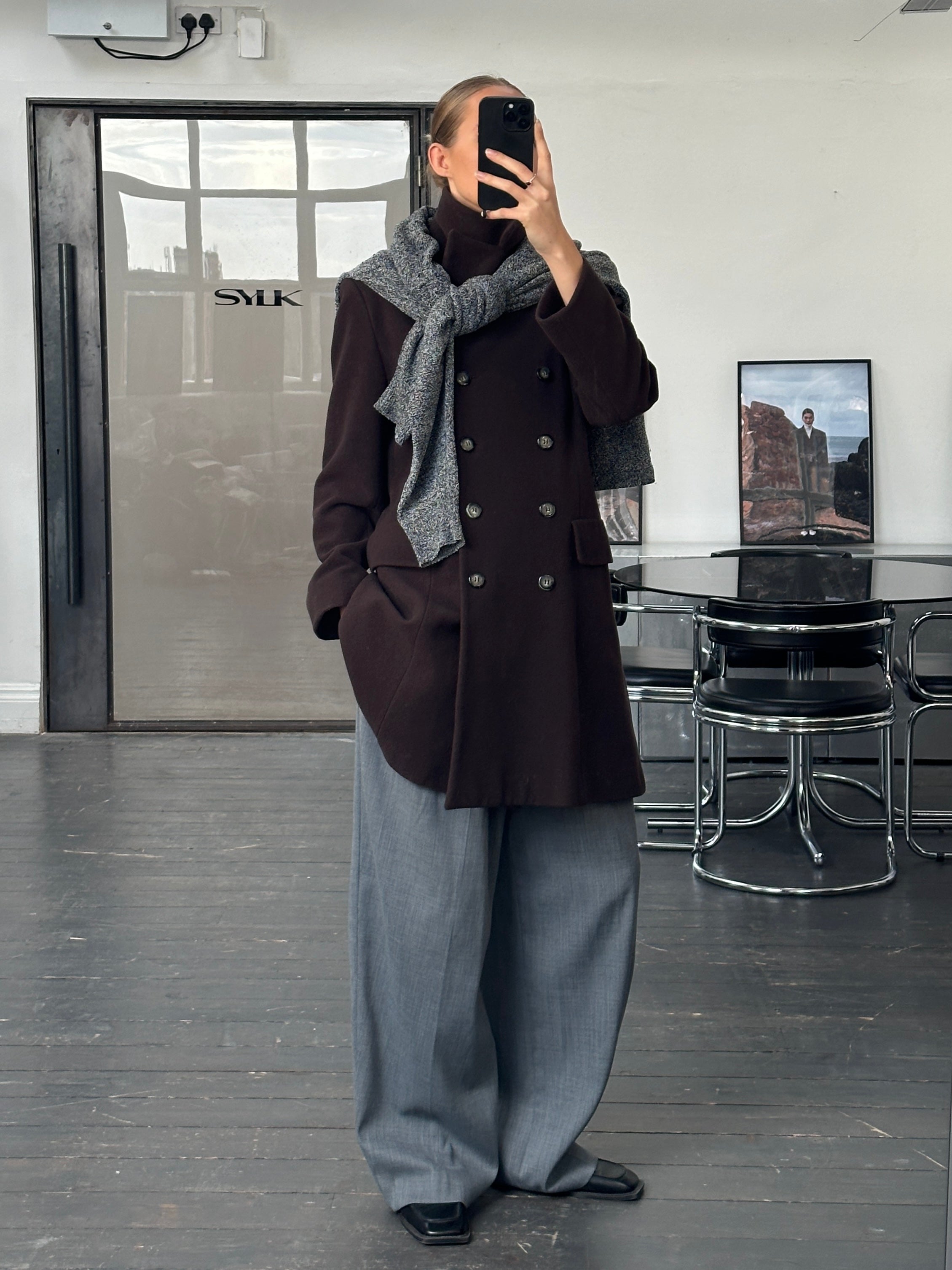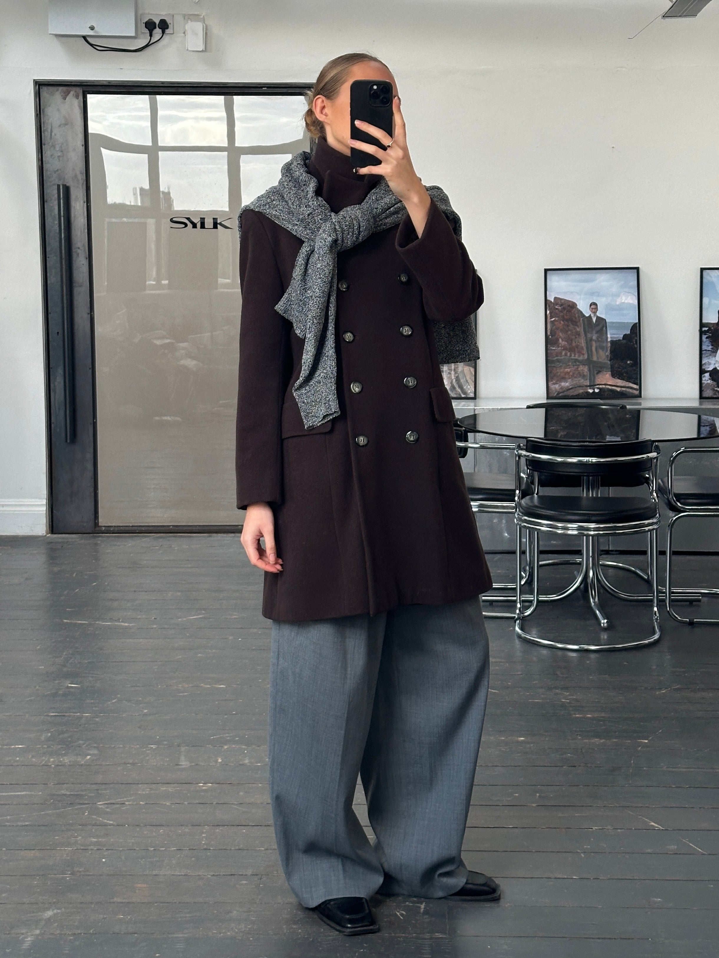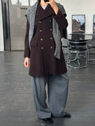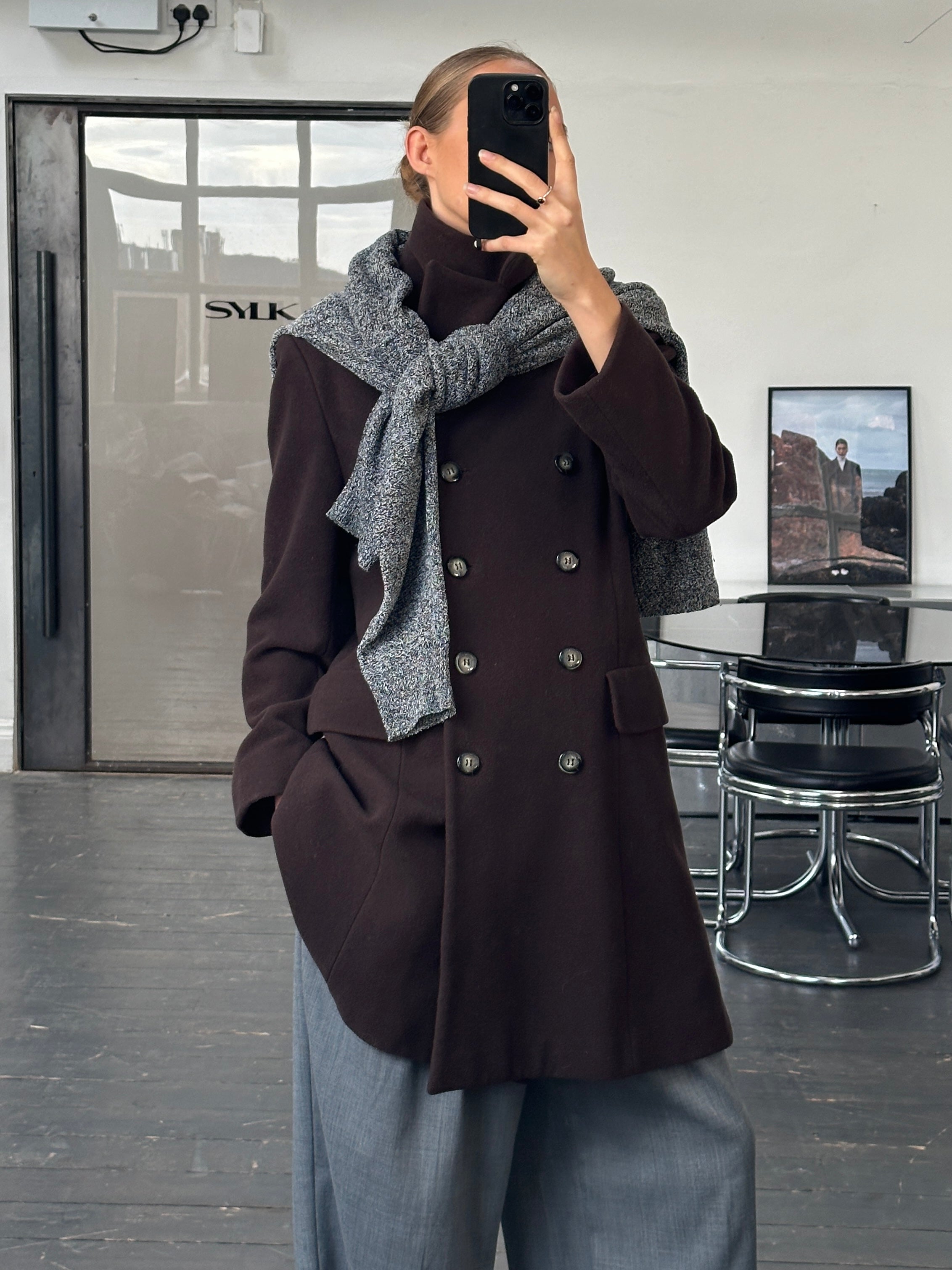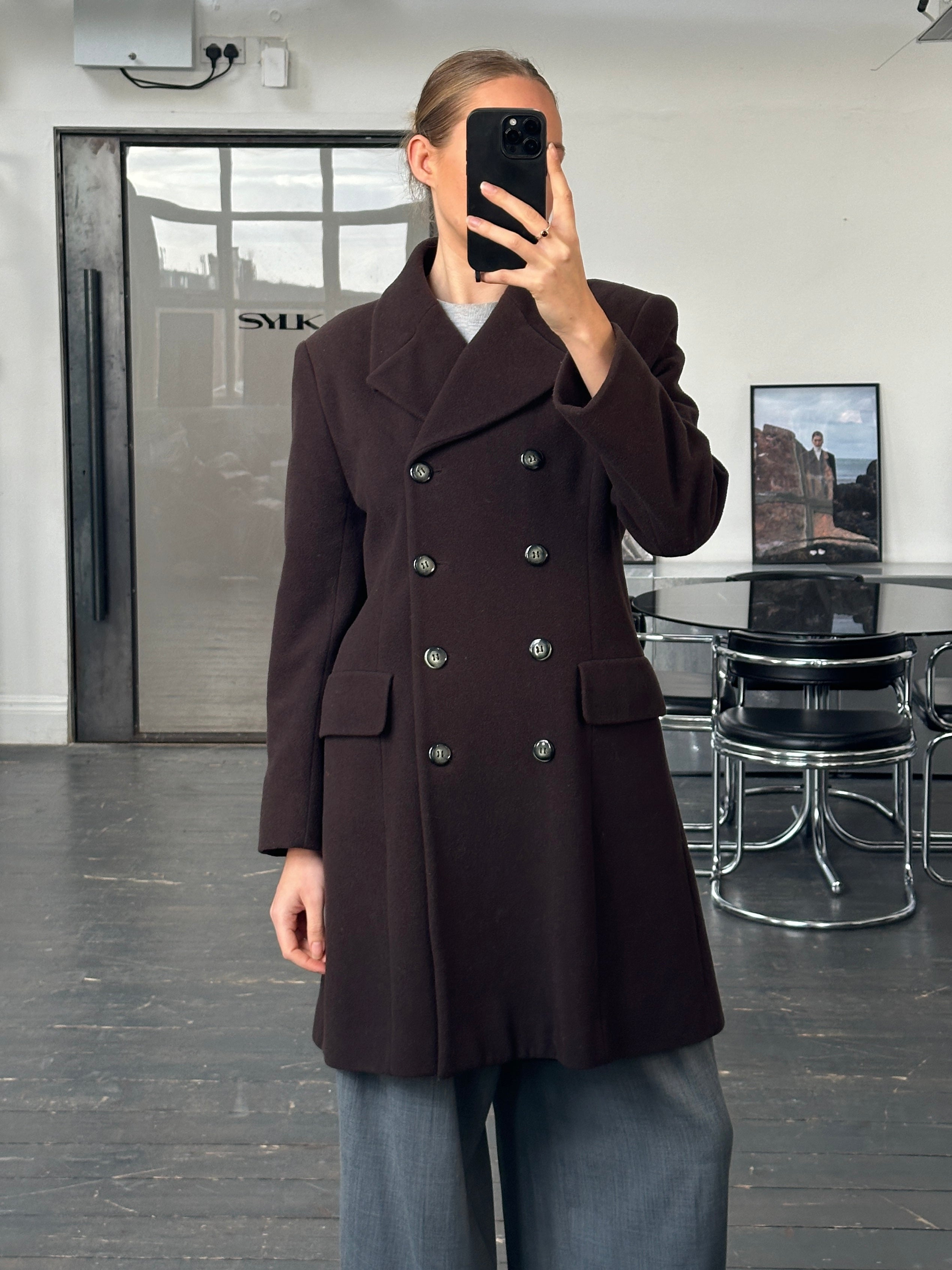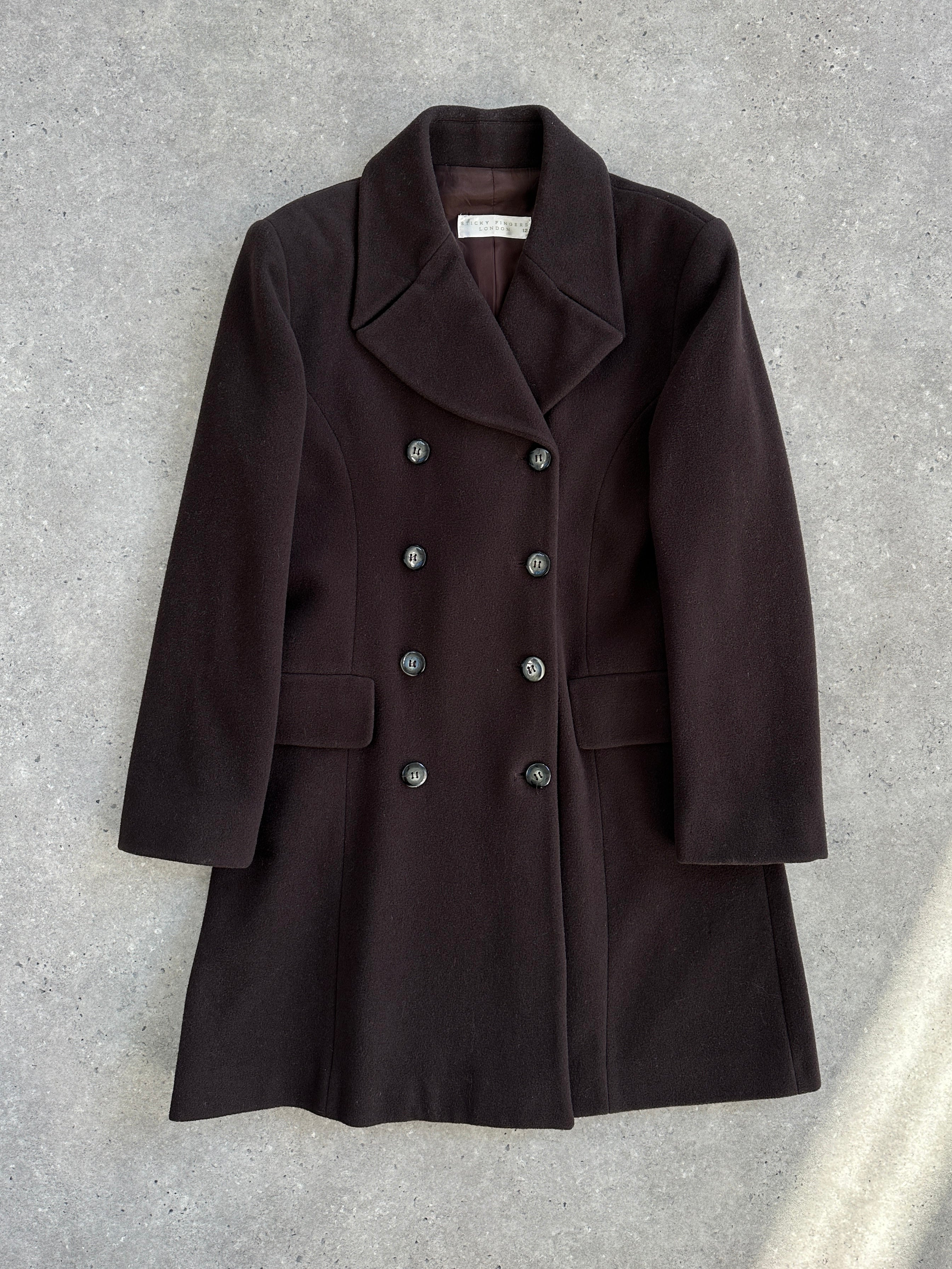 A vintage 1990s Sticky Fingers London double breasted coat in a deep brown tone. A clean structured silhouette with soft tailoring and quiet refinement.