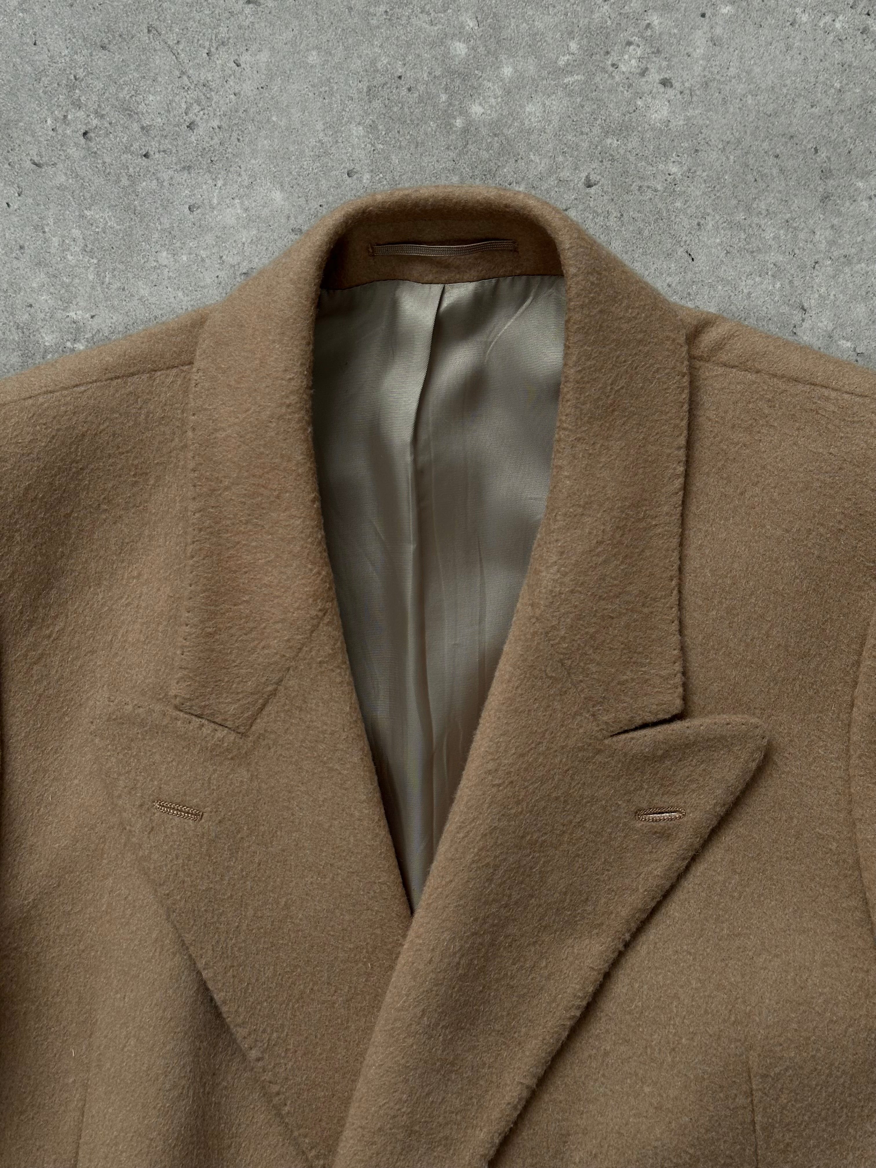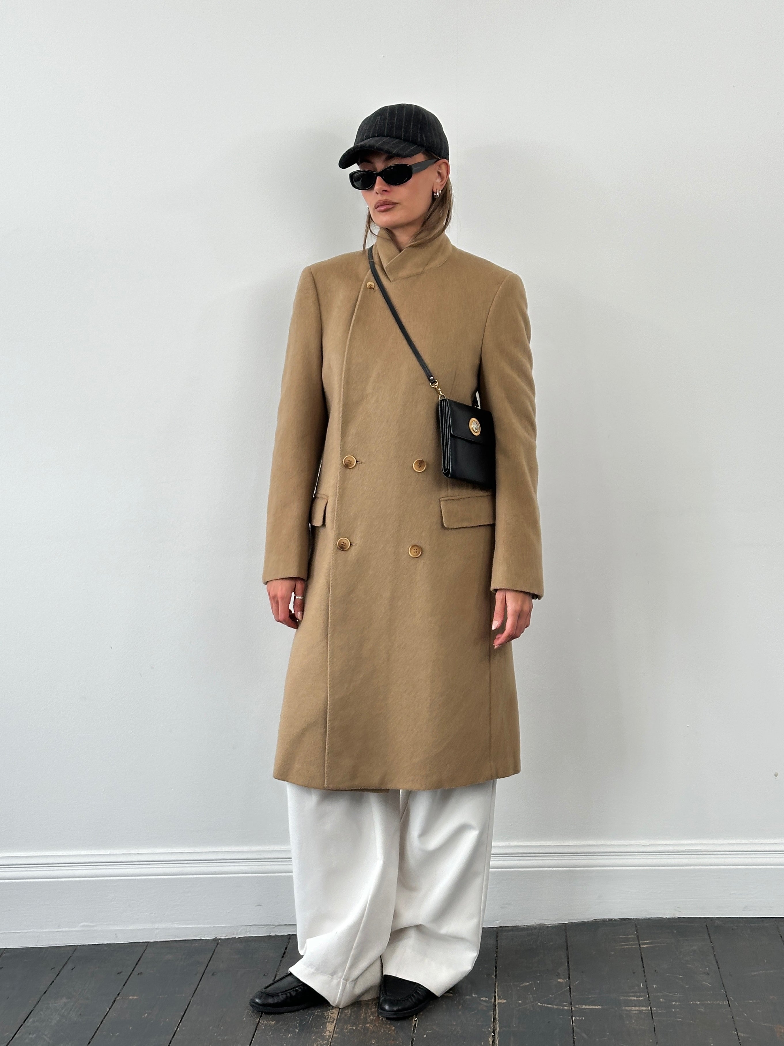 Vintage double breasted outerwear coat from the 1990s by Styliform with a brushed wool finish and high neck button fastening, finished in a soft beige tone with a clean tailored silhouette.