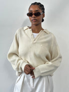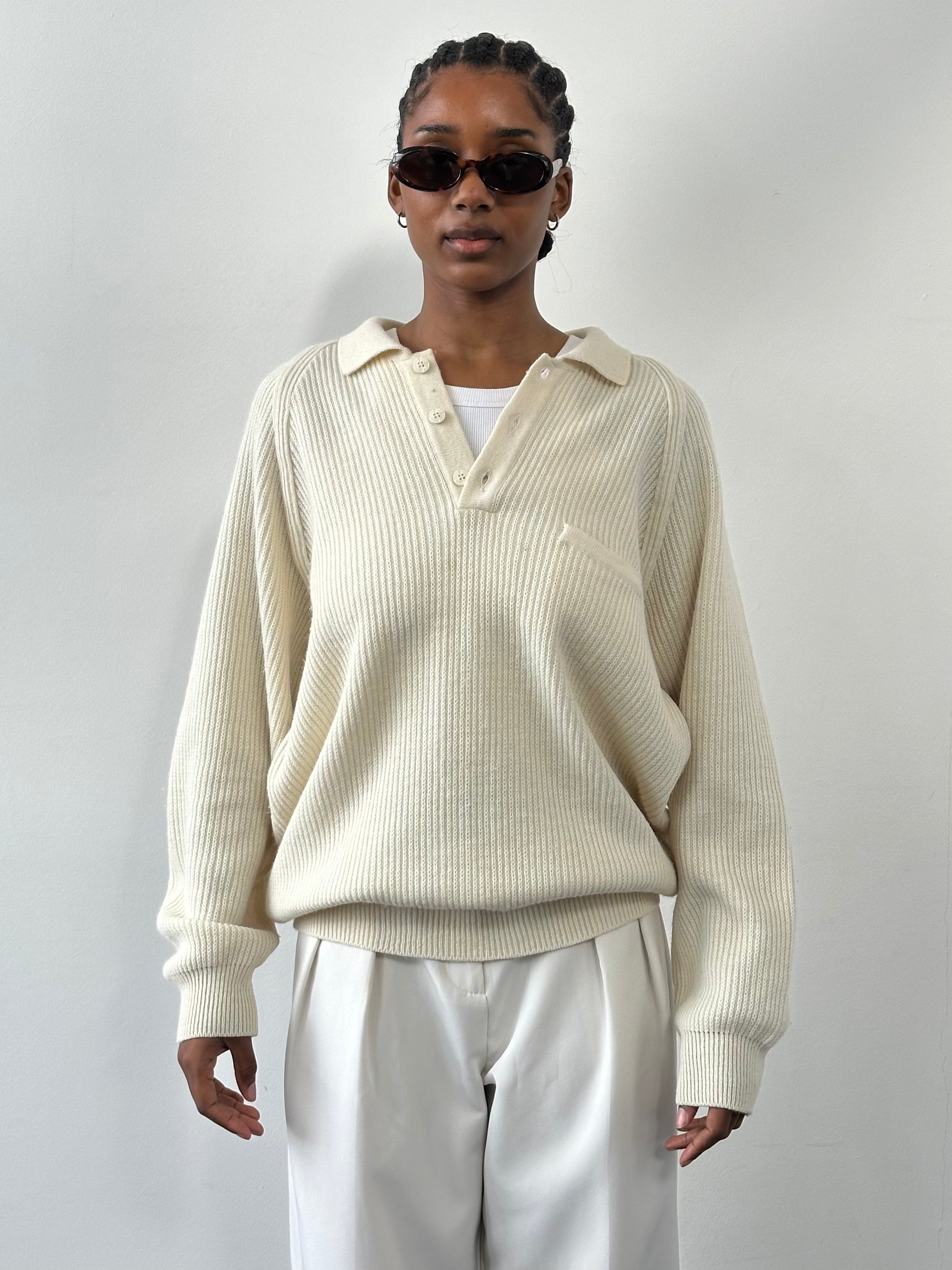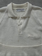 Marco Benelli 1990s vintage ribbed polo jumper in soft cream with a relaxed silhouette and three button placket. Designed with dropped shoulders, a single chest pocket and deep ribbed cuffs and hem for a structured yet effortless shape.