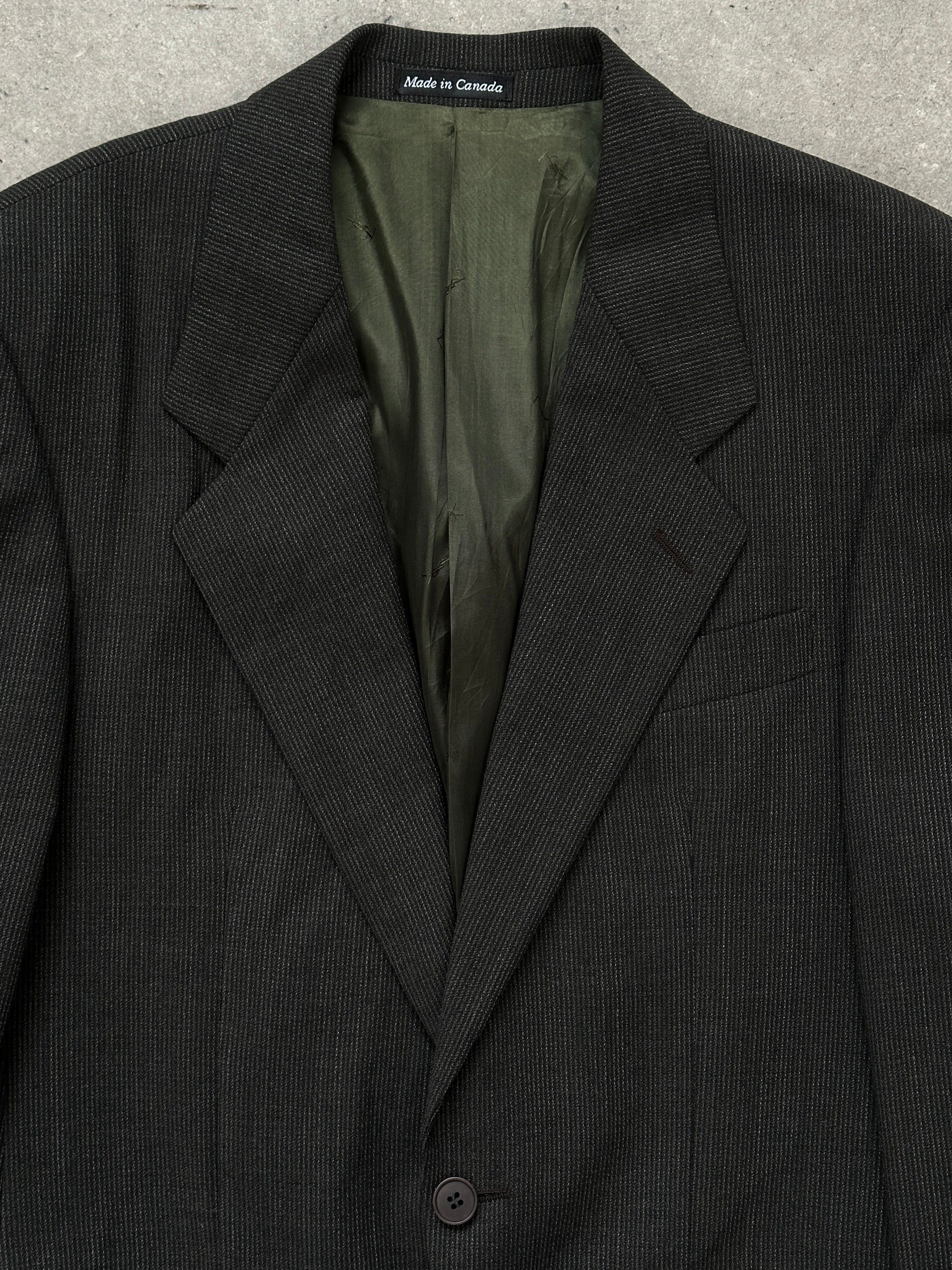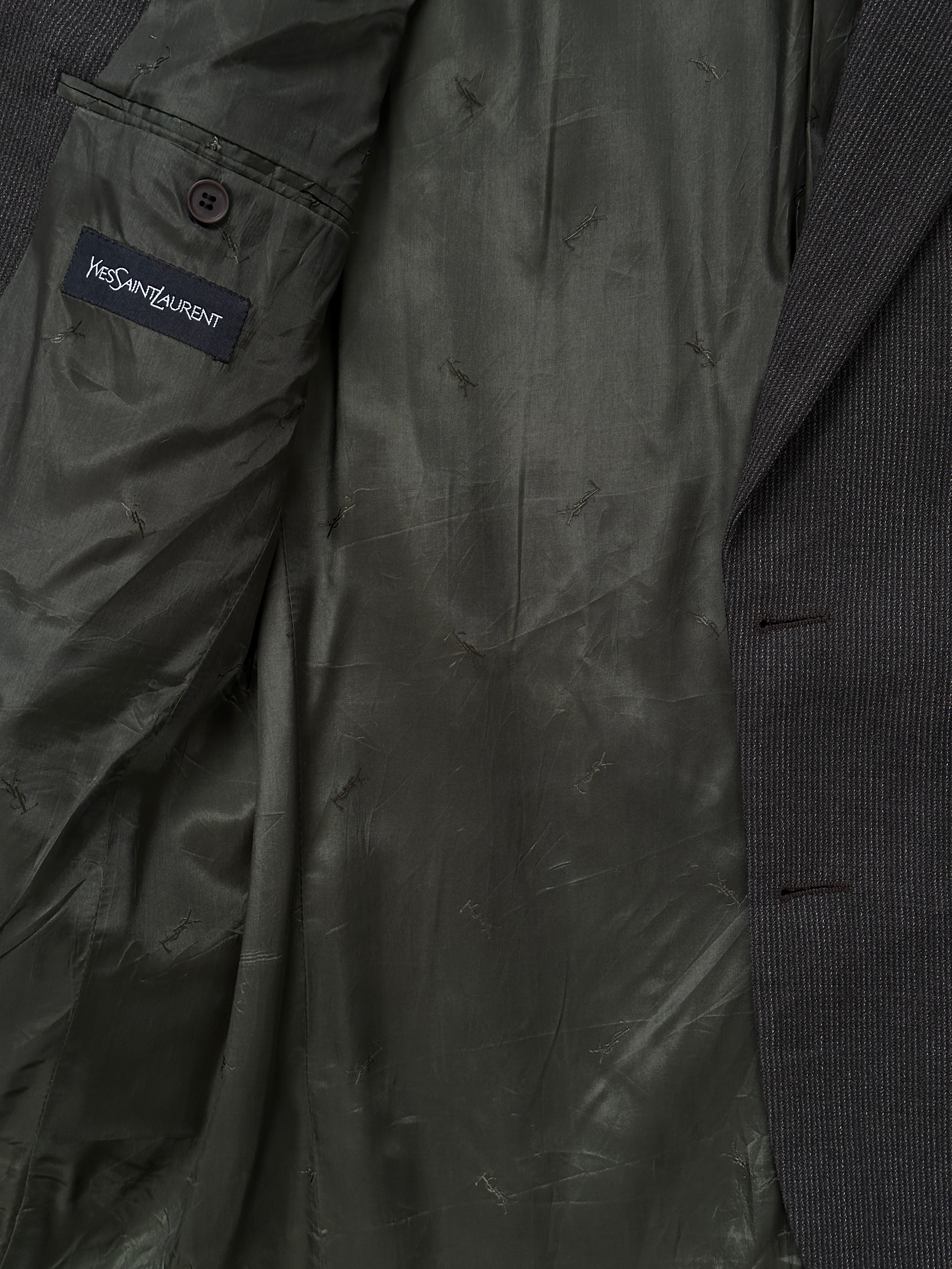 A refined Yves Saint Laurent blazer in deep green pure worsted wool, tailored in Canada for Dillard’s. Designed with a clean single-breasted silhouette, sharp notch lapels and subtle YSL monogram lining, offering a timeless formal profile with understated designer detailing.
