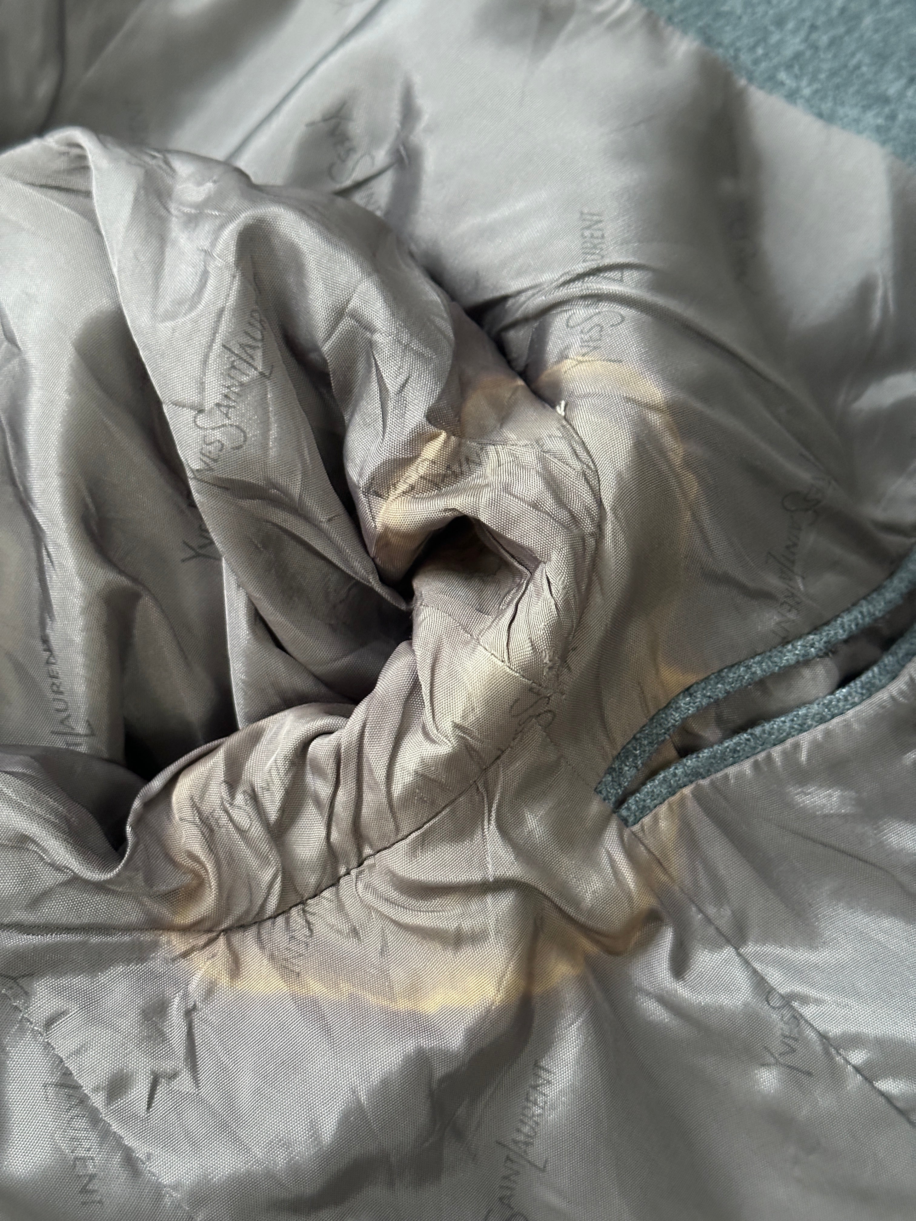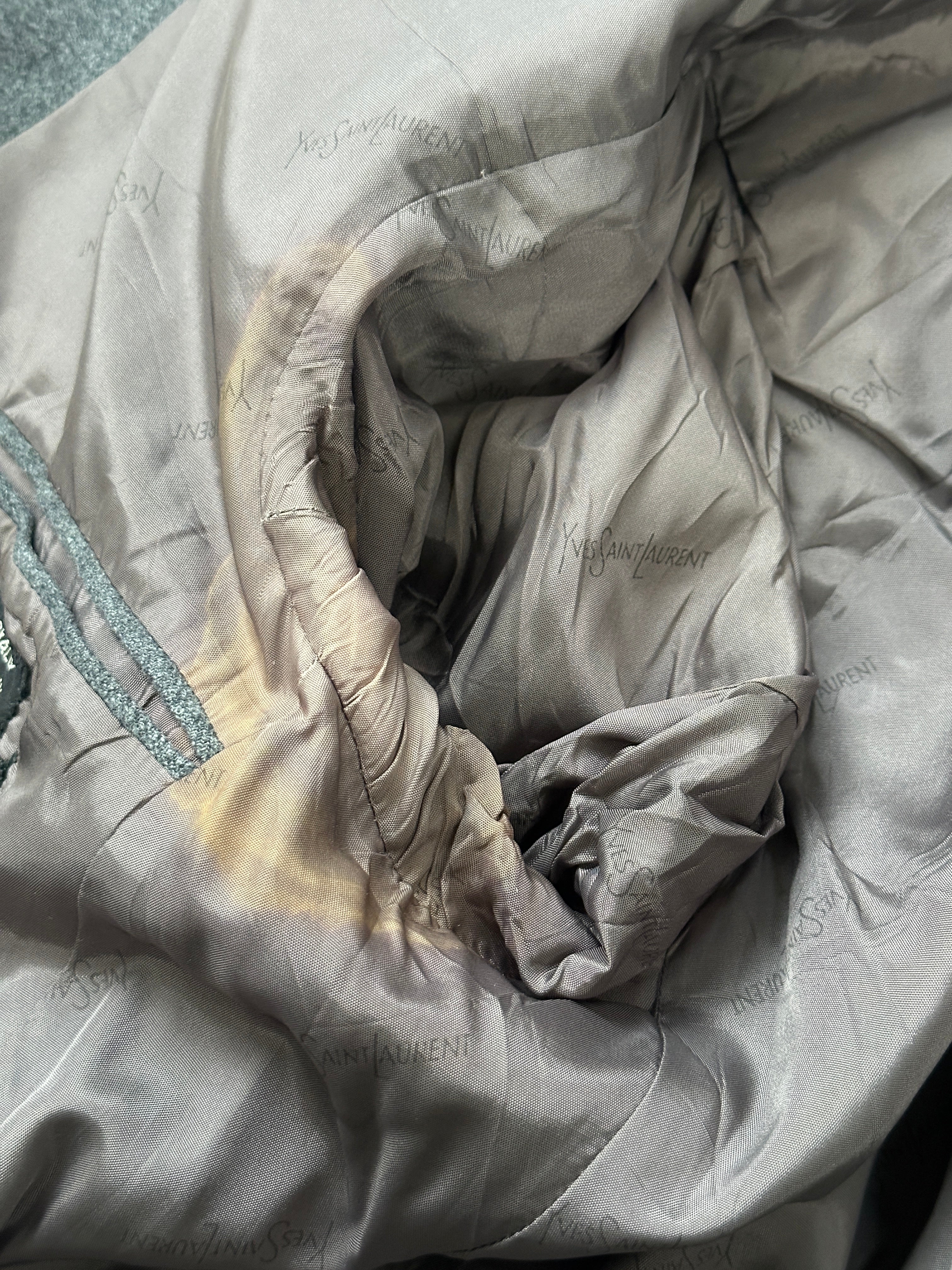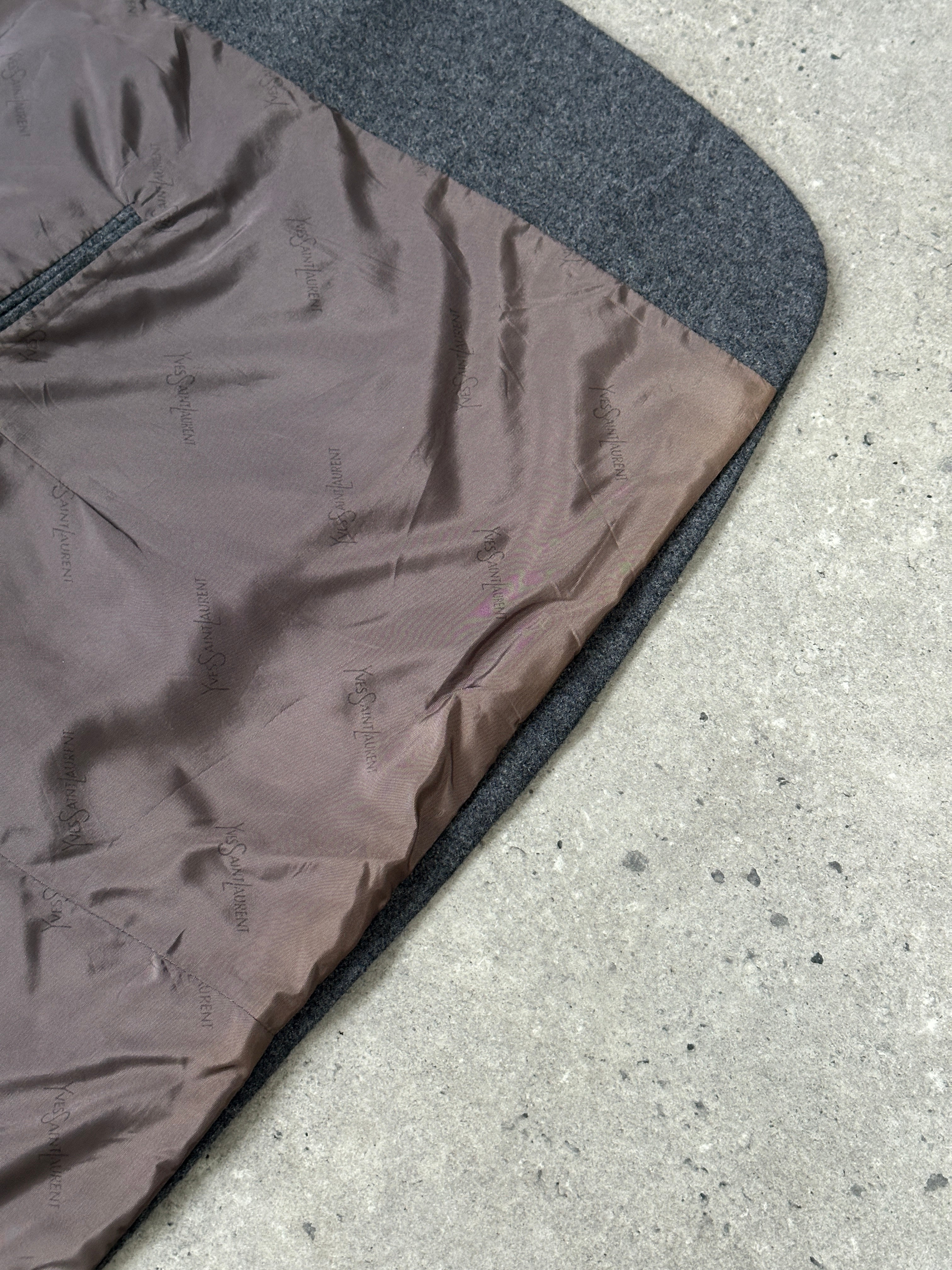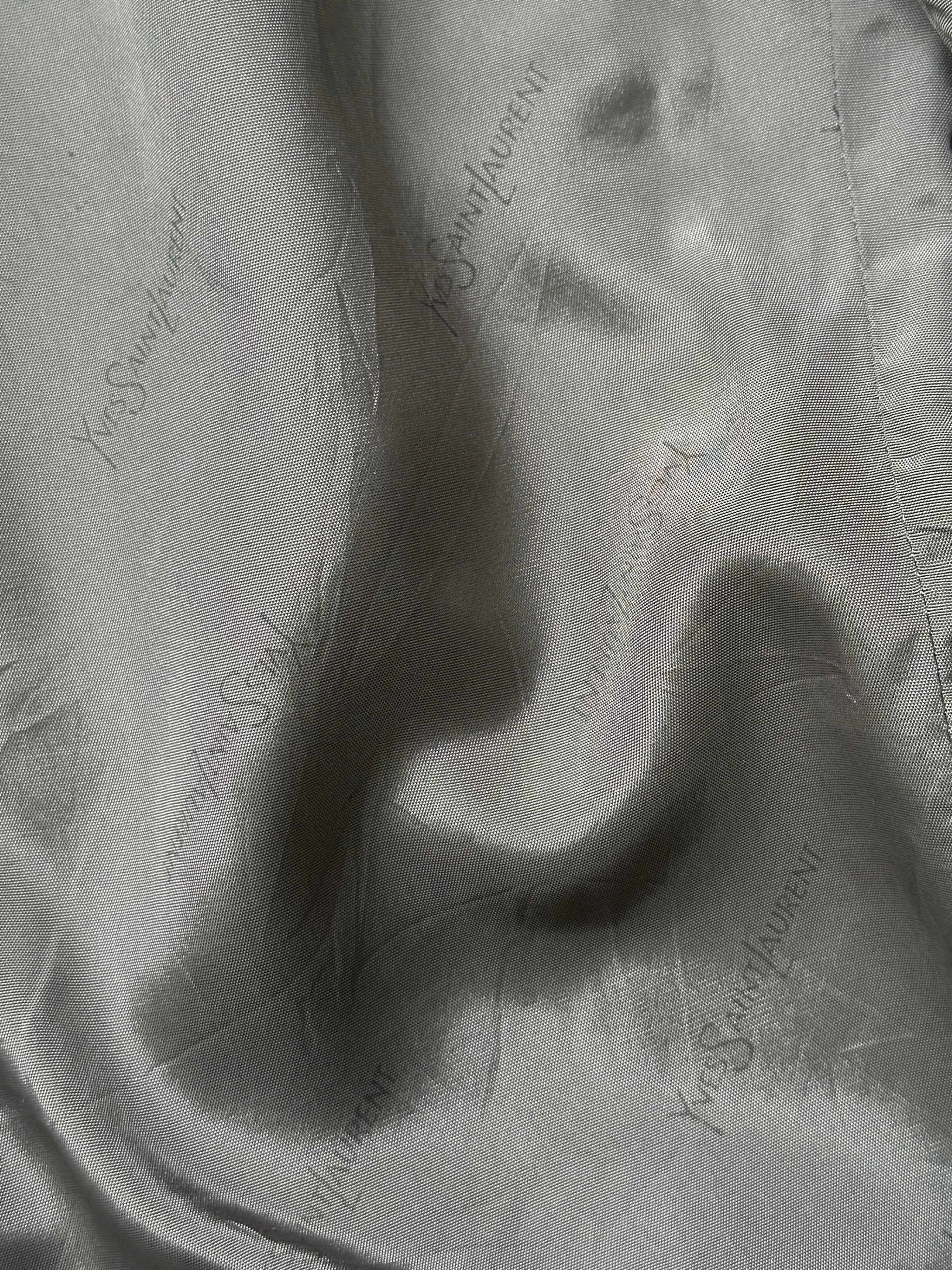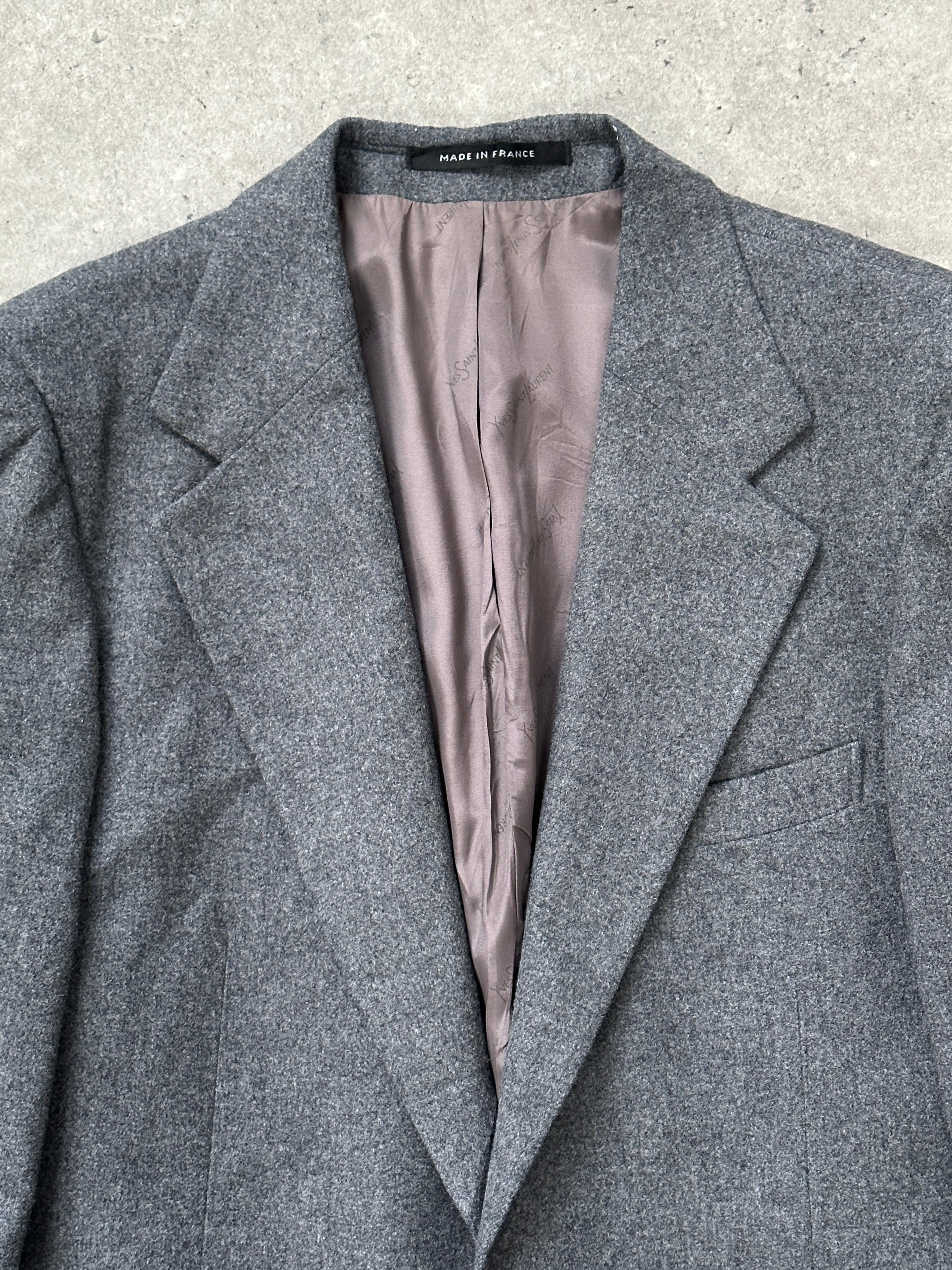 Yves Saint Laurent single breasted two button blazer with brushed wool outer and YSL logo jacquard lining. Clean structured silhouette typical of the 1990s.