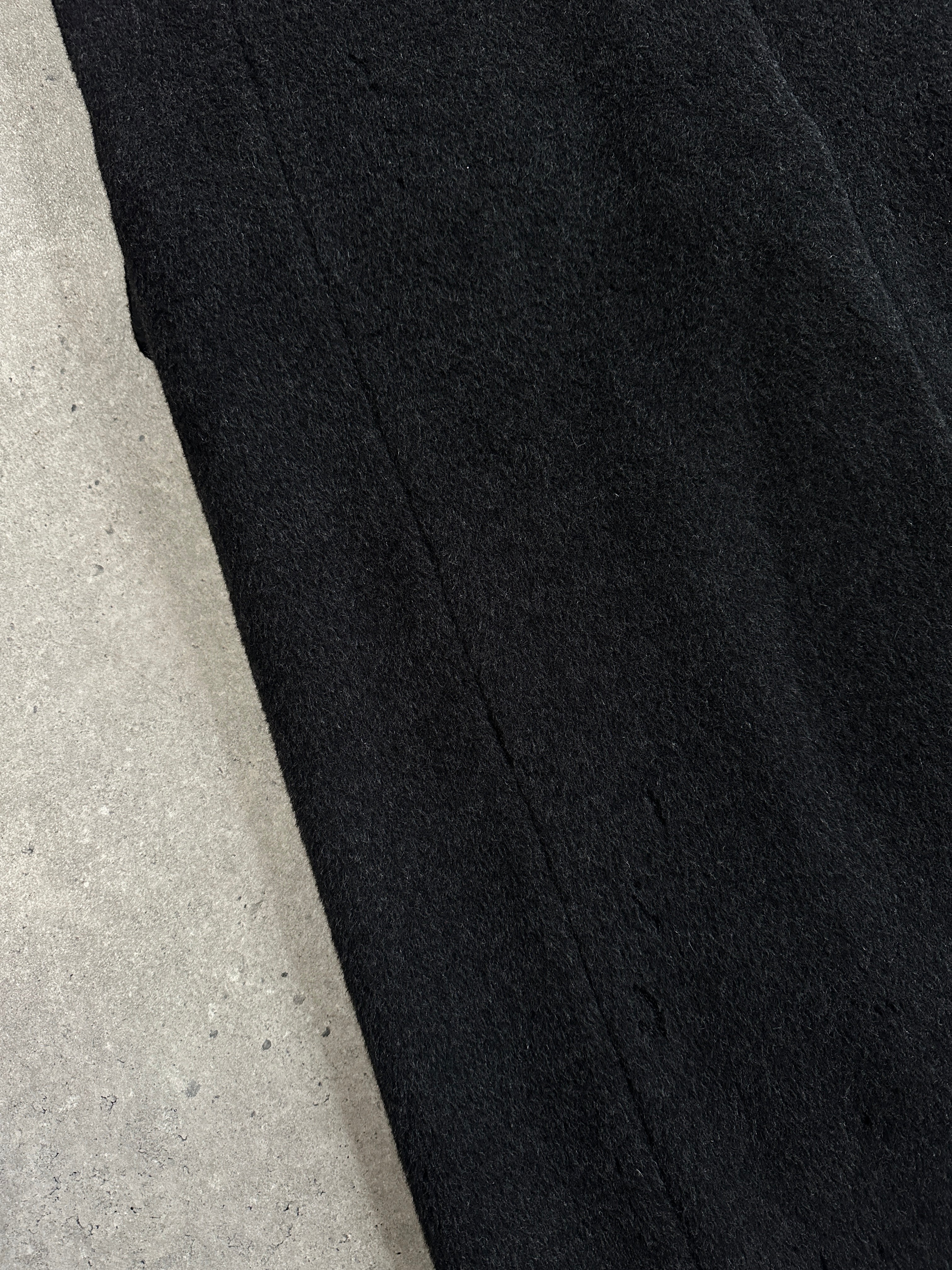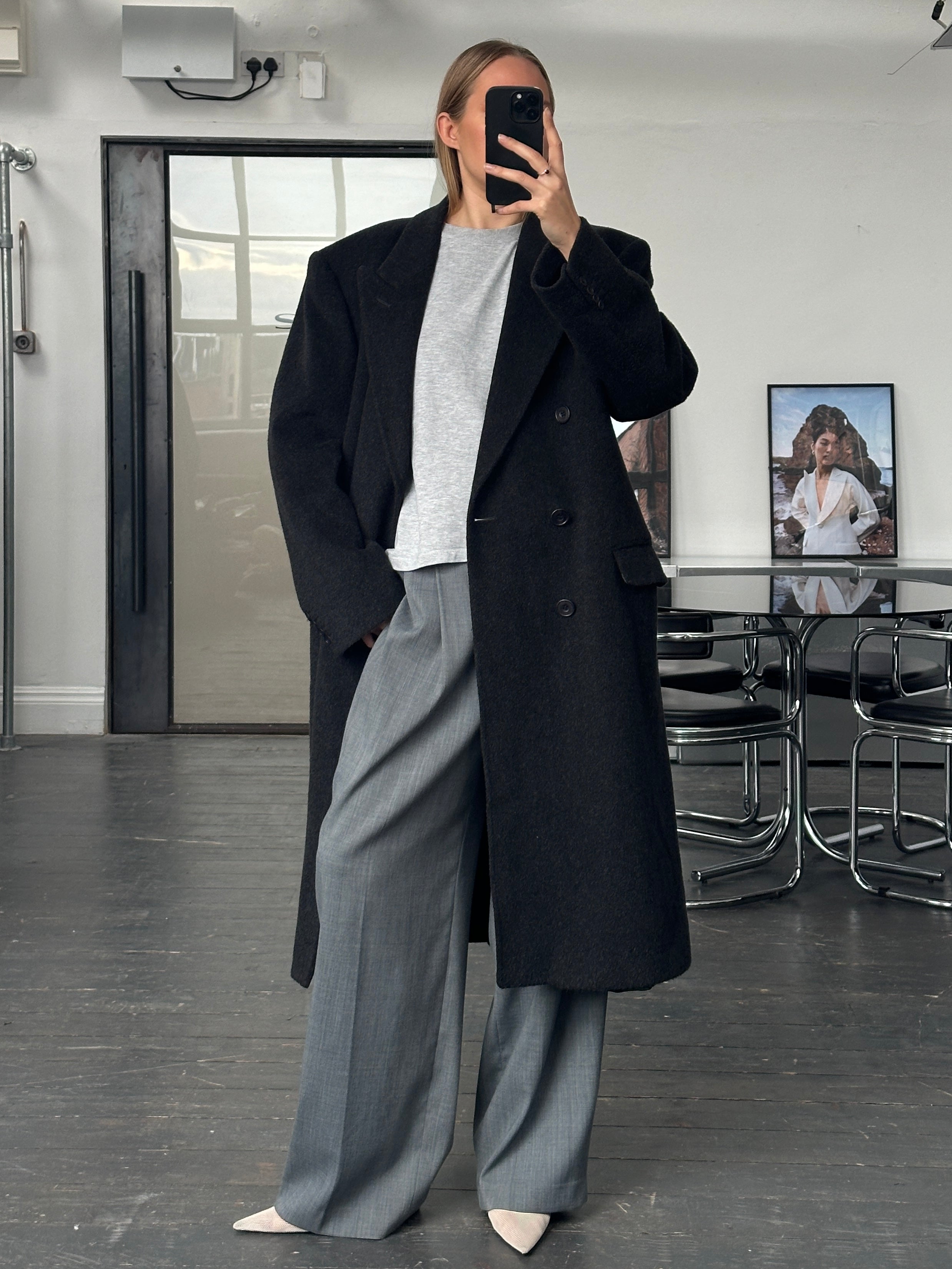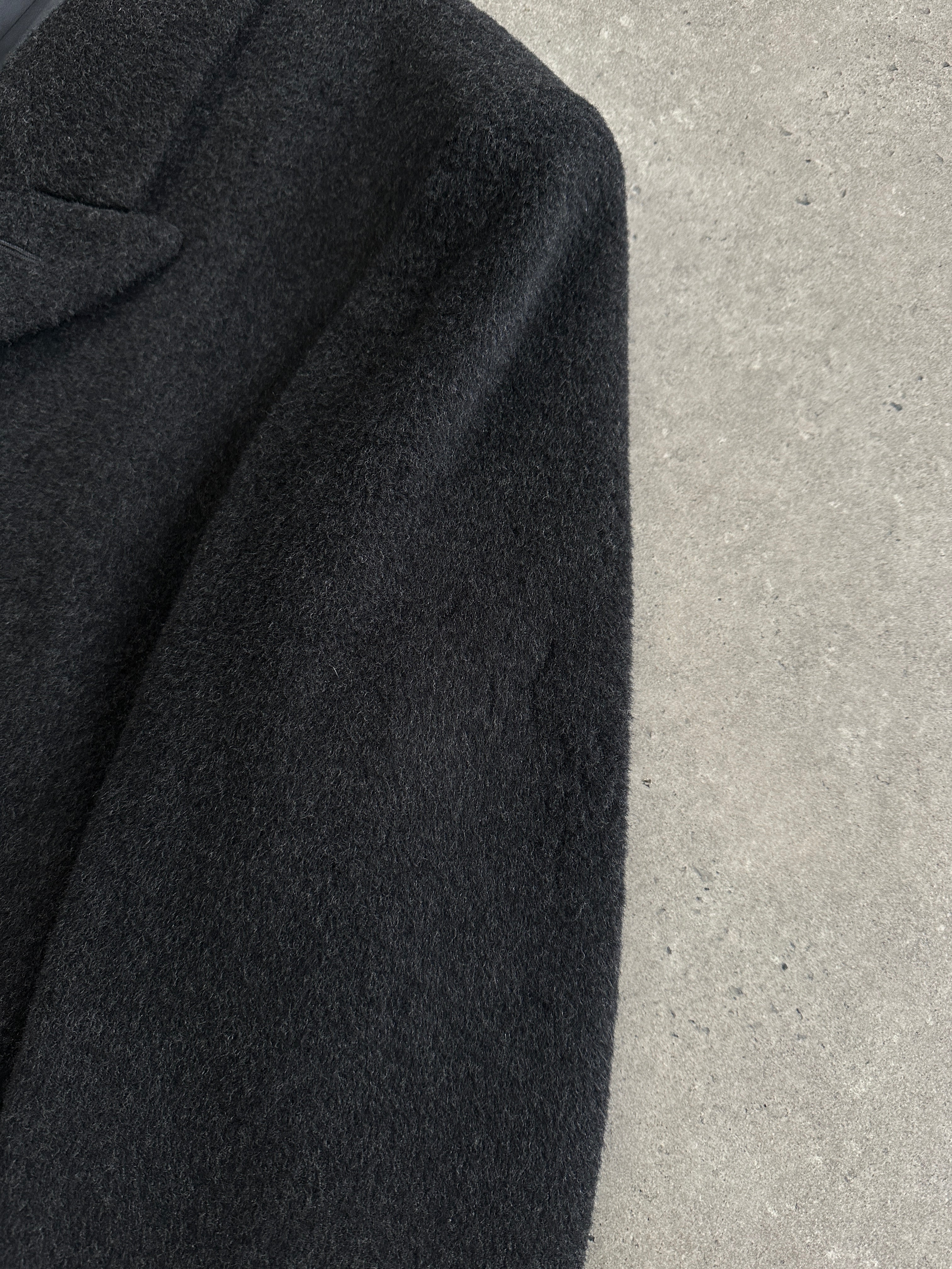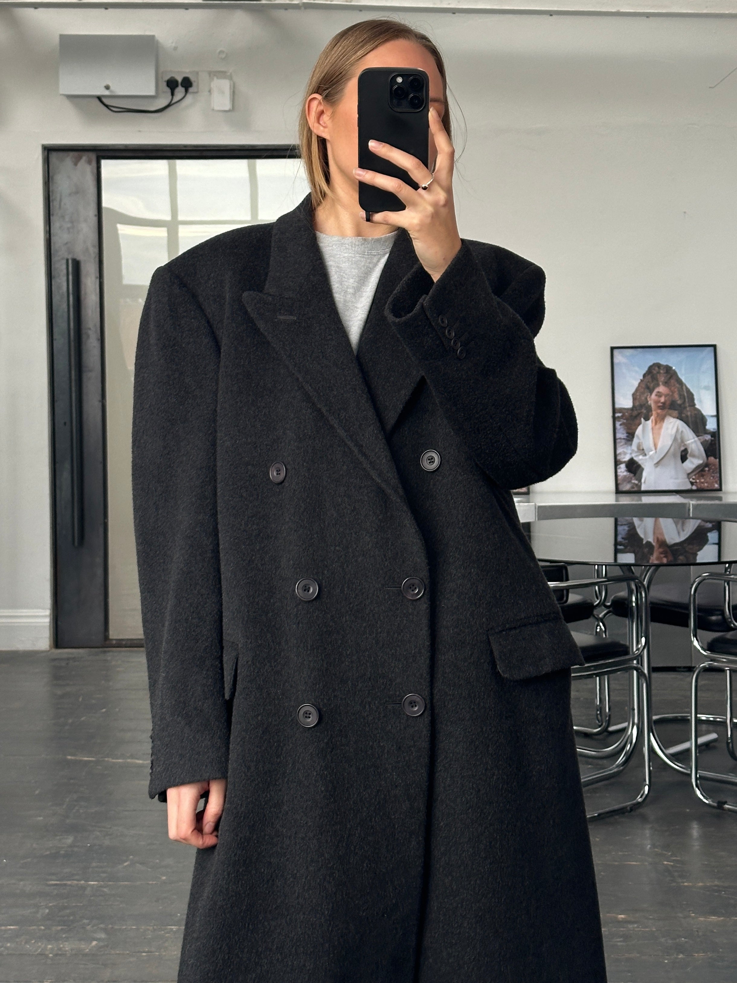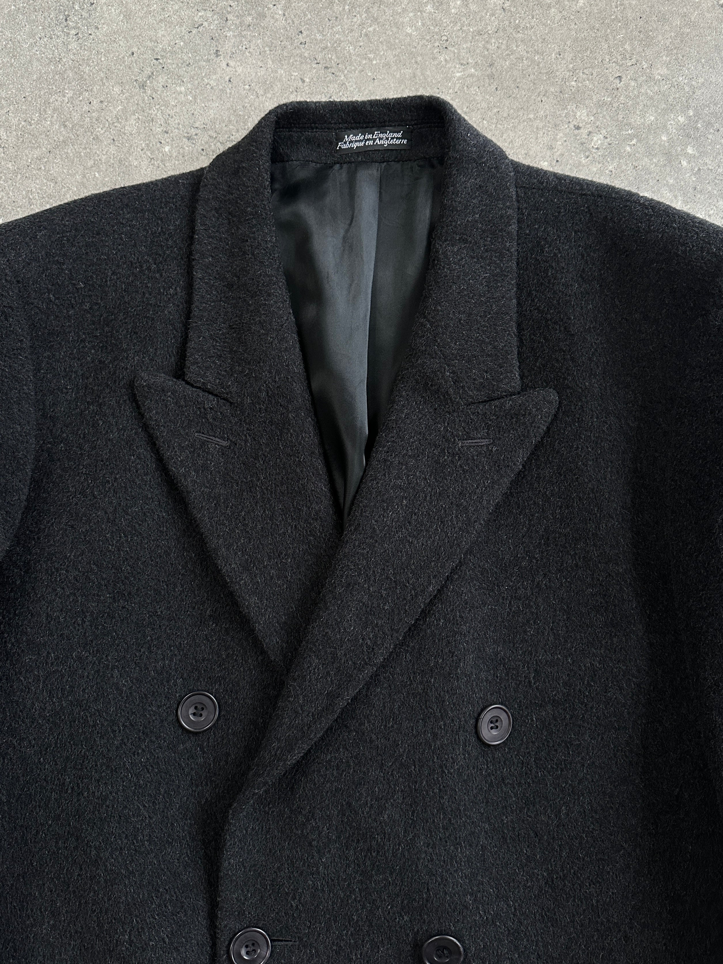 Vintage English 1990s charcoal grey double breasted wool cashmere coat by Alexandre of England, cut in a structured minimal silhouette with sharp lapels and a clean tailored drape. A refined 1990s piece with a classic British-made finish.