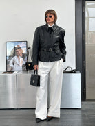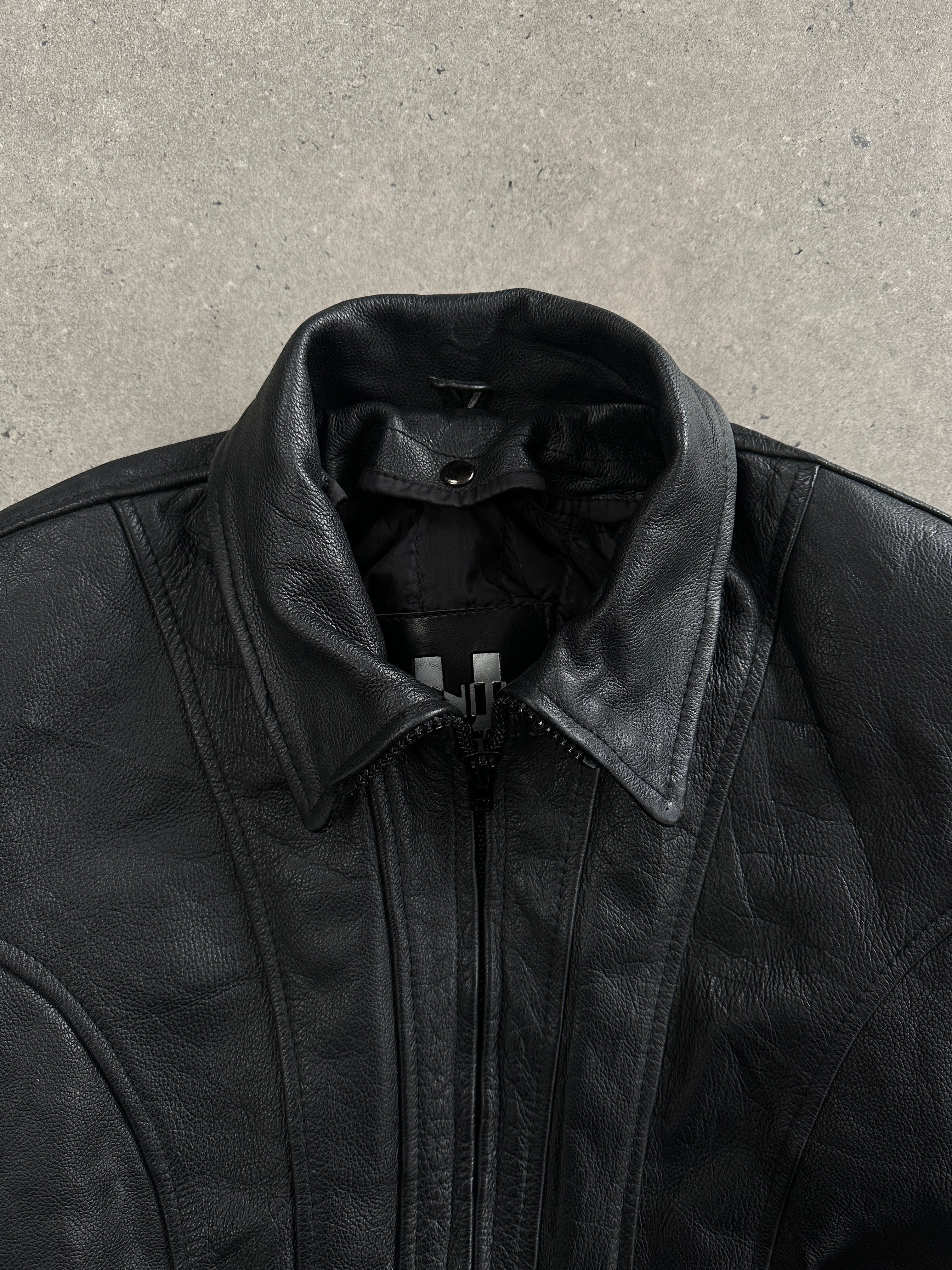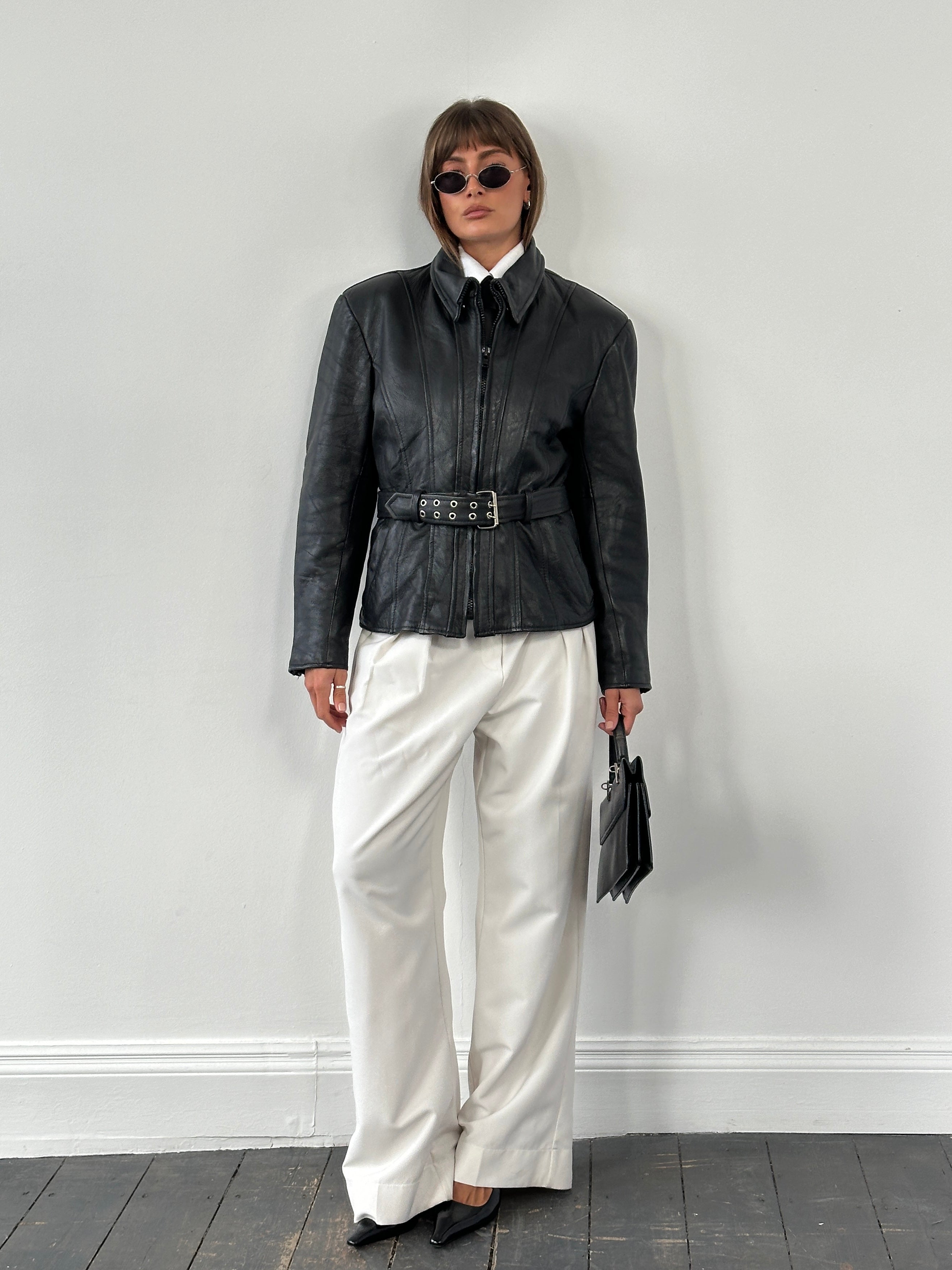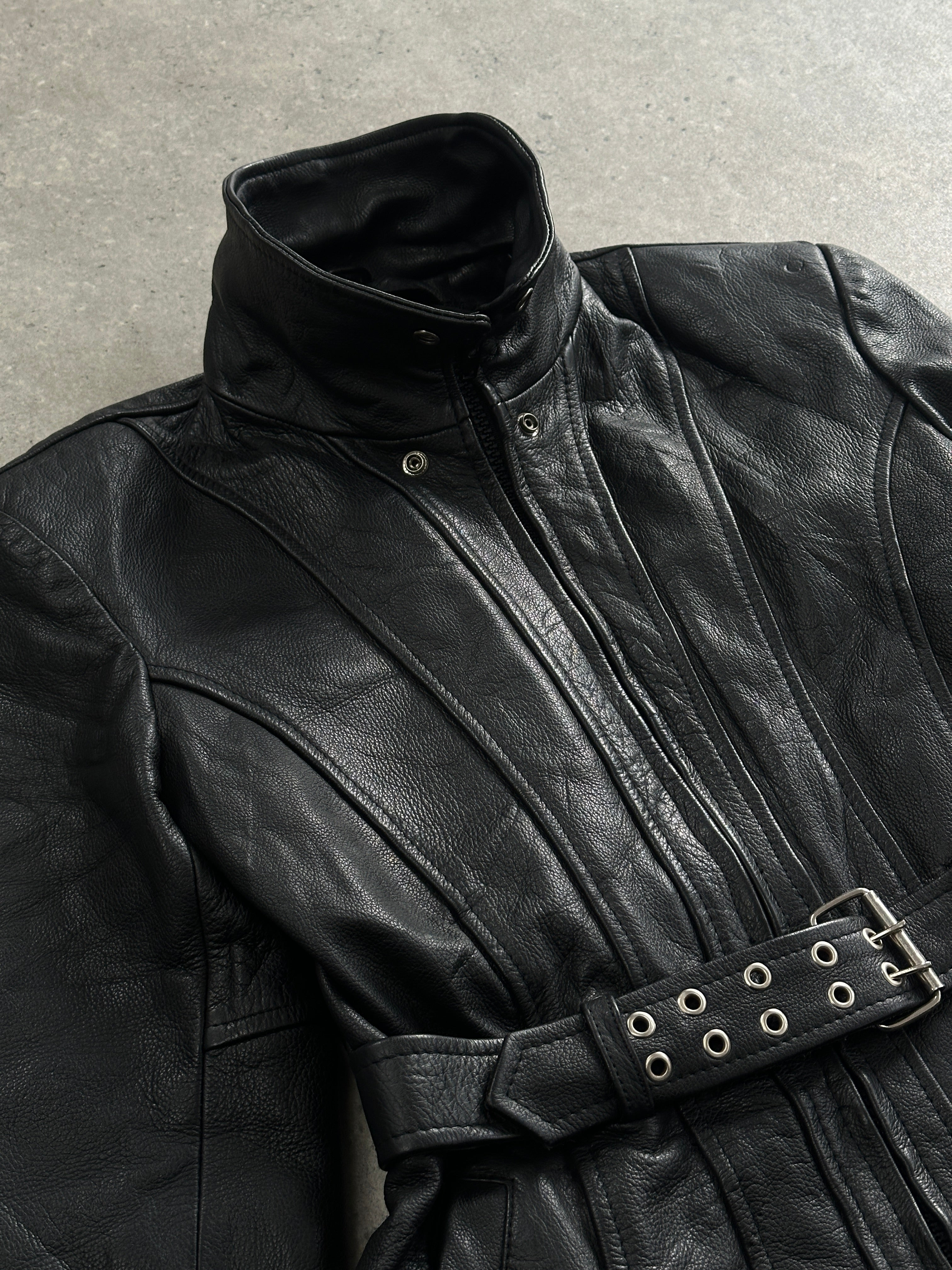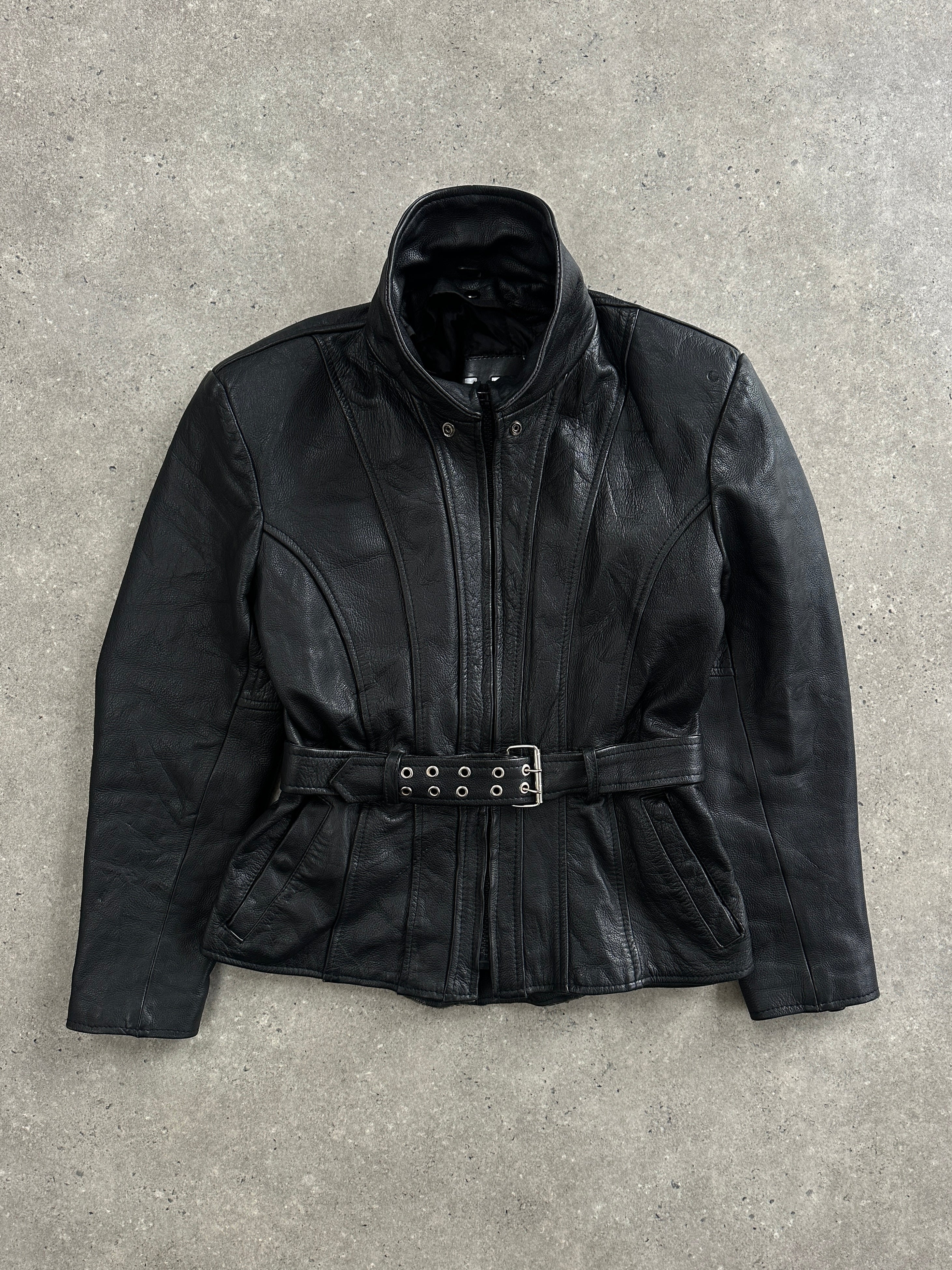 Vintage 1990s black leather moto jacket featuring a structured waist with an adjustable belt and elasticated back for a cinched silhouette. Detailed with zip-up high neck and a lightweight removable lining for adaptable wear.
