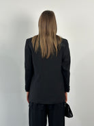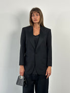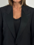 A vintage 1980s Christian Dior Monsieur Paris tuxedo blazer in a deep black tone. A sharp single button silhouette with a large peaked satin lapel that carries a refined formal presence.
