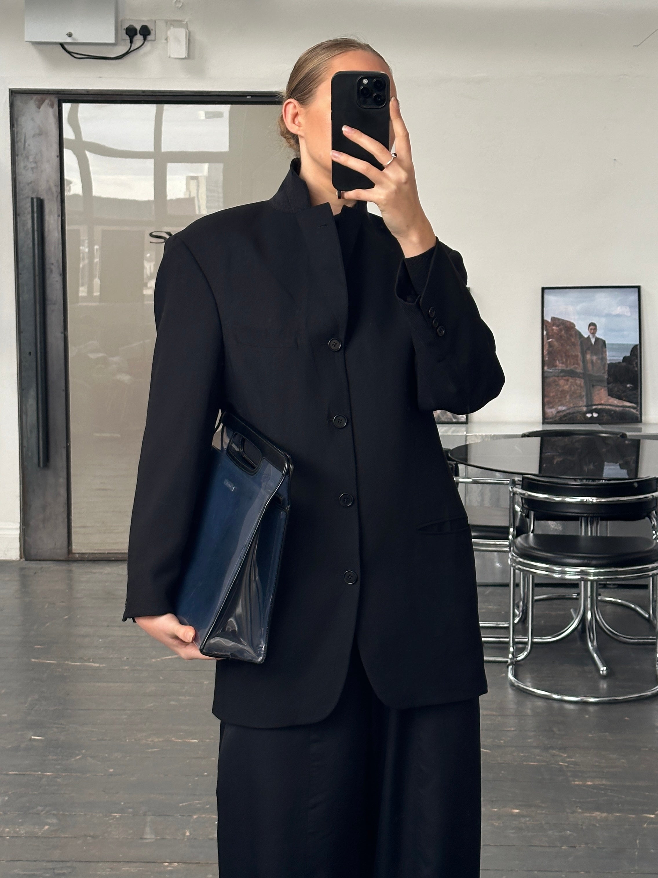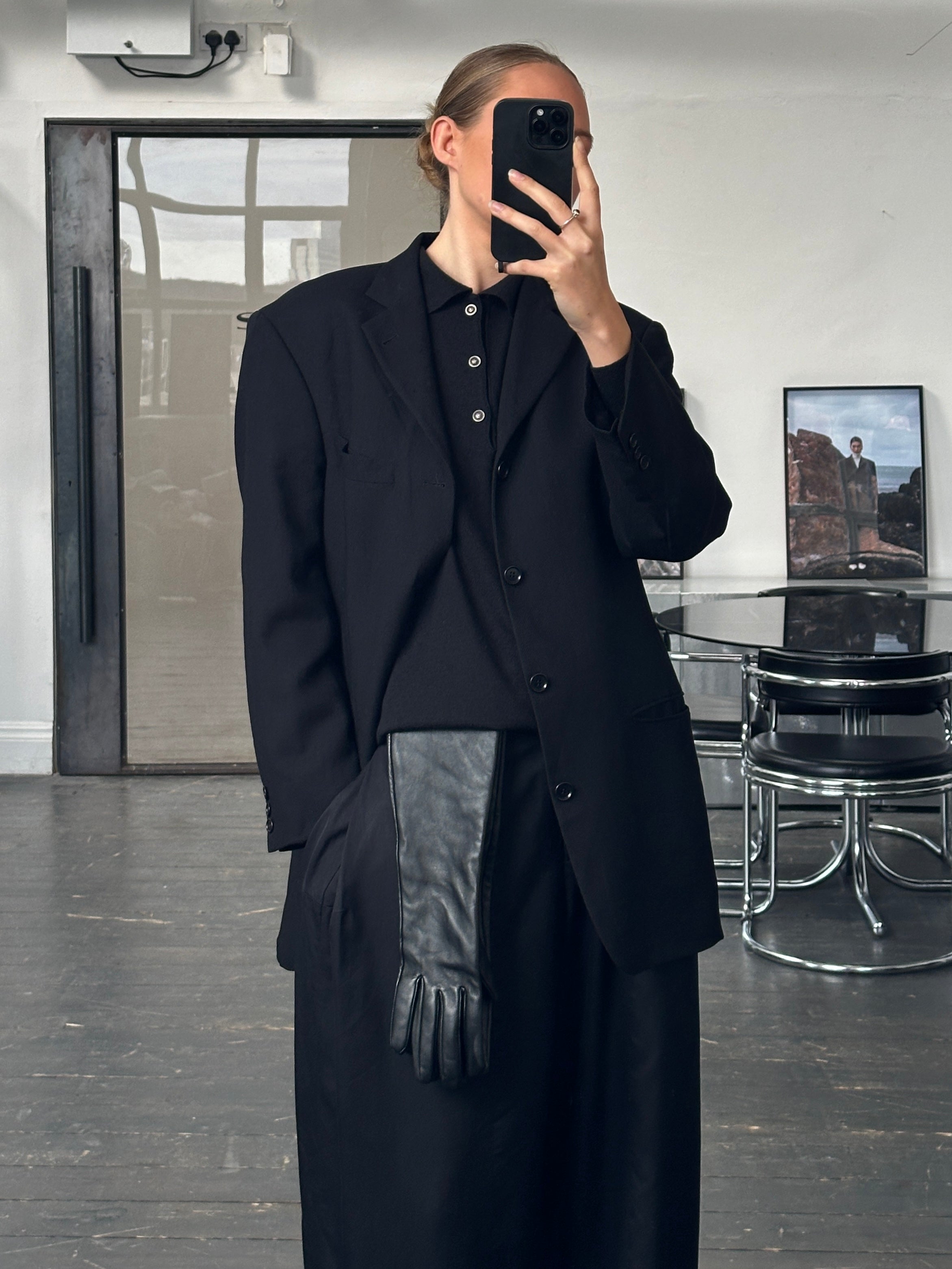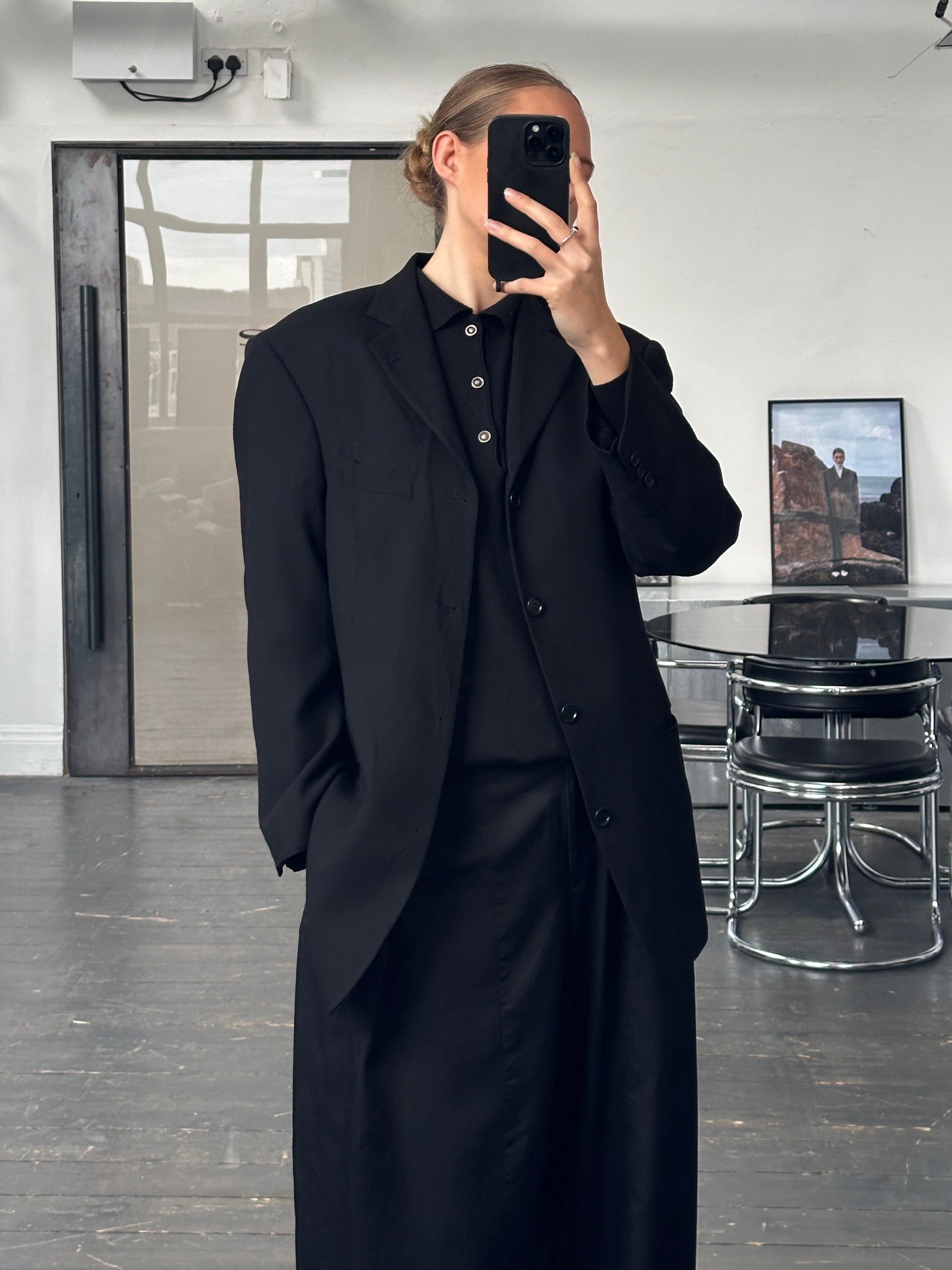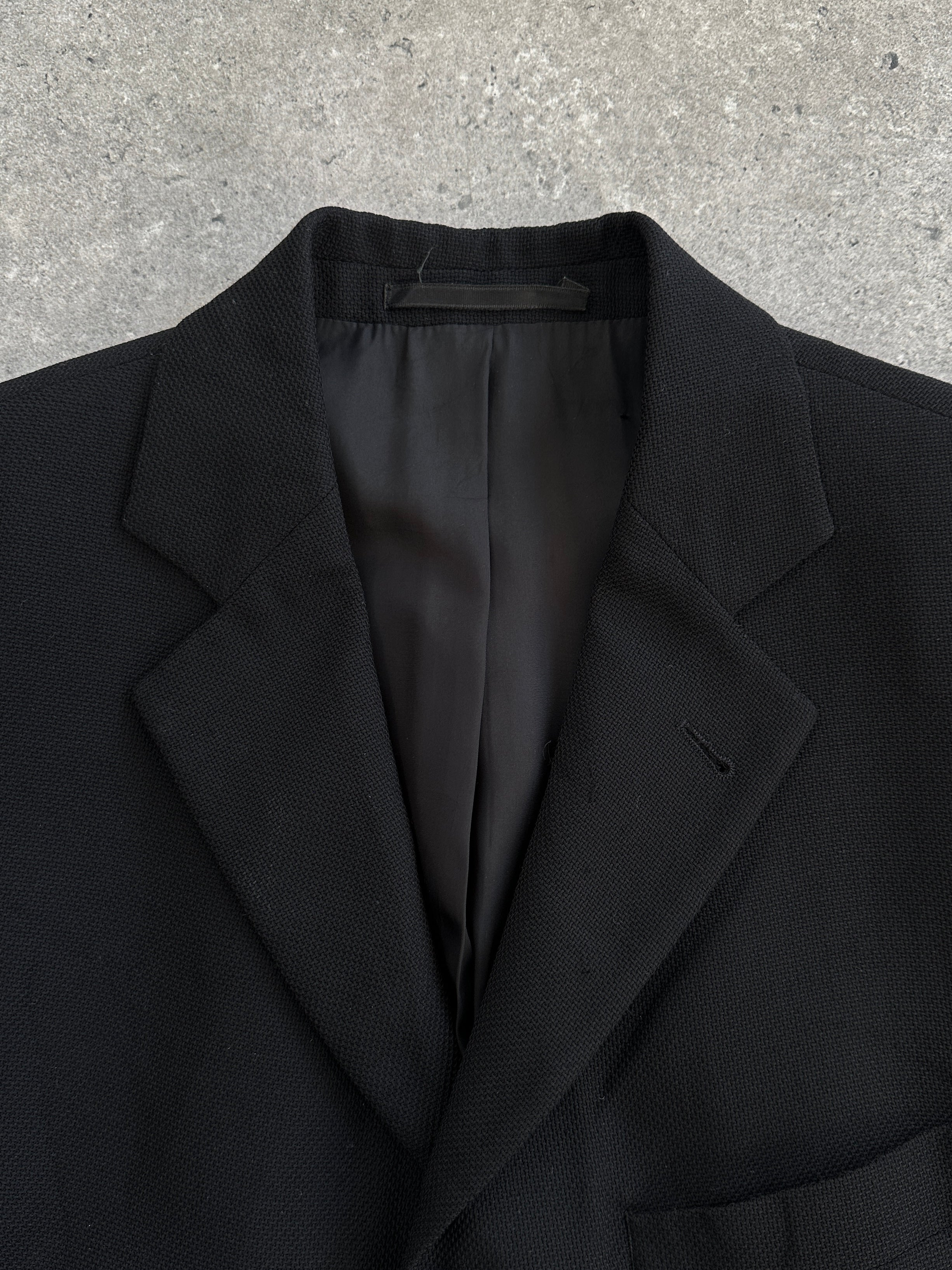 A vintage 1990s Hugo Boss single breasted blazer in a deep black tone, cut from pure wool using Loro Piana Super 110s Twister fabric. A structured tailored silhouette with a refined quiet luxury feel.