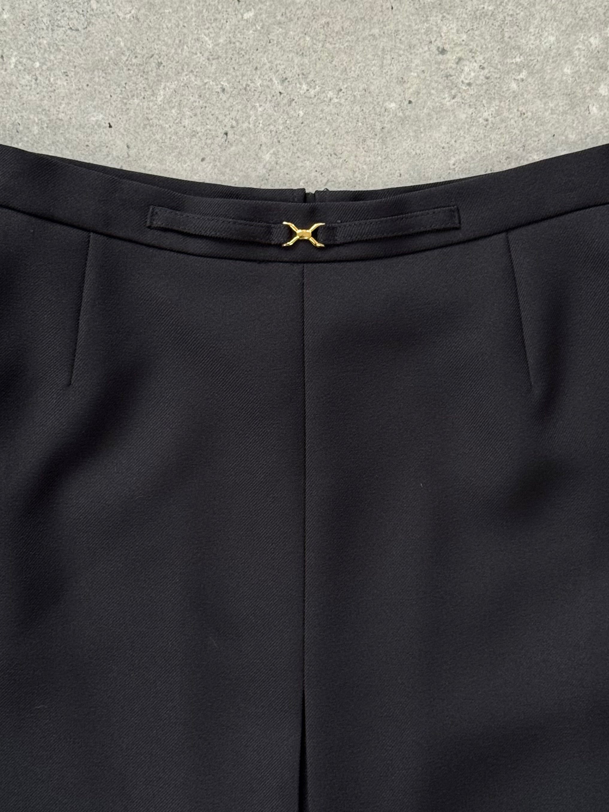 Vintage black skirt with a clean A line silhouette and structured split front panel for subtle movement. Finished with minimal gold hardware at the waistband, the fabric has a smooth tailored handle typical of refined 1990s minimalist dressing.