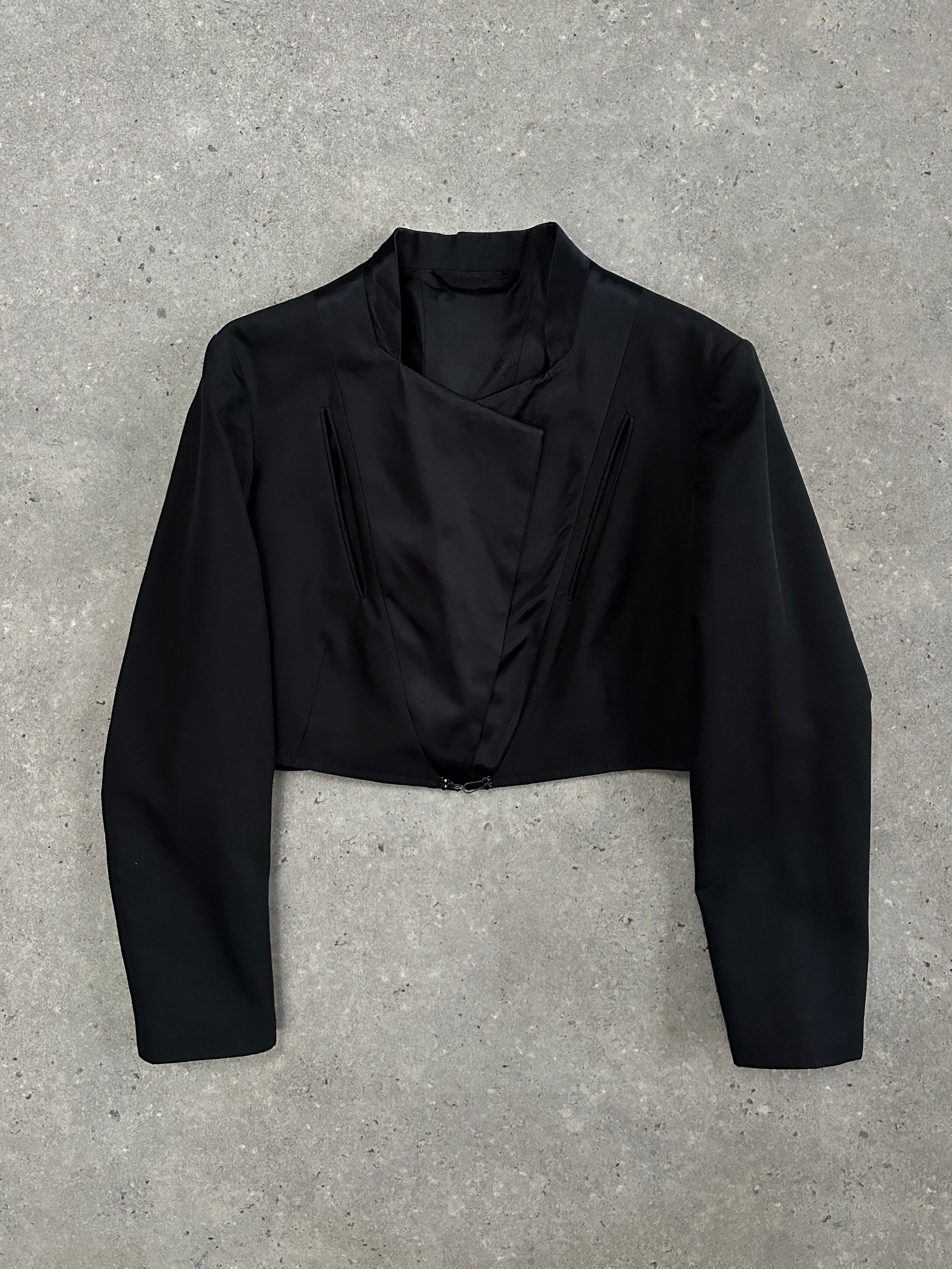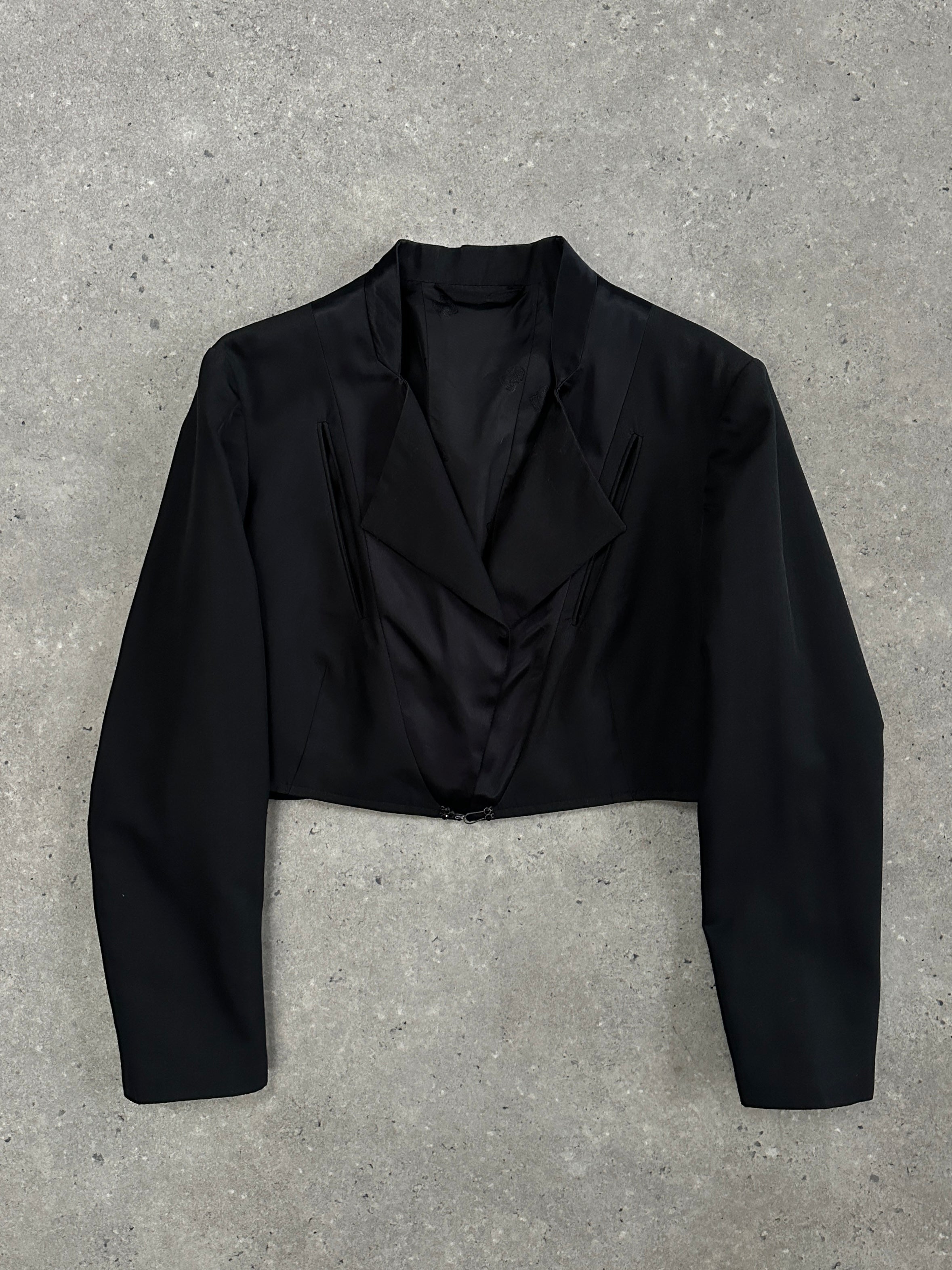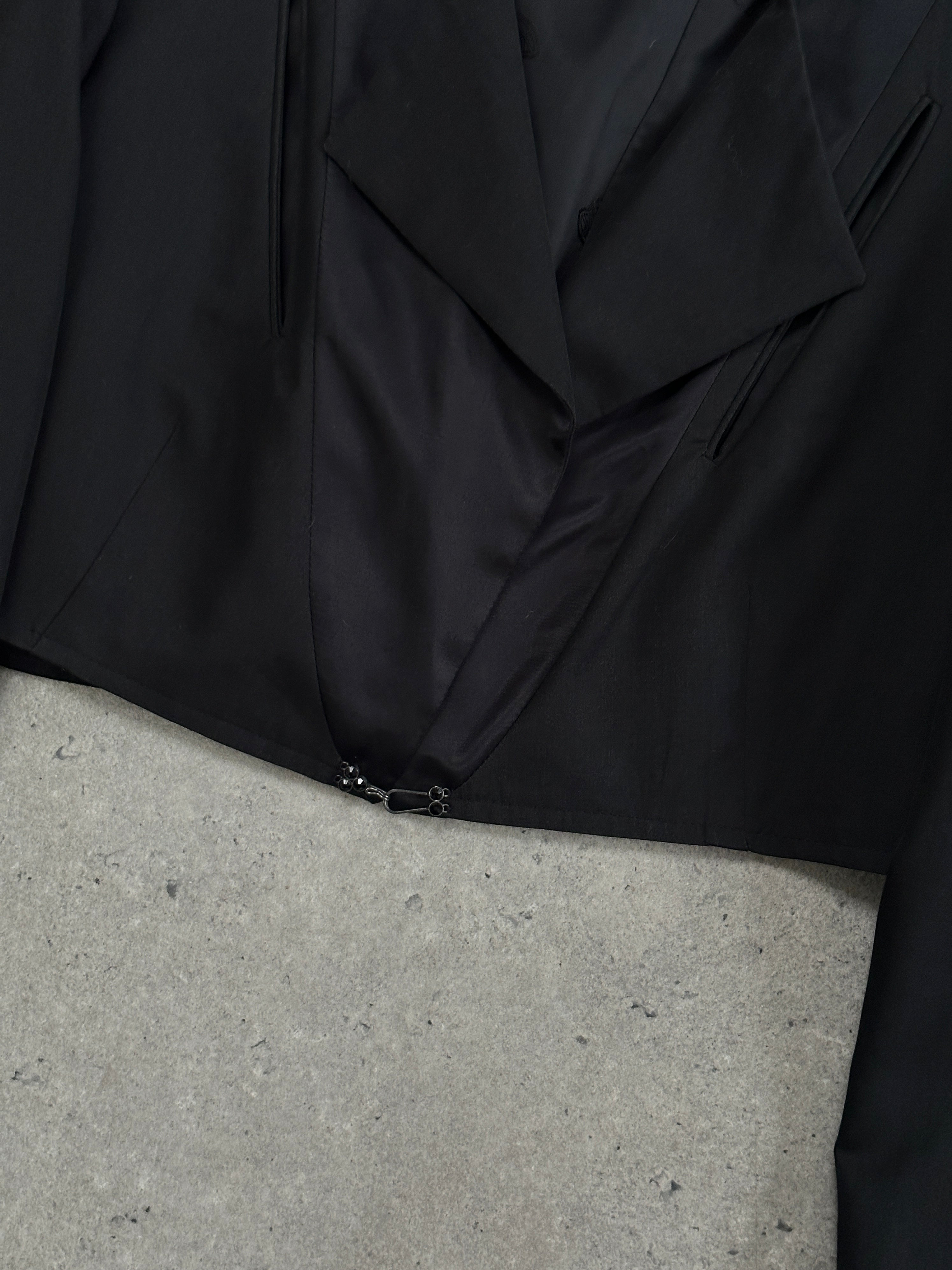 A vintage cropped tuxedo-style jacket with sharp tailoring, cut-out pocket detailing and subtle black gem accents at the fastening. Finished with a structured silhouette and decorative hardware, offering a refined early 2000s eveningwear feel.