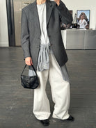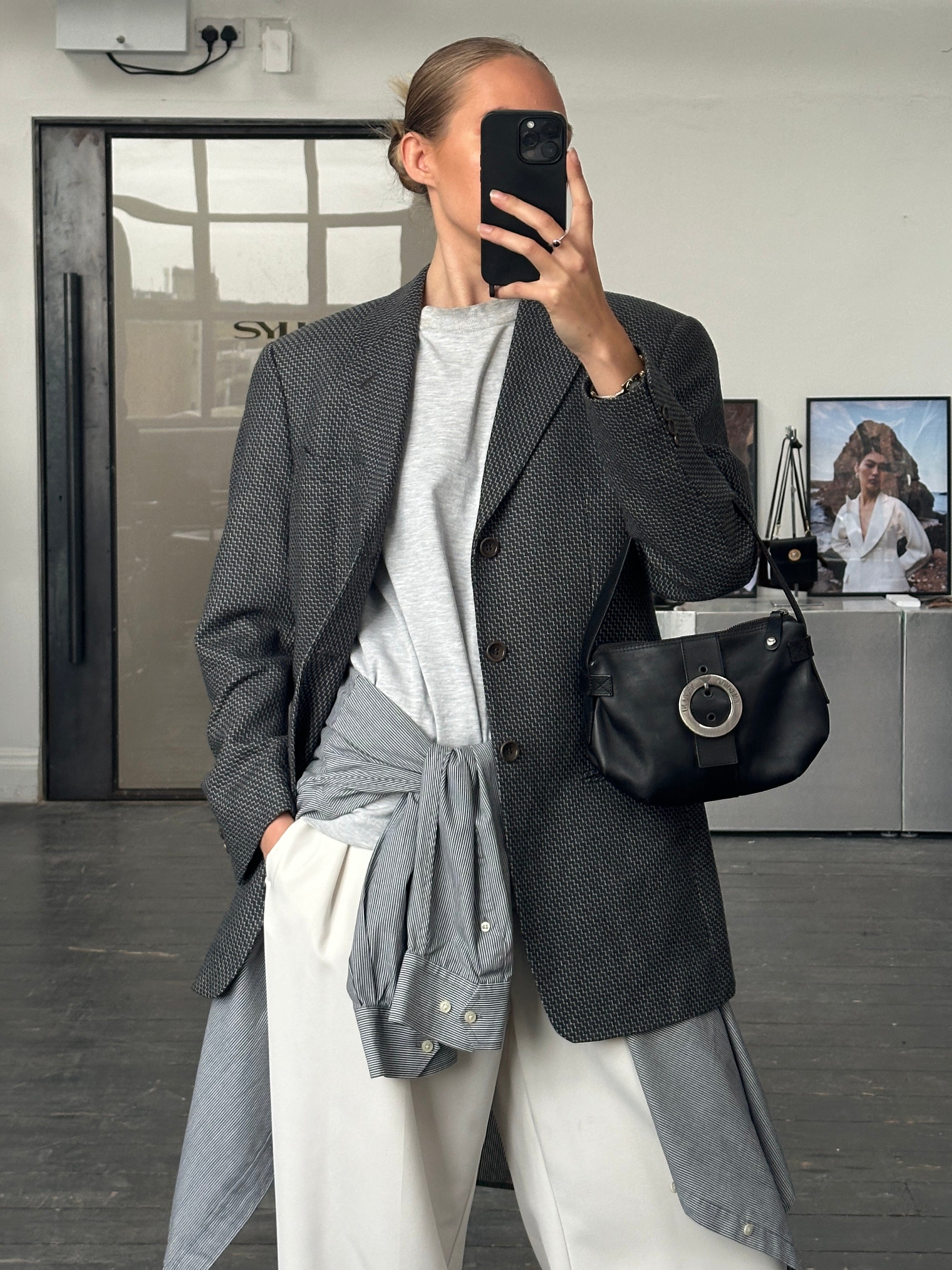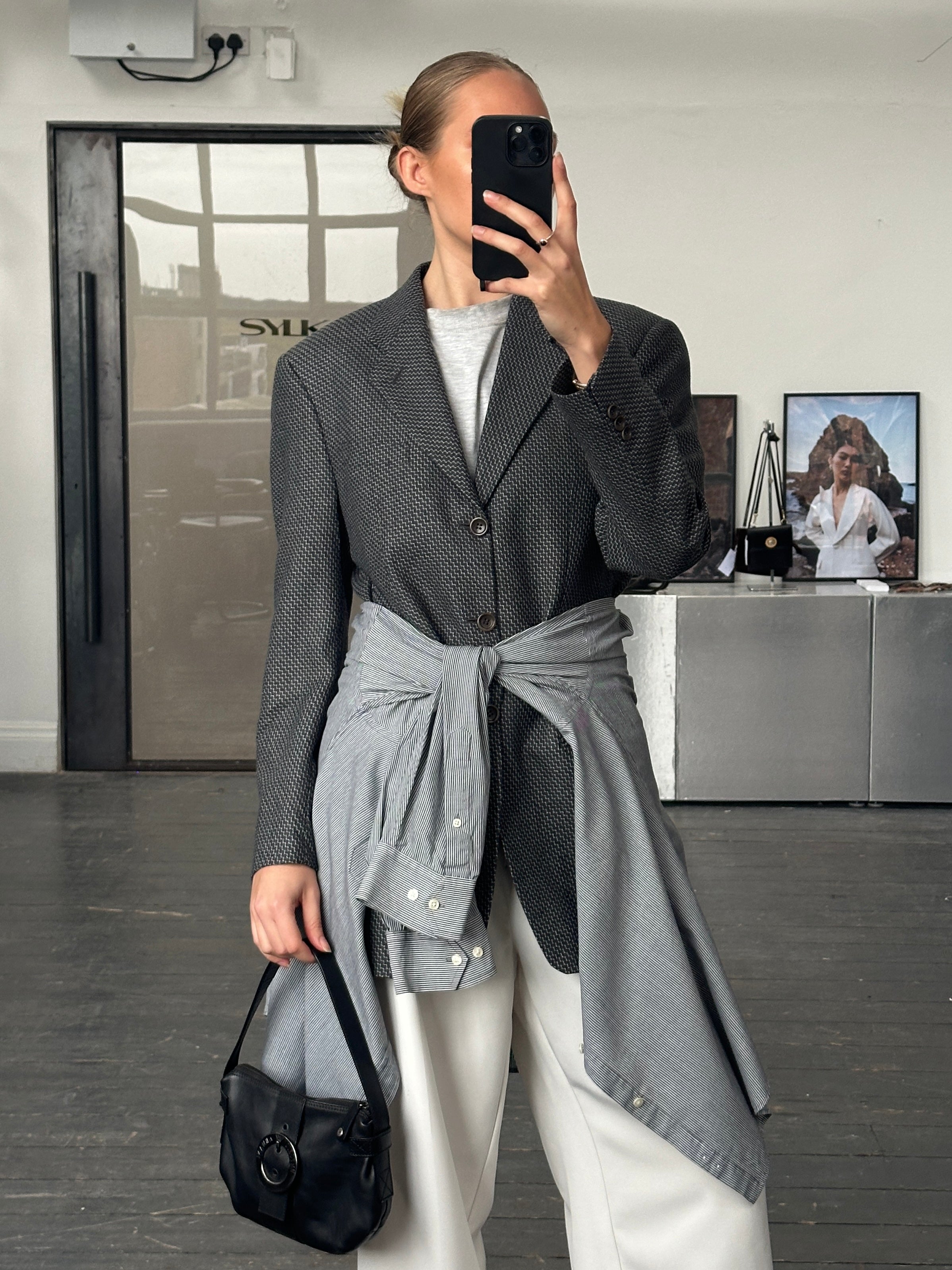 Tailored in Italy from pure virgin wool, this 1990s Armani Collezioni grey blazer features a refined woven micro-texture pattern with structured shoulders and a classic three-button front.