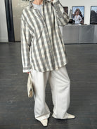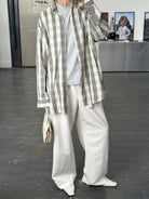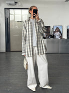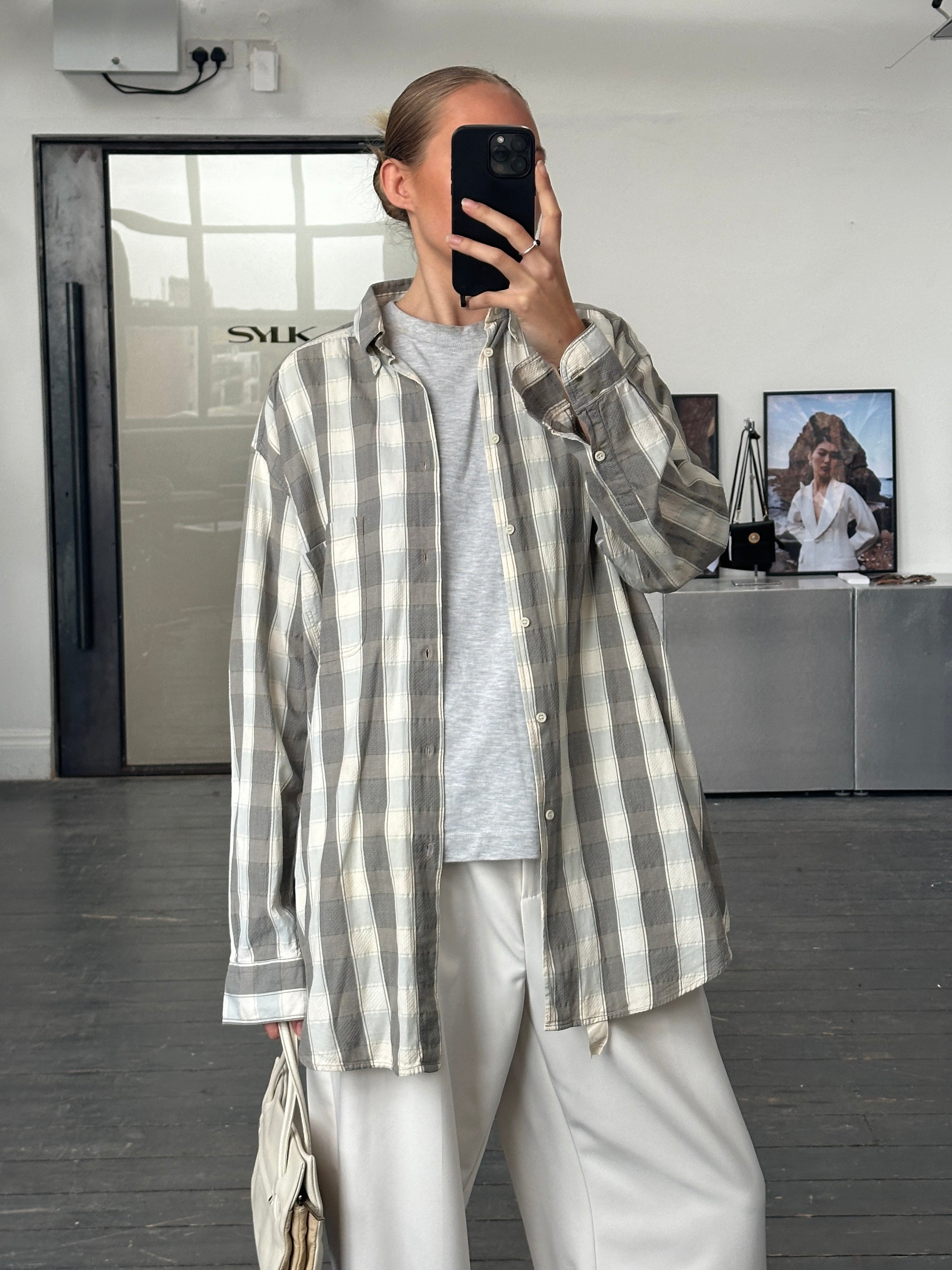 Vintage pure cotton flannel shirt from the 1990s Armani Jeans line featuring a muted beige, grey and green check with embroidered chest logo and relaxed oversized fit.