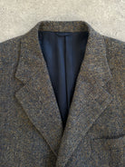 A classic 1990s Burberrys of London herringbone wool blazer featuring a brown and blue woven pattern with a soft brushed handle. Tailored in Italy with a structured silhouette and clean notched lapels.