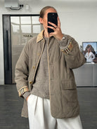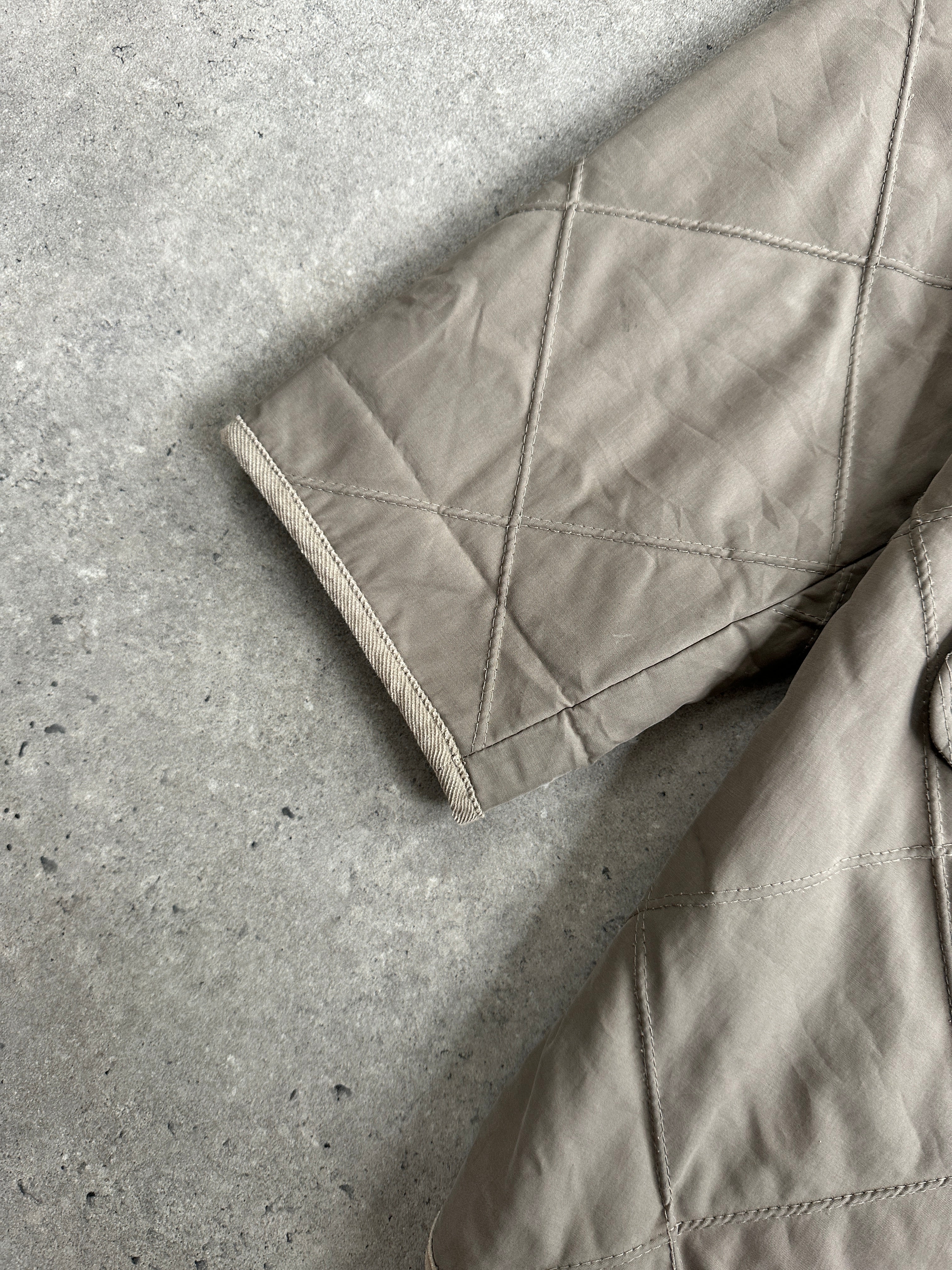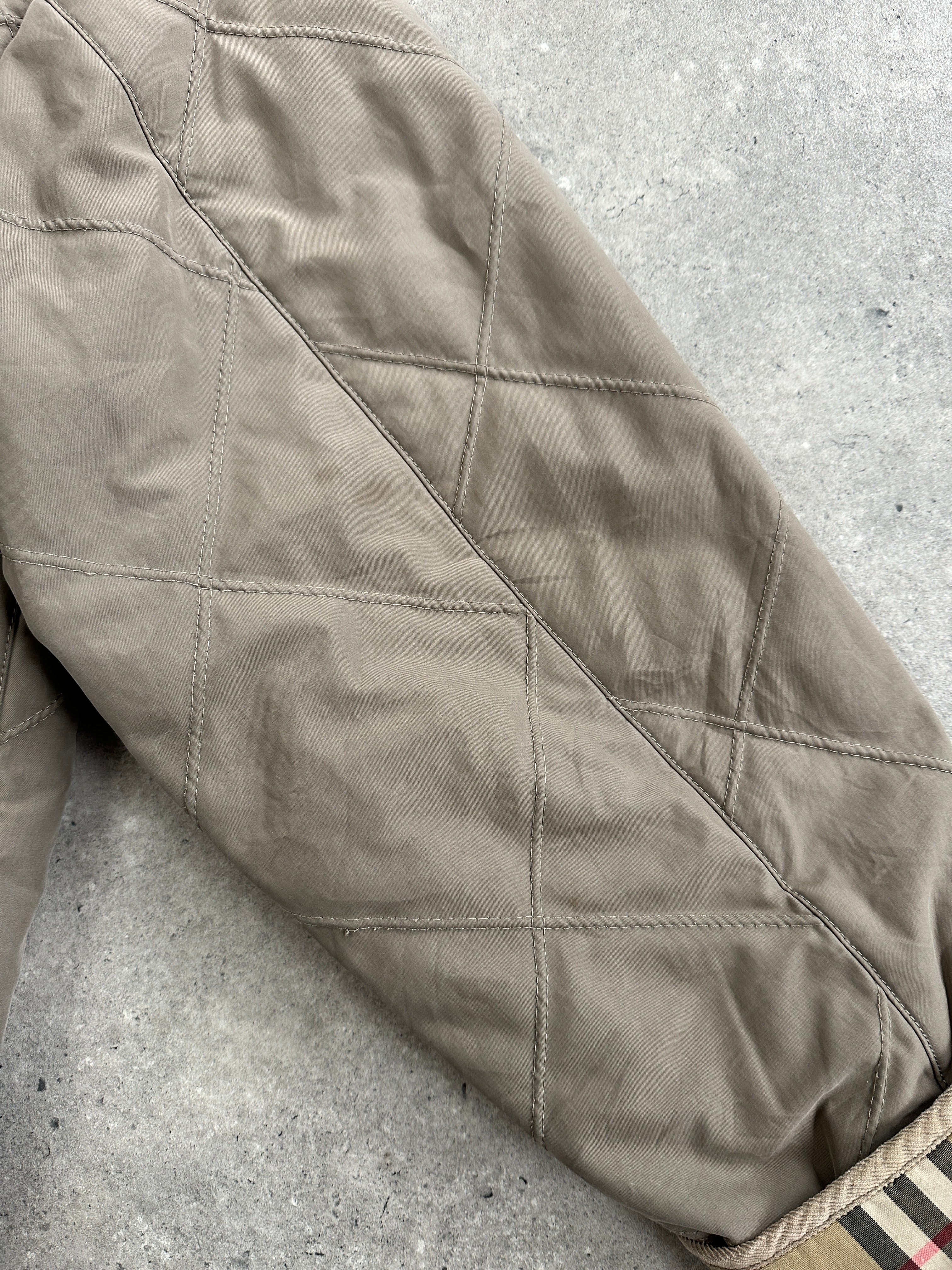 Vintage Burberrys of London 1990s diamond-quilted jacket featuring the brand’s signature Nova Check lining and contrasting tan corduroy collar.