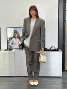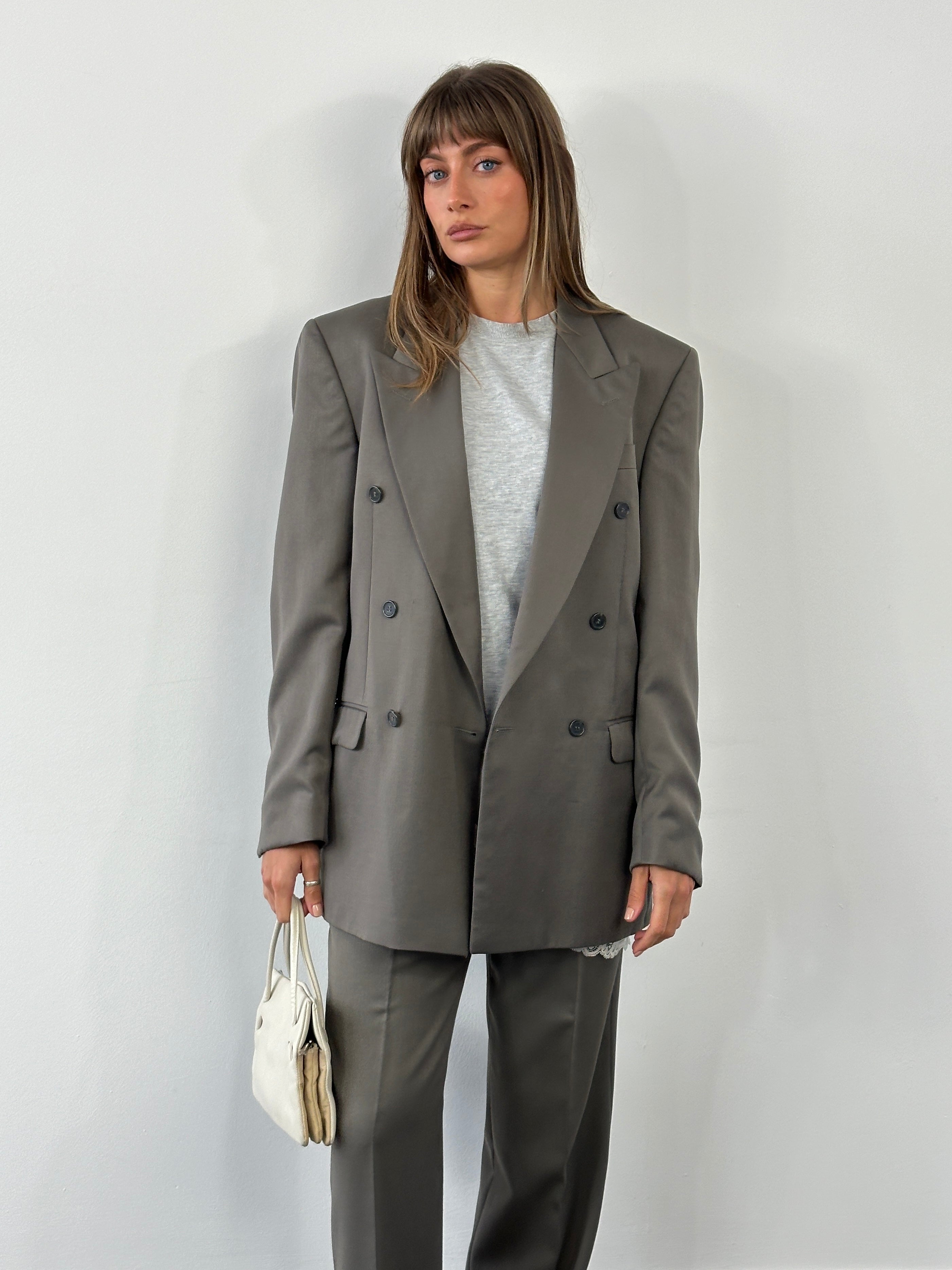 A muted green 1990s Pierre Balmain suit featuring a sharp double-breasted blazer with wide peak lapels and matching pleated trousers. Quiet luxury tailoring with clean Parisian structure and contemporary wearability.