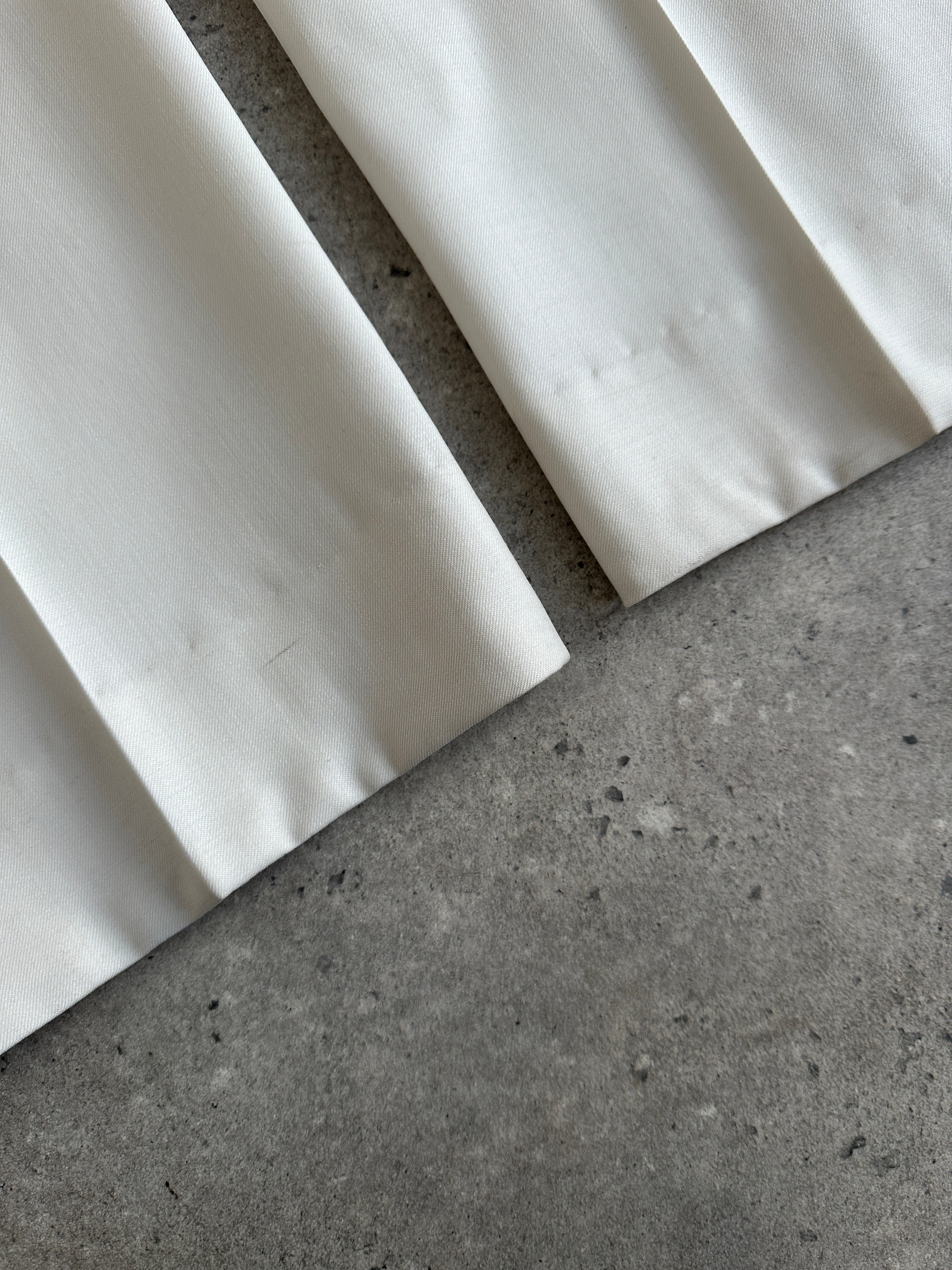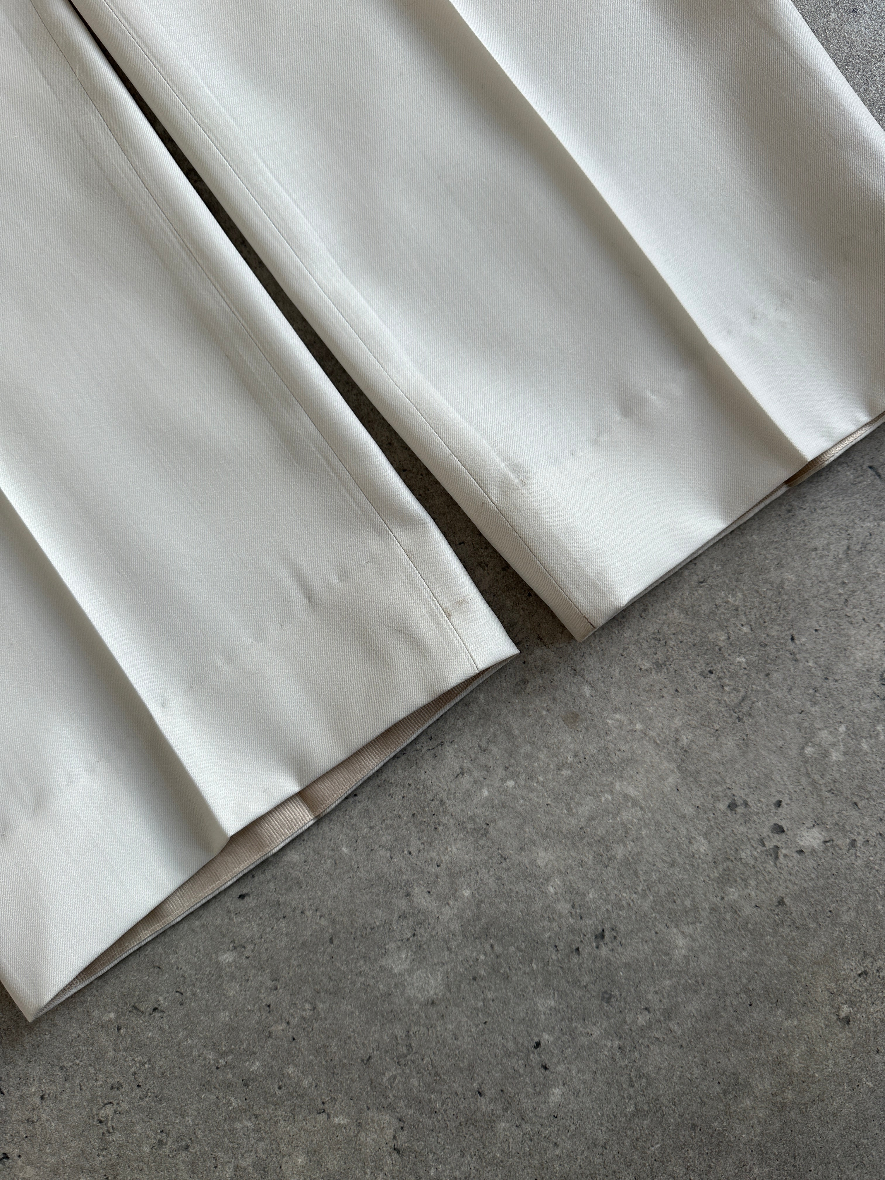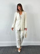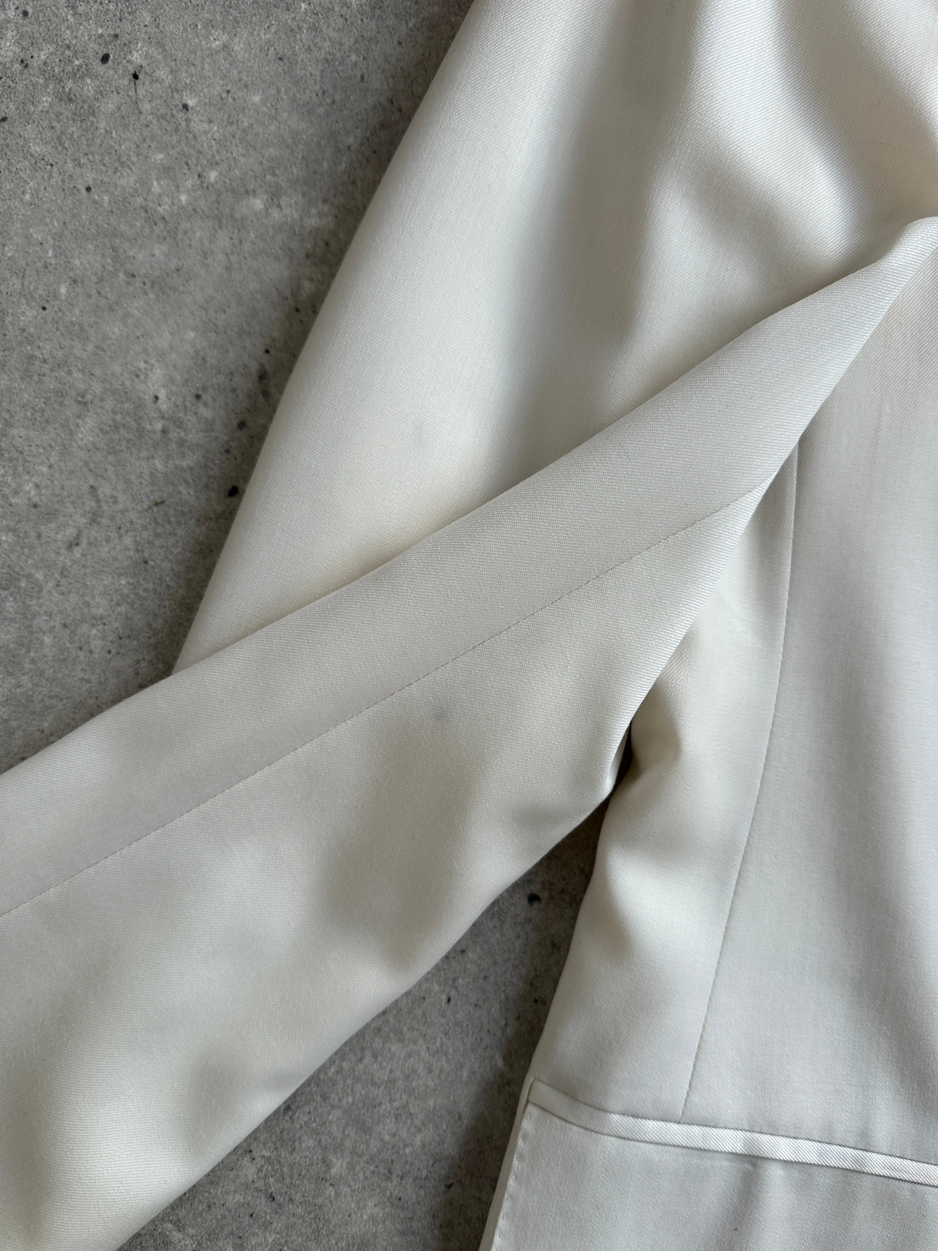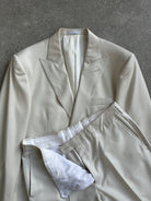 Vintage off white Versace Collection suit featuring a sharp peak lapel blazer and straight leg trousers. Cut from luxurious Super 100’s wool with a clean, elegant drape and finished with subtle tonal detailing.