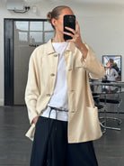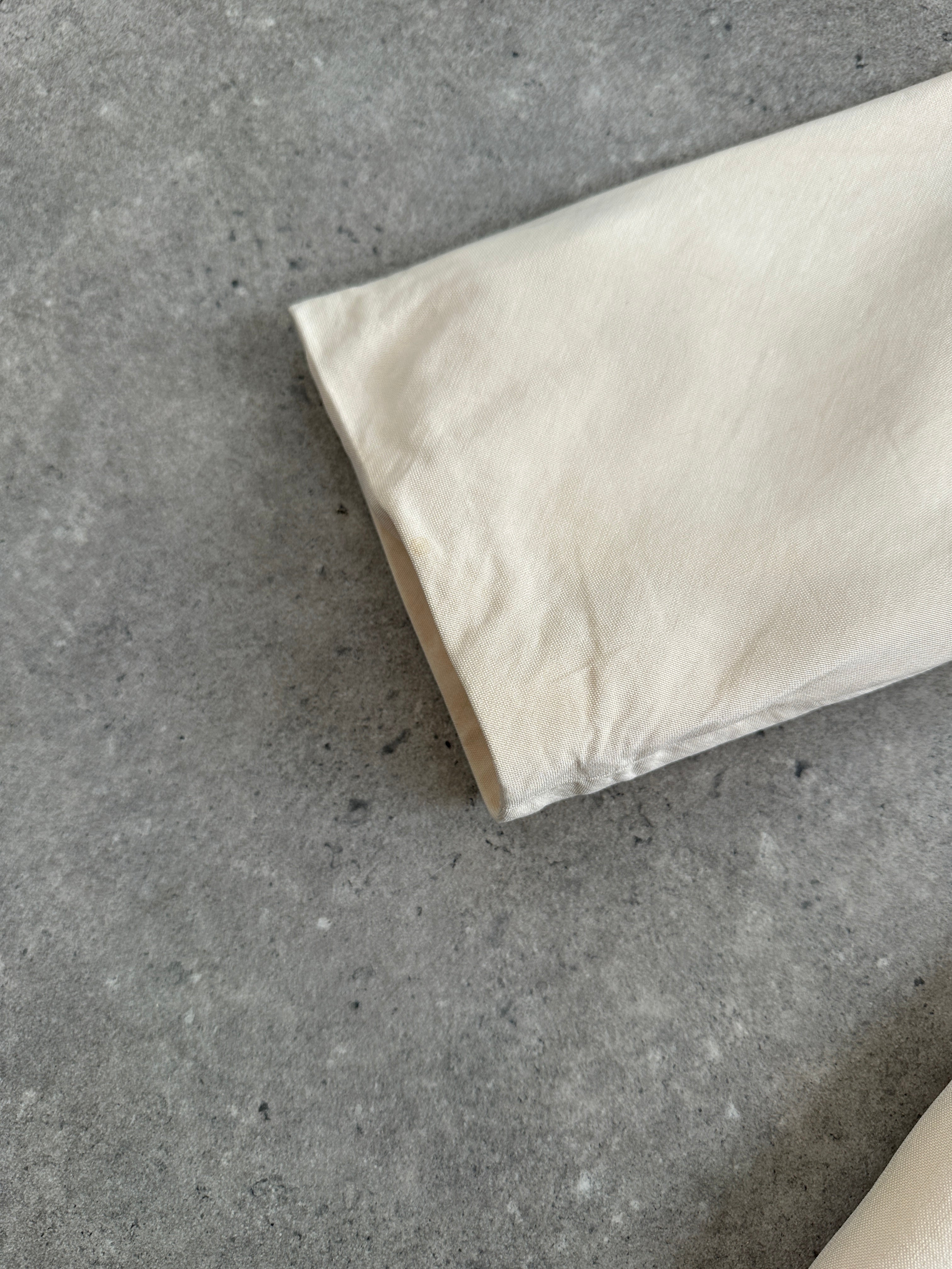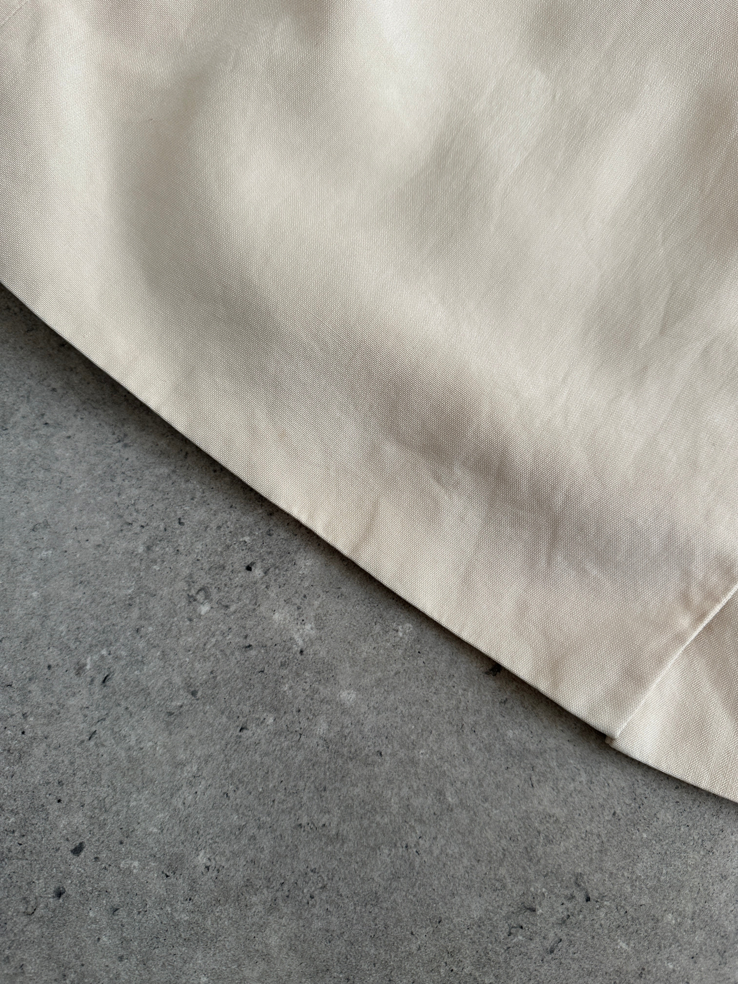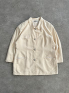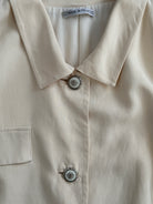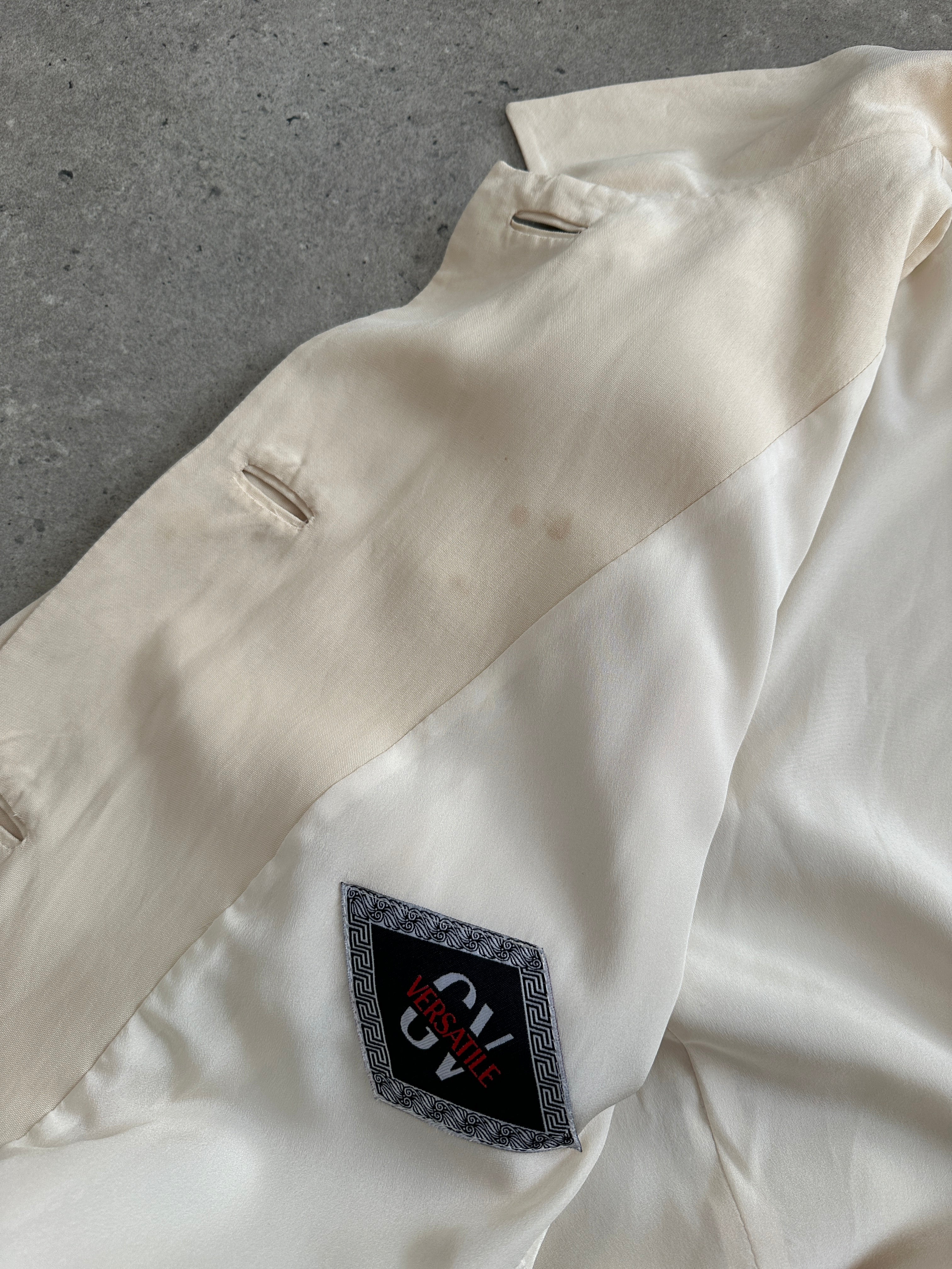 Vintage minimal 1990s Gianni Versace Versatile cream silk blazer with bespoke Medusa mother of pearl buttons and a relaxed, softly structured silhouette. Finished with a clean point collar and subtle pocket detailing.