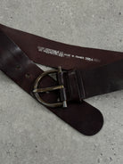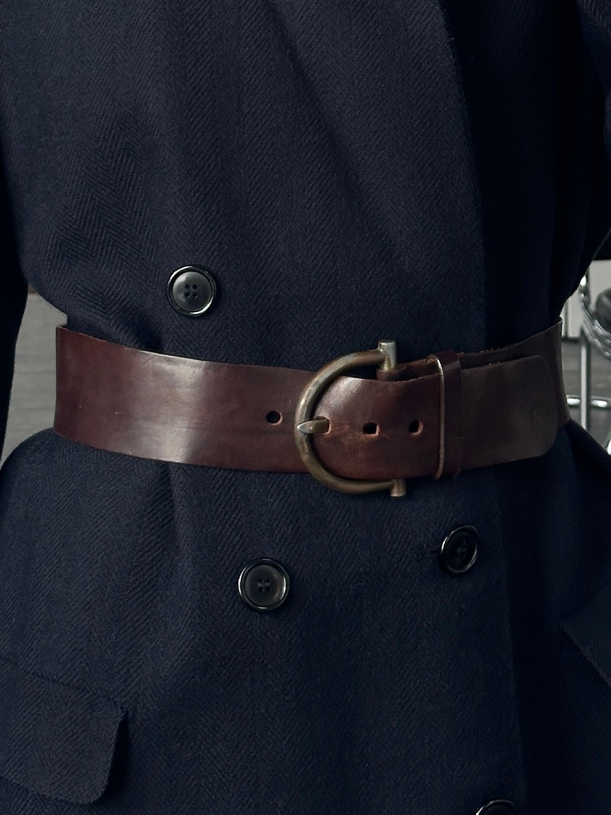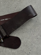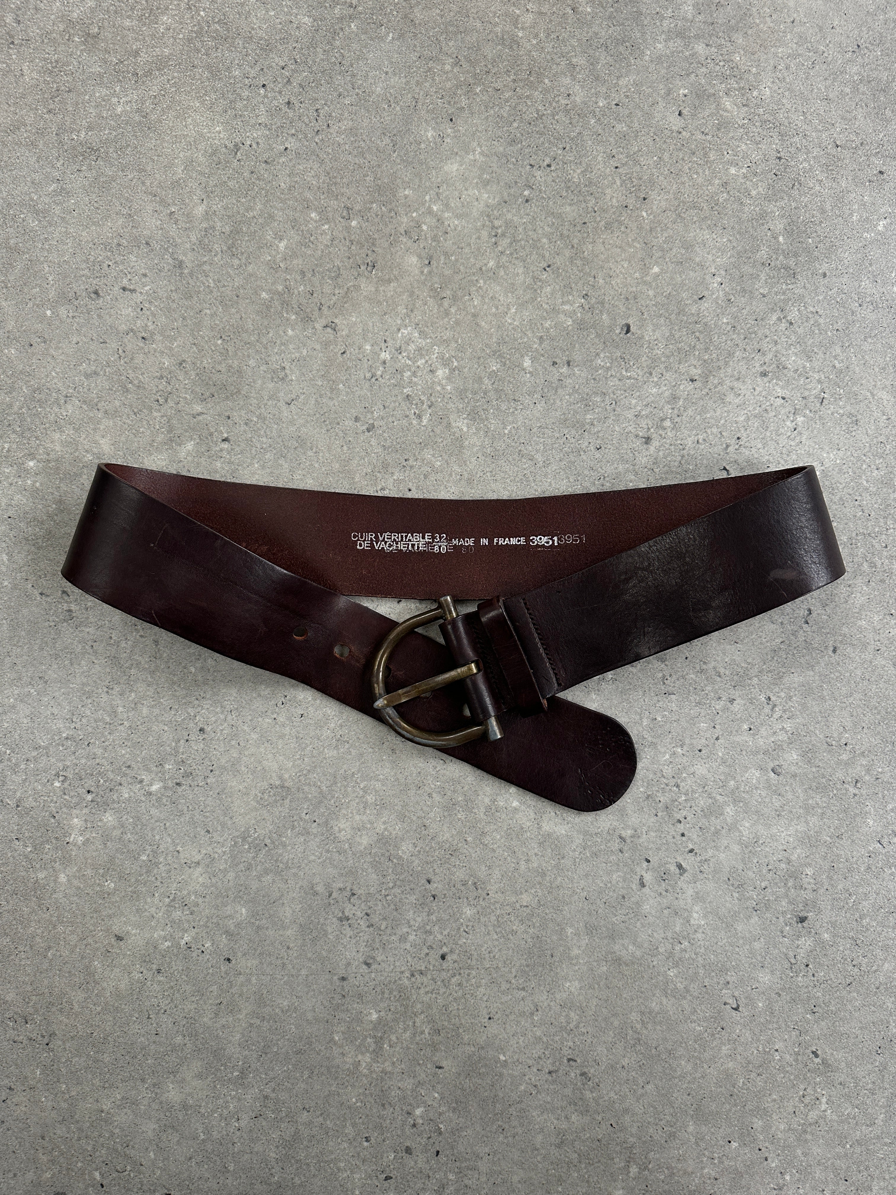 Vintage French 1980s brown leather belt featuring a solid brass D-ring buckle and natural patina. Crafted from full-grain cowhide with timeless minimal styling.