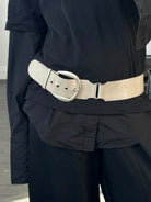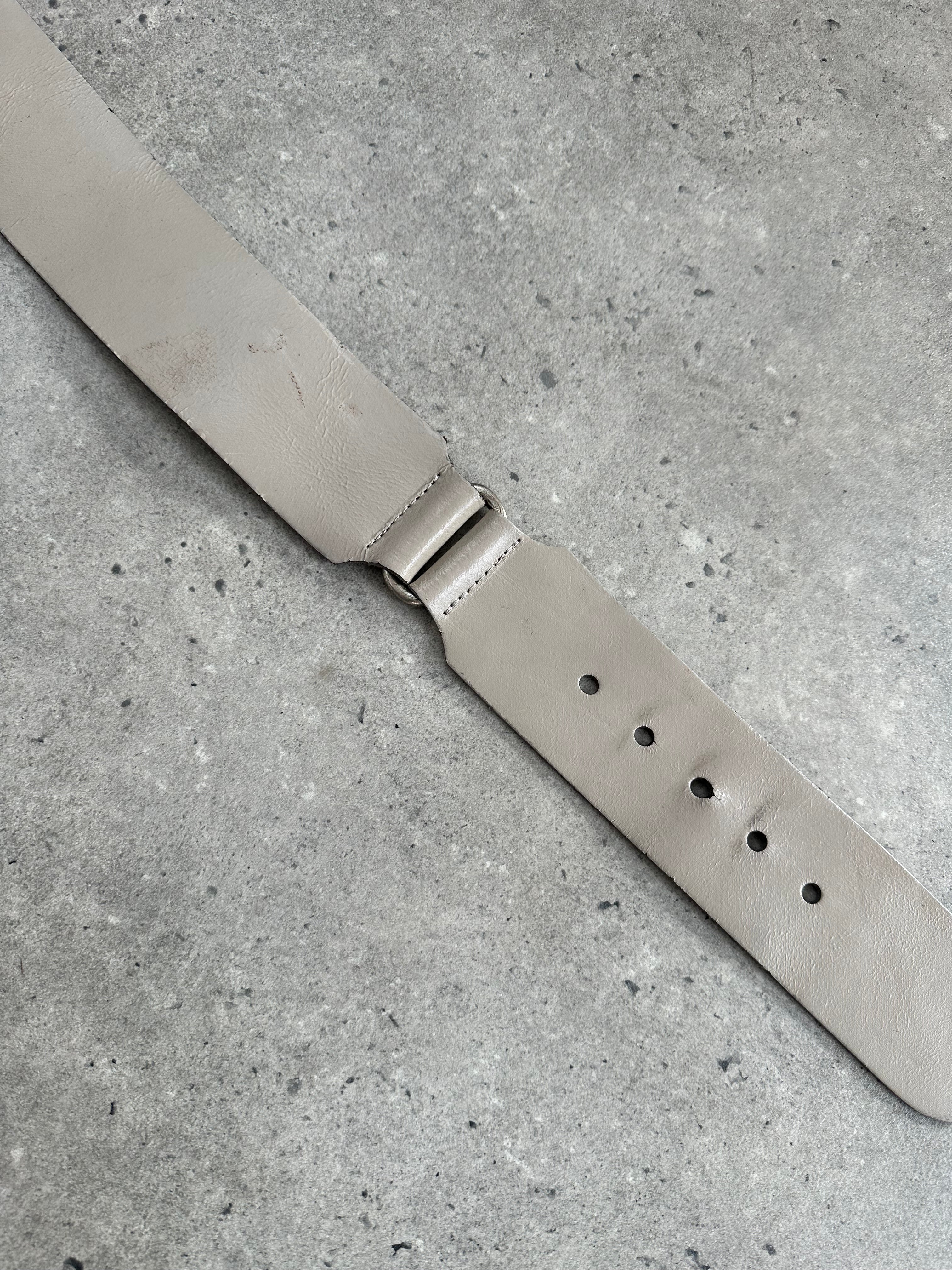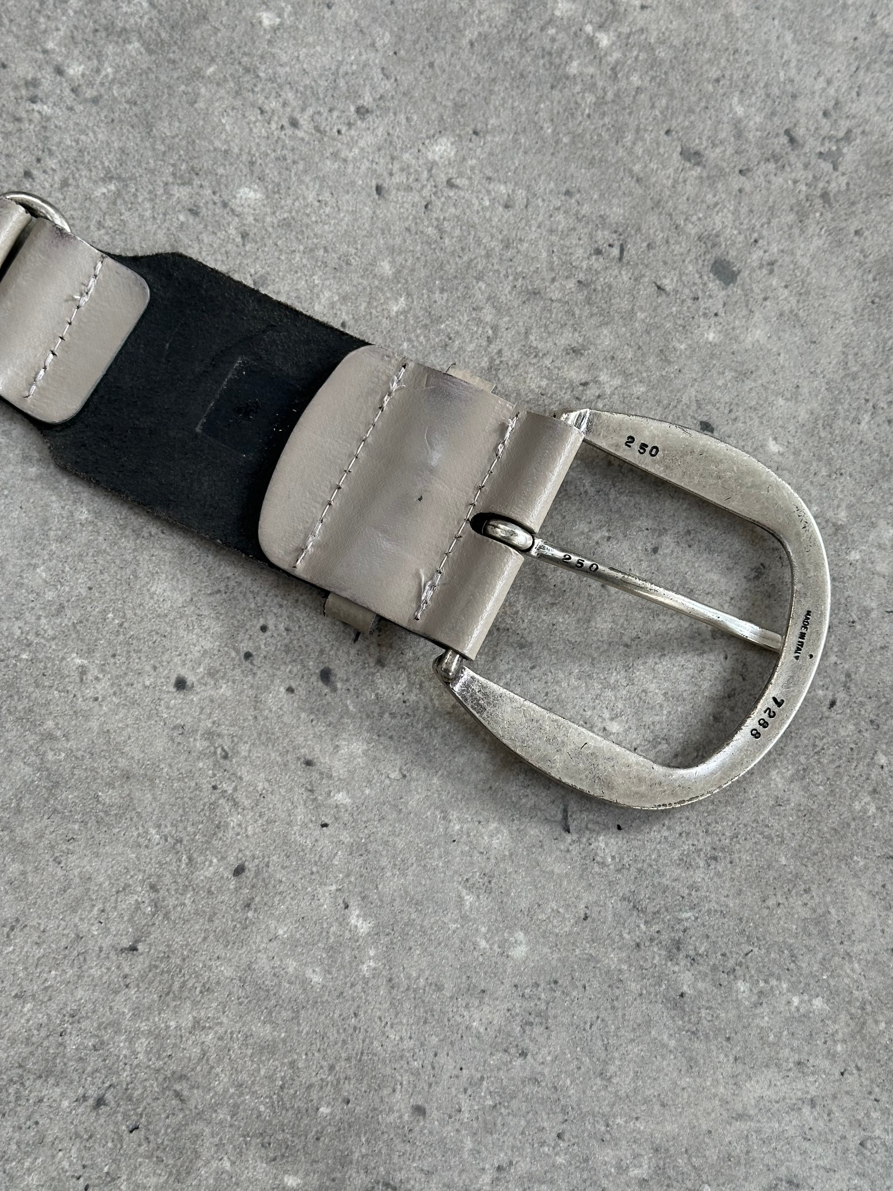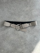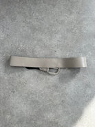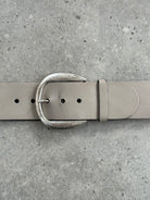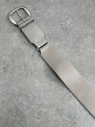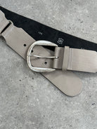 Vintage Italian leather belt in grey with a wide silhouette and chunky rounded buckle. Designed with a minimal structured strap and brushed metal hardware, giving the piece a strong utilitarian feel typical of late 1990s and early 2000s accessories.