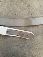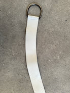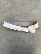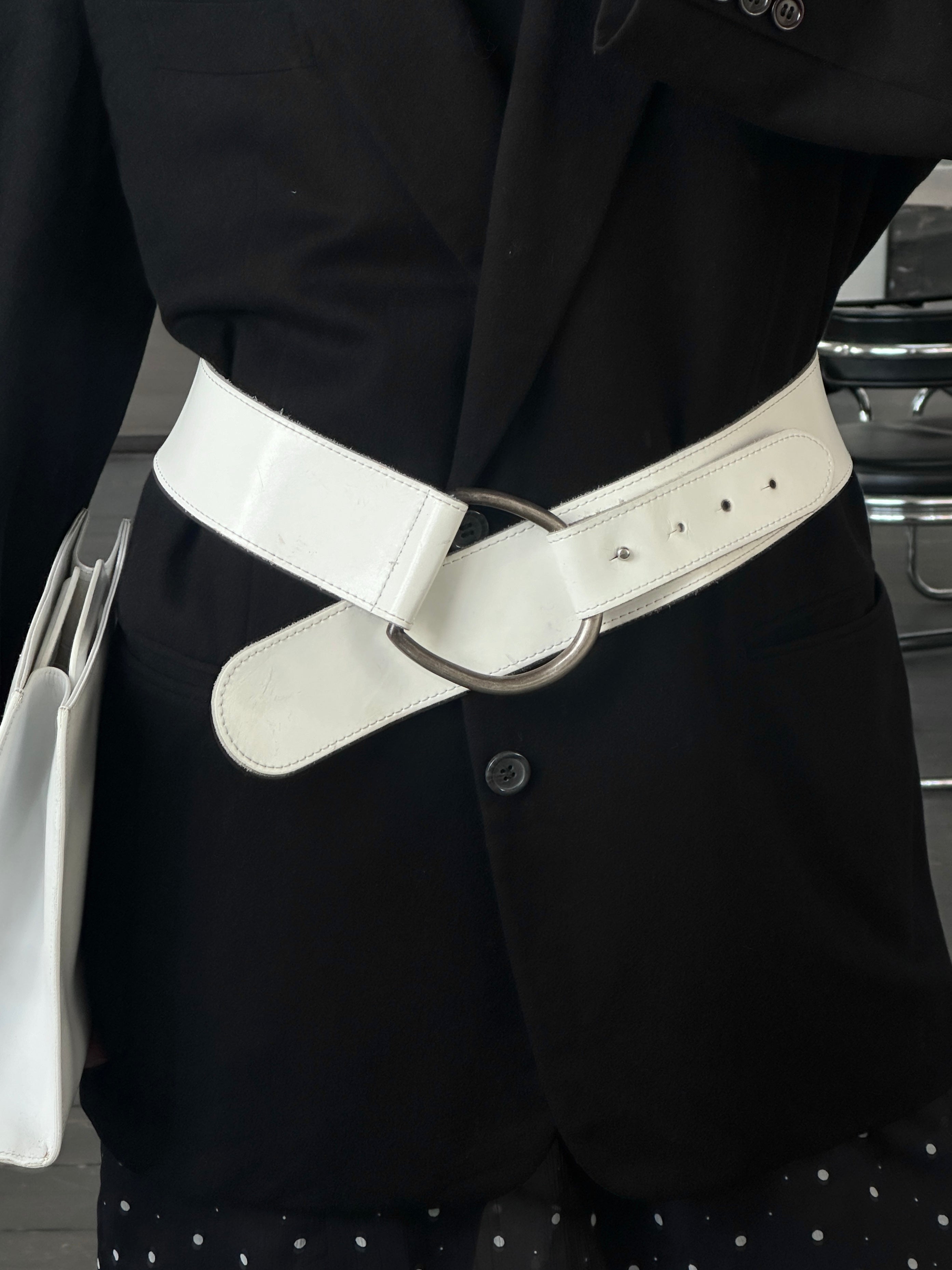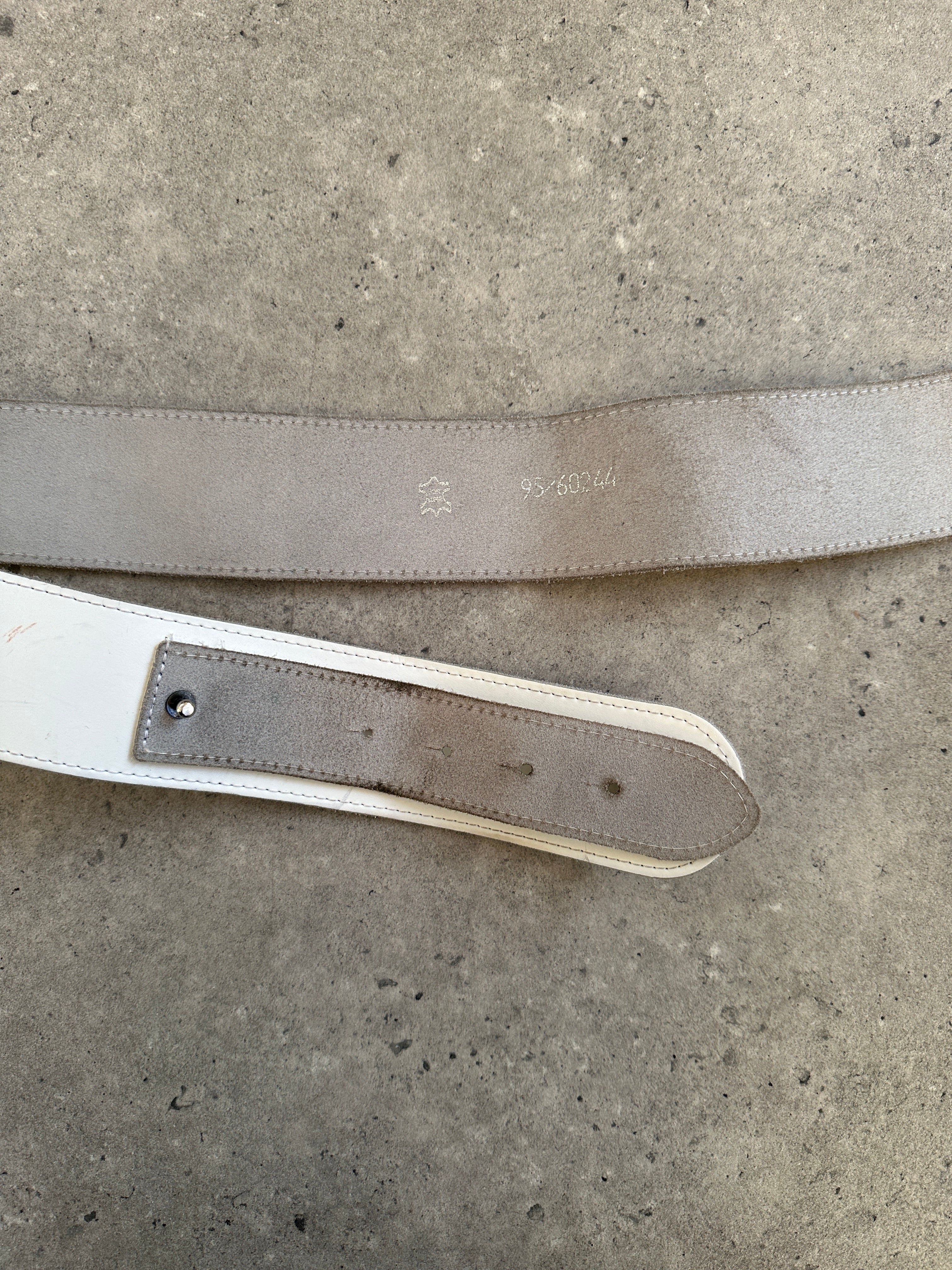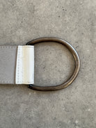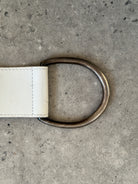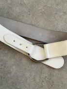 A vintage 1990s white leather belt featuring a clean silver-tone D-ring fastening and a wide structured profile. Designed to sit comfortably at the waist or hips, offering a minimalist statement.