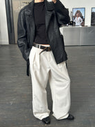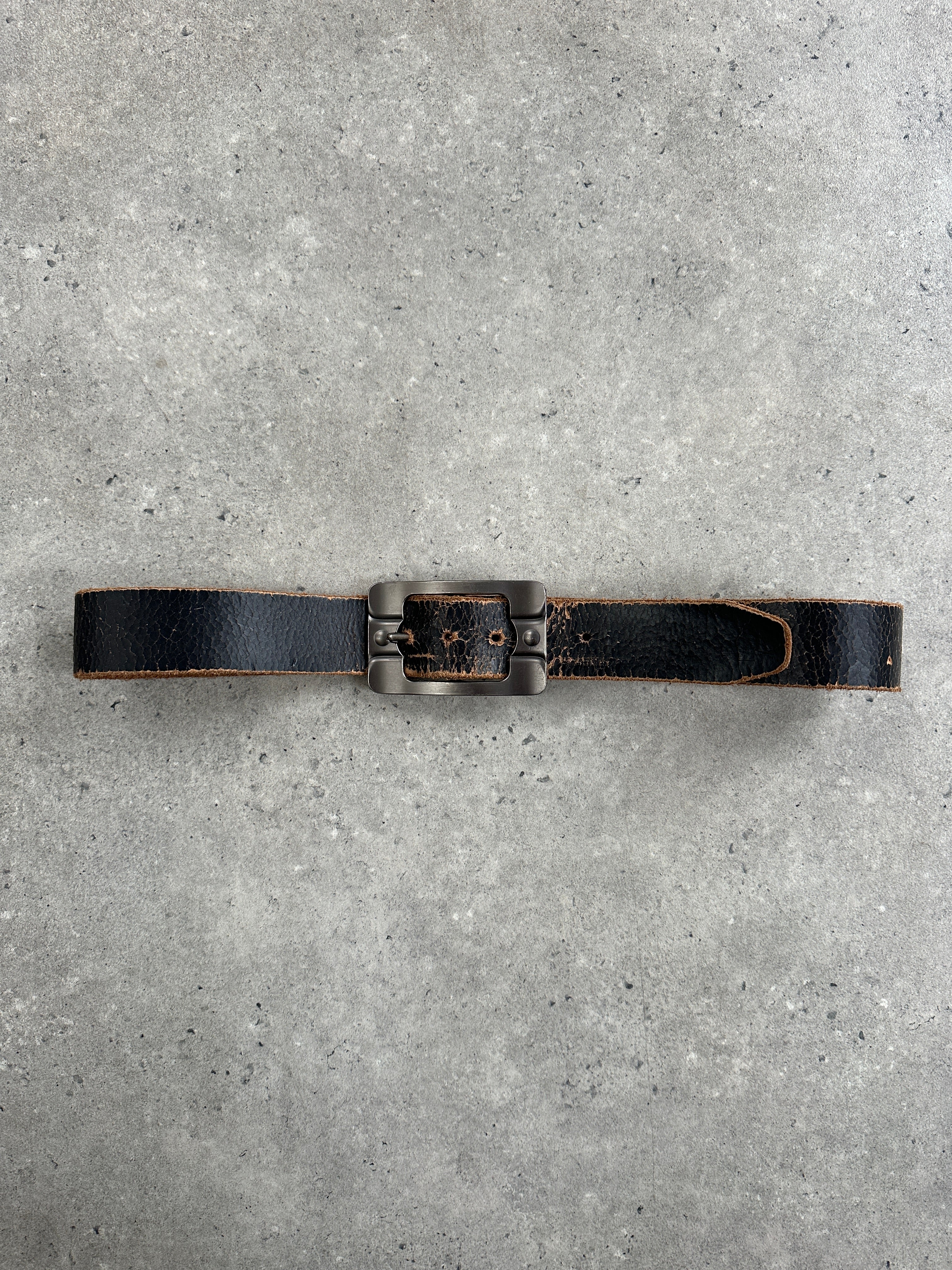 Vintage 1990s genuine leather belt featuring a naturally aged cracked patina and matte metal silver square buckle. A minimal design elevated by its raw texture and lived-in appeal.