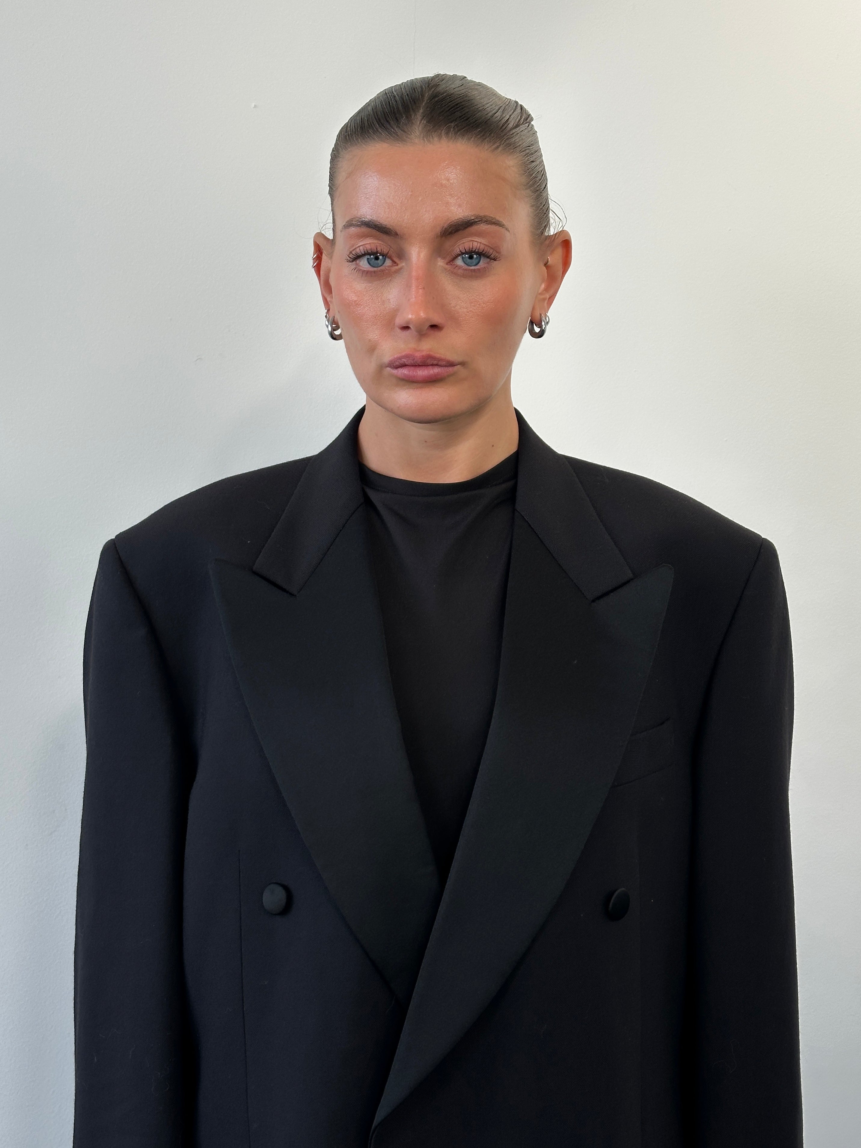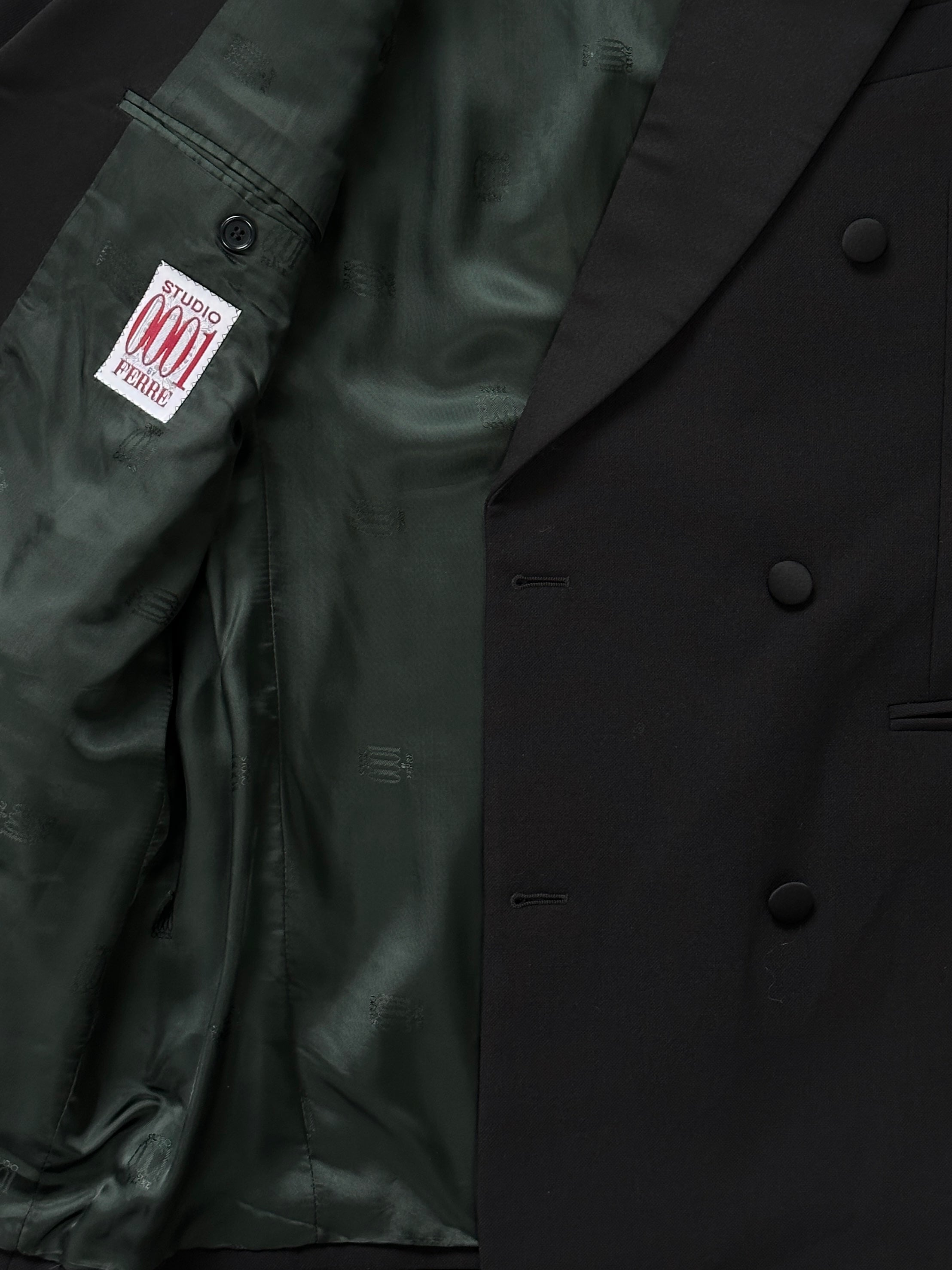A sculptural Gianfranco Ferré Studio 0001 double-breasted tuxedo blazer in classic black, designed with sharp peaked satin lapels and a formal tailored silhouette. Finished with a monogram-lined interior and a structured shoulder line. Offering strong crossover appeal for both menswear and womenswear styling.