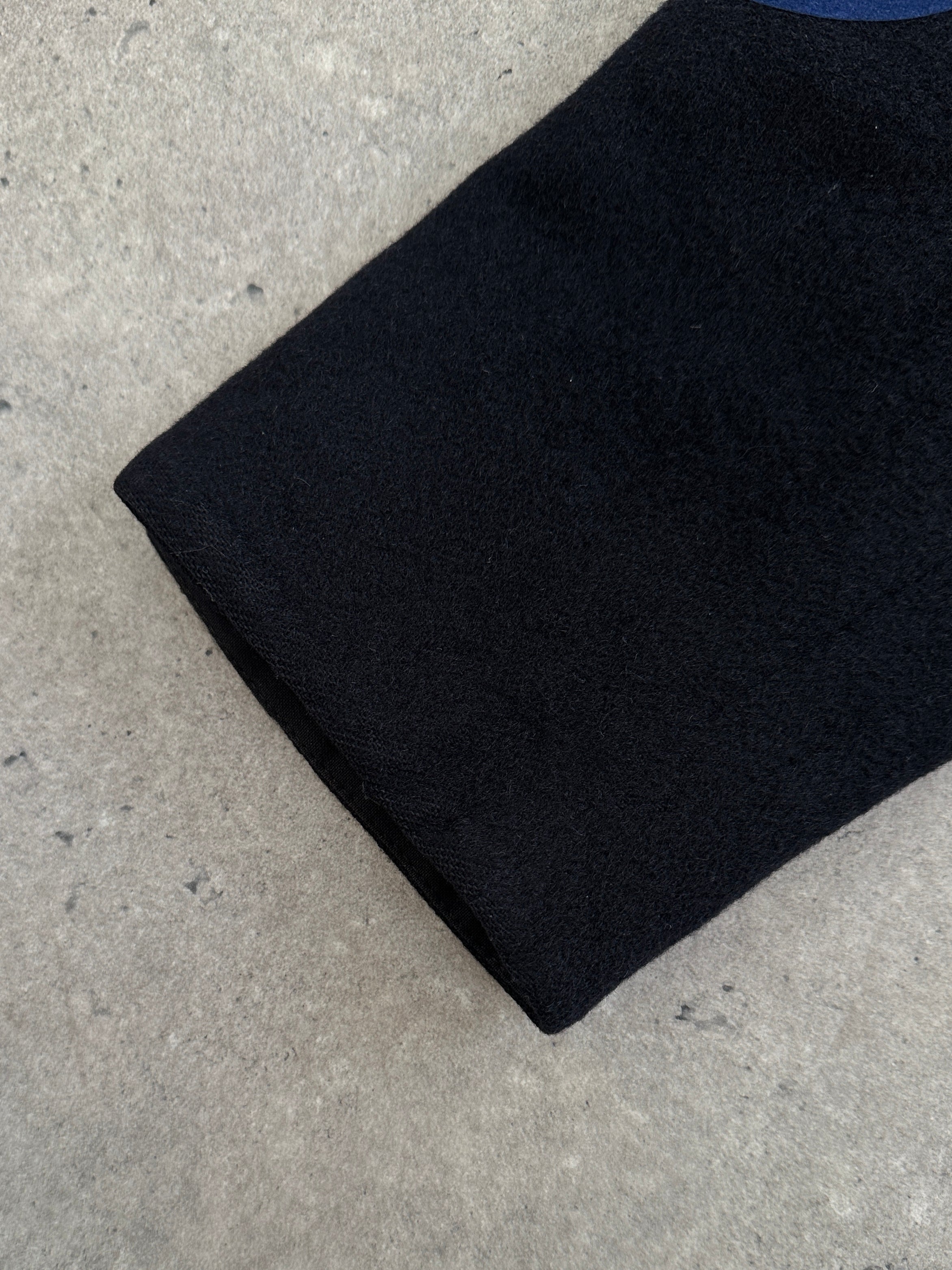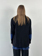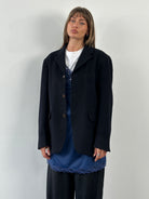A refined 1990s vintage blazer crafted from pure cashmere in a deep navy tone, finished with contrast blue elbow patches. Softly structured with classic tailoring, offering a relaxed yet polished silhouette suitable for both menswear and womenswear styling.