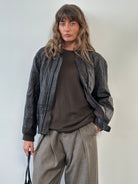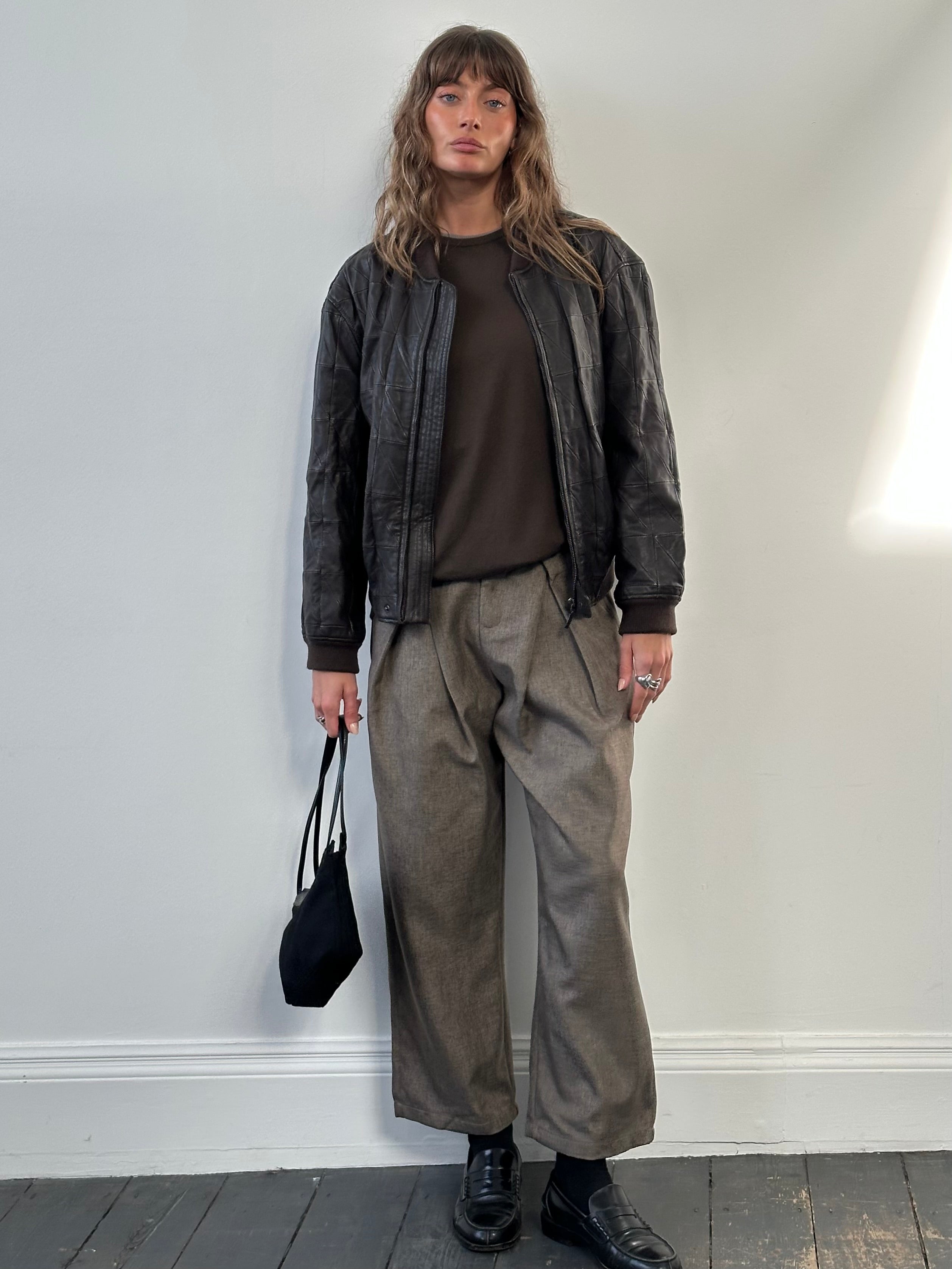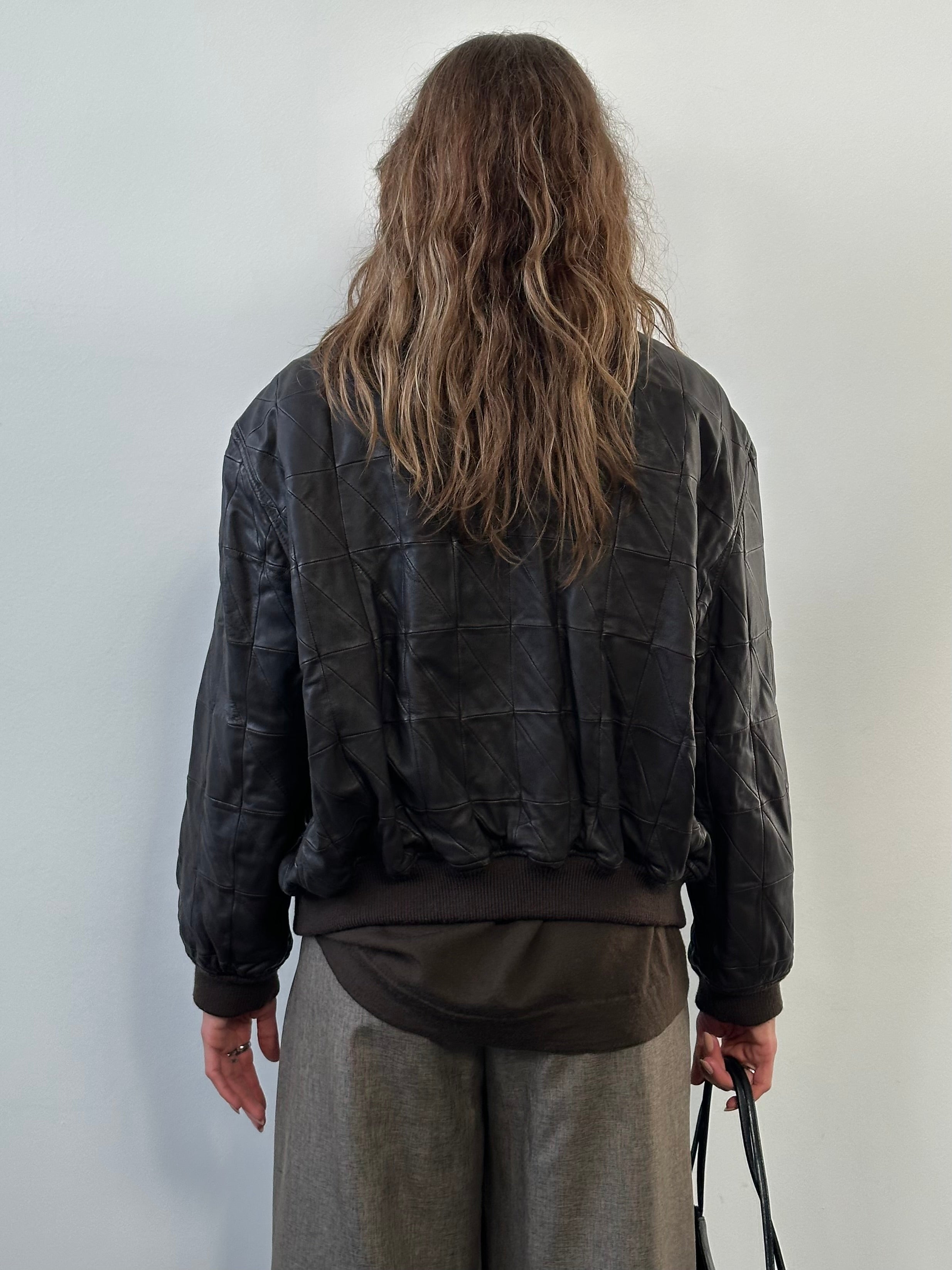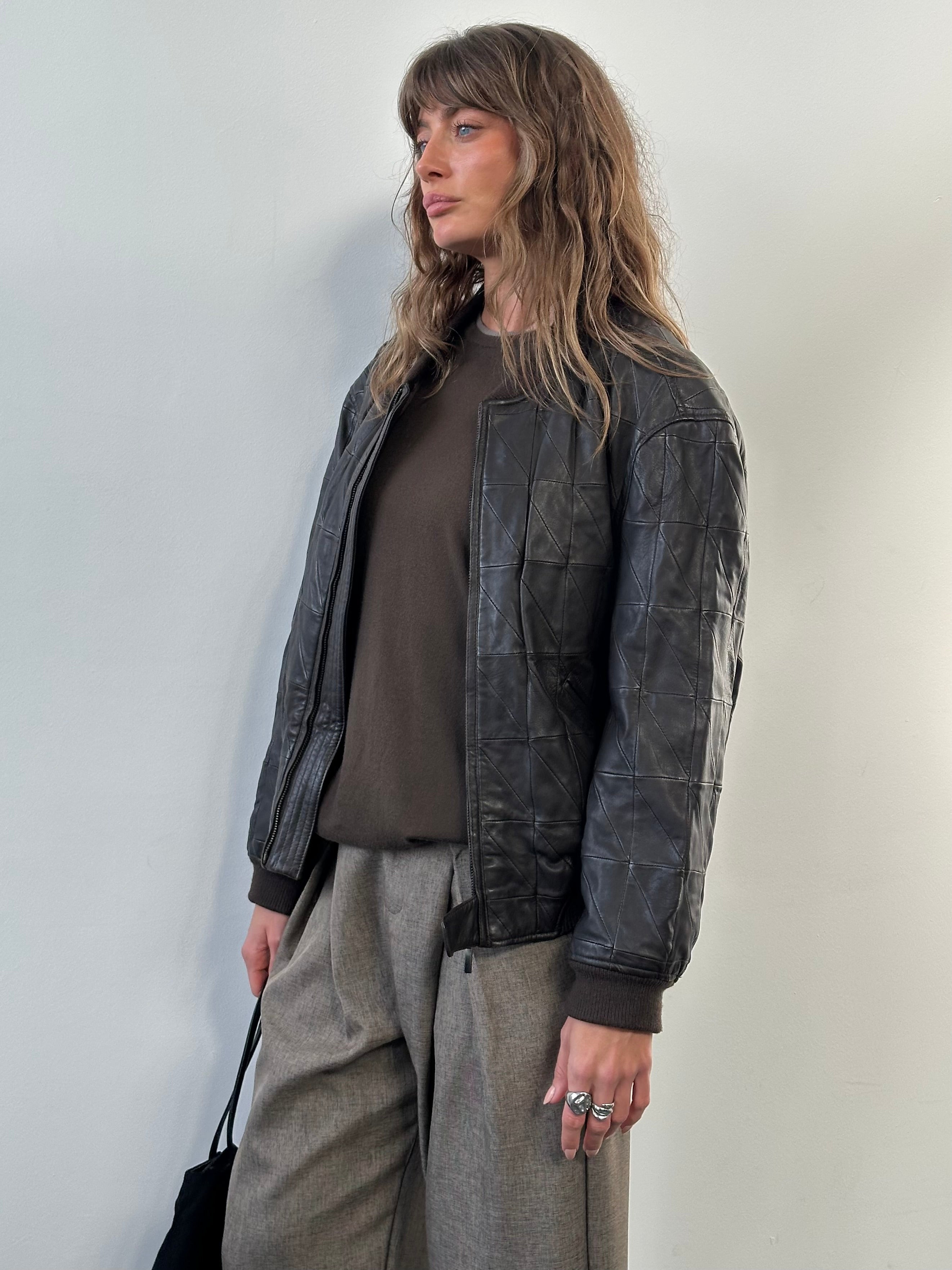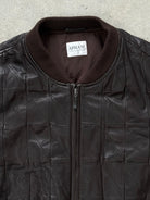 Vintage brown Armani Collezioni genuine leather bomber jacket with quilted panel construction and a clean zip front. Finished with ribbed collar, cuffs and hem, offering a structured yet relaxed silhouette typical of early 2000s Armani Collezioni outerwear.