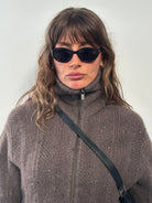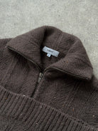 Vintage brown speckled wool zip jacket by Farhi, Nicole Farhi. Designed with a structured funnel neck and ribbed hem for a clean bomber inspired silhouette. Finished with flap pockets and a textured knit construction, reflecting refined late 1990s minimal tailoring.