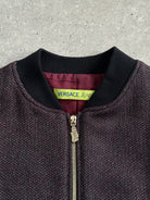 Versace Jeans 2000s wool blend bomber with Medusa hardware and textural herringbone print.