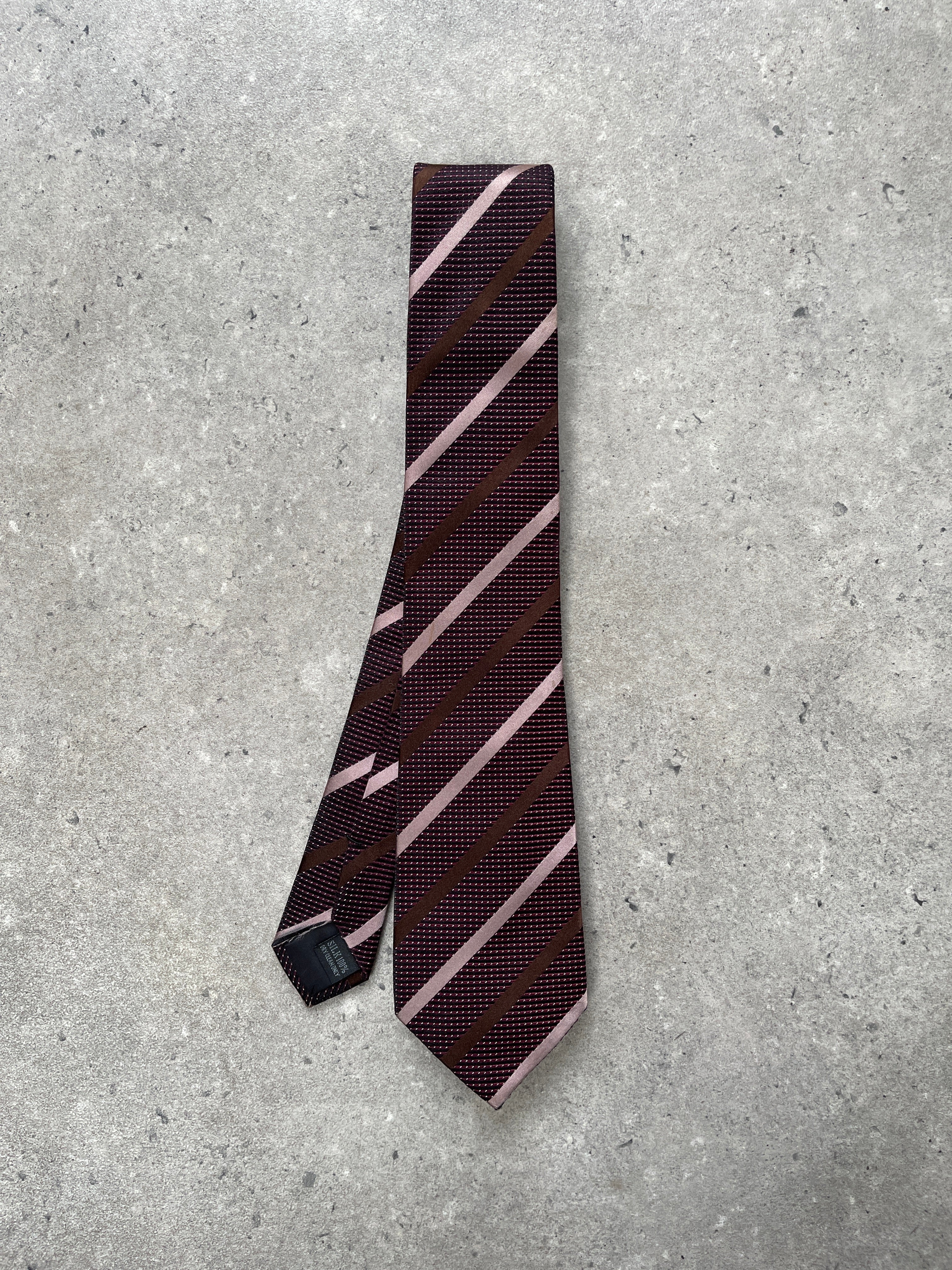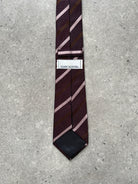 Vintage 1990s burgundy pure silk tie with diagonal stripe detailing in soft pink and brown tones by Gianni Valentino. Finished with a pointed blade and classic woven construction. A clean 1990s silhouette that works well with relaxed tailoring or structured suiting.