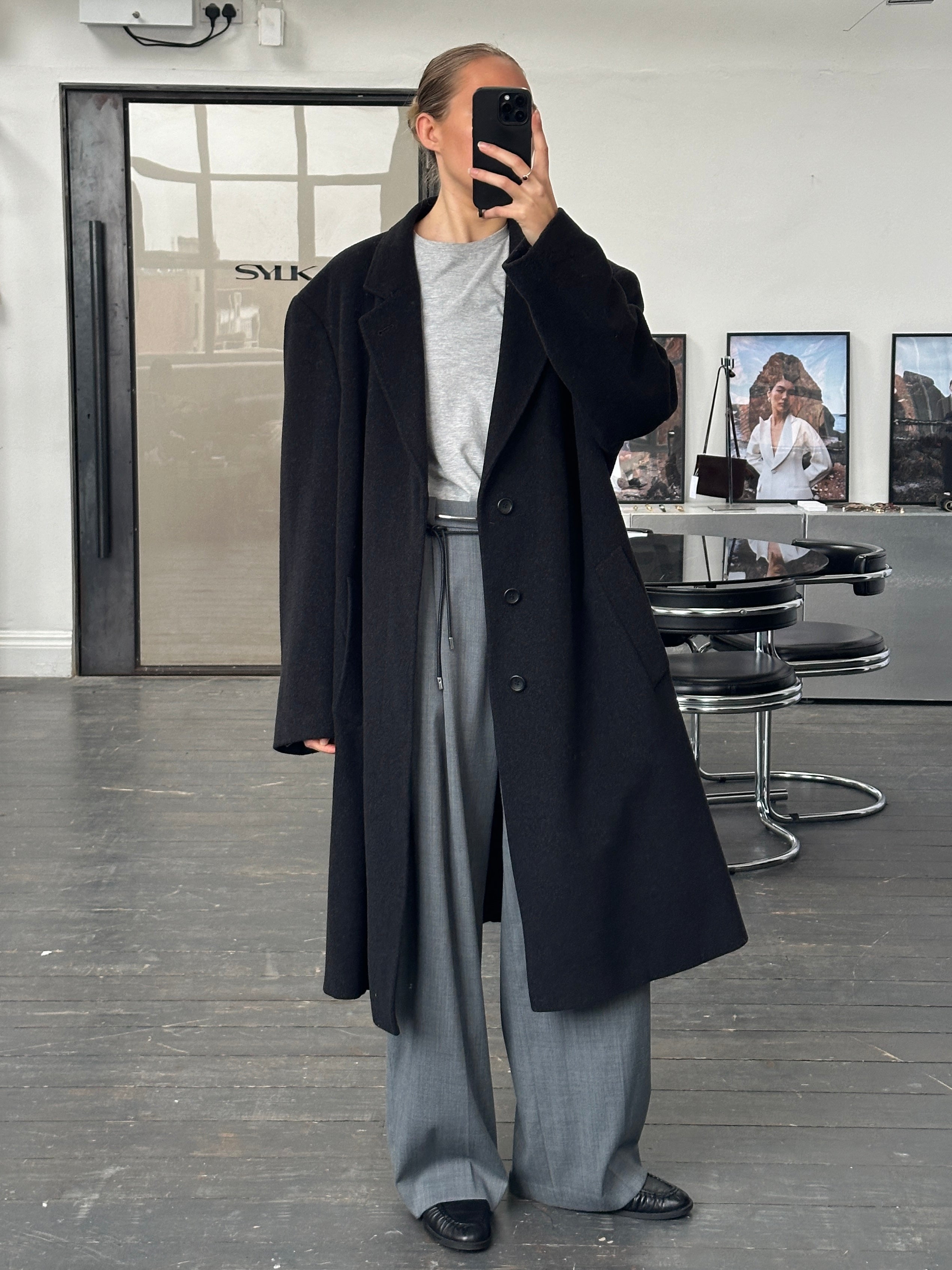 A 1990s Varteks International dark grey coat with a minimalistic concealed placket and structured shoulders, crafted in a soft cashmere blend for a refined winter layer.