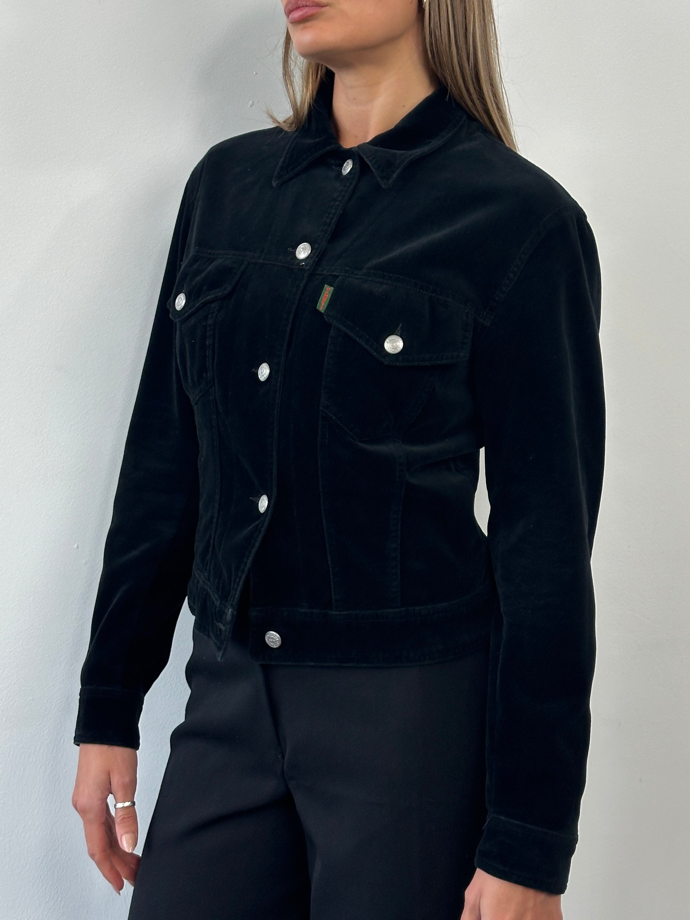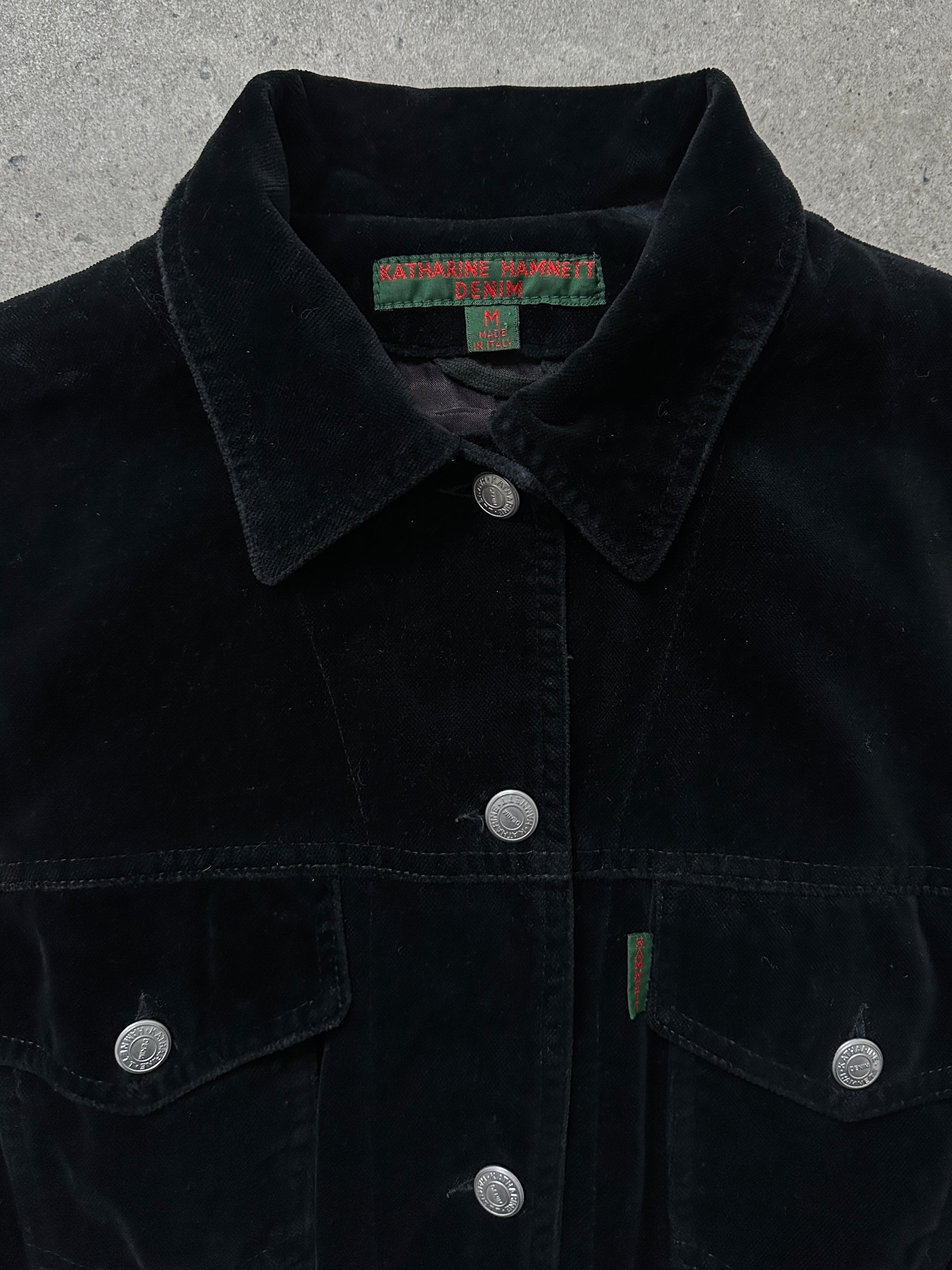 Vintage 1990s black denim jacket by Katharine Hamnett Denim, cut in Italy from pure cotton with a structured cropped silhouette and classic workwear detailing. Clean snap fastenings and a soft brushed handle.