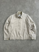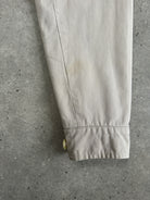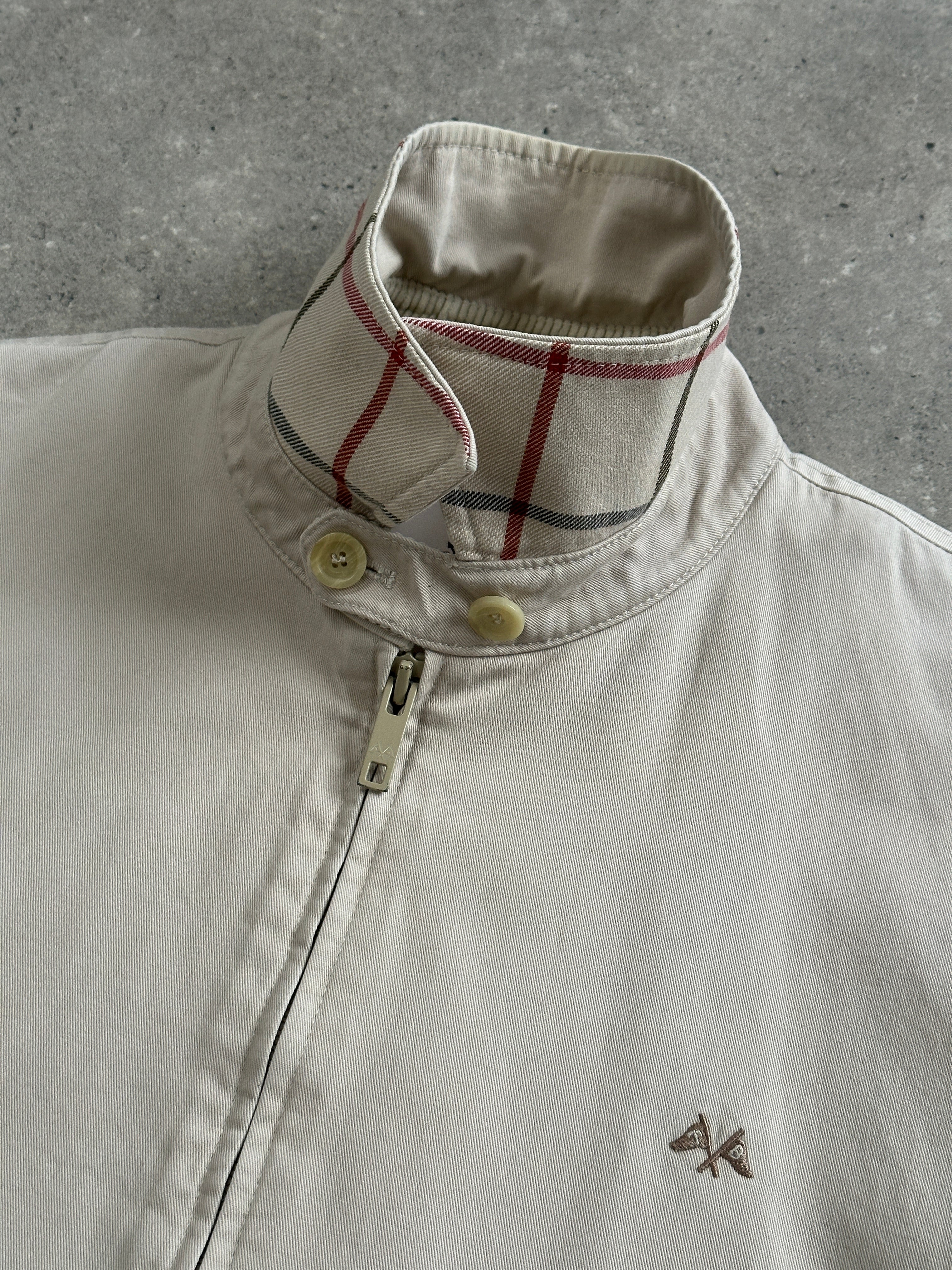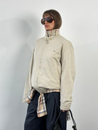 A vintage 1990s Thomas Burberry Harrington-style jacket in a light neutral tone with a clean, structured silhouette. Finished with a high neck fastening and subtle house check detailing that gives it a refined, quietly utilitarian feel.