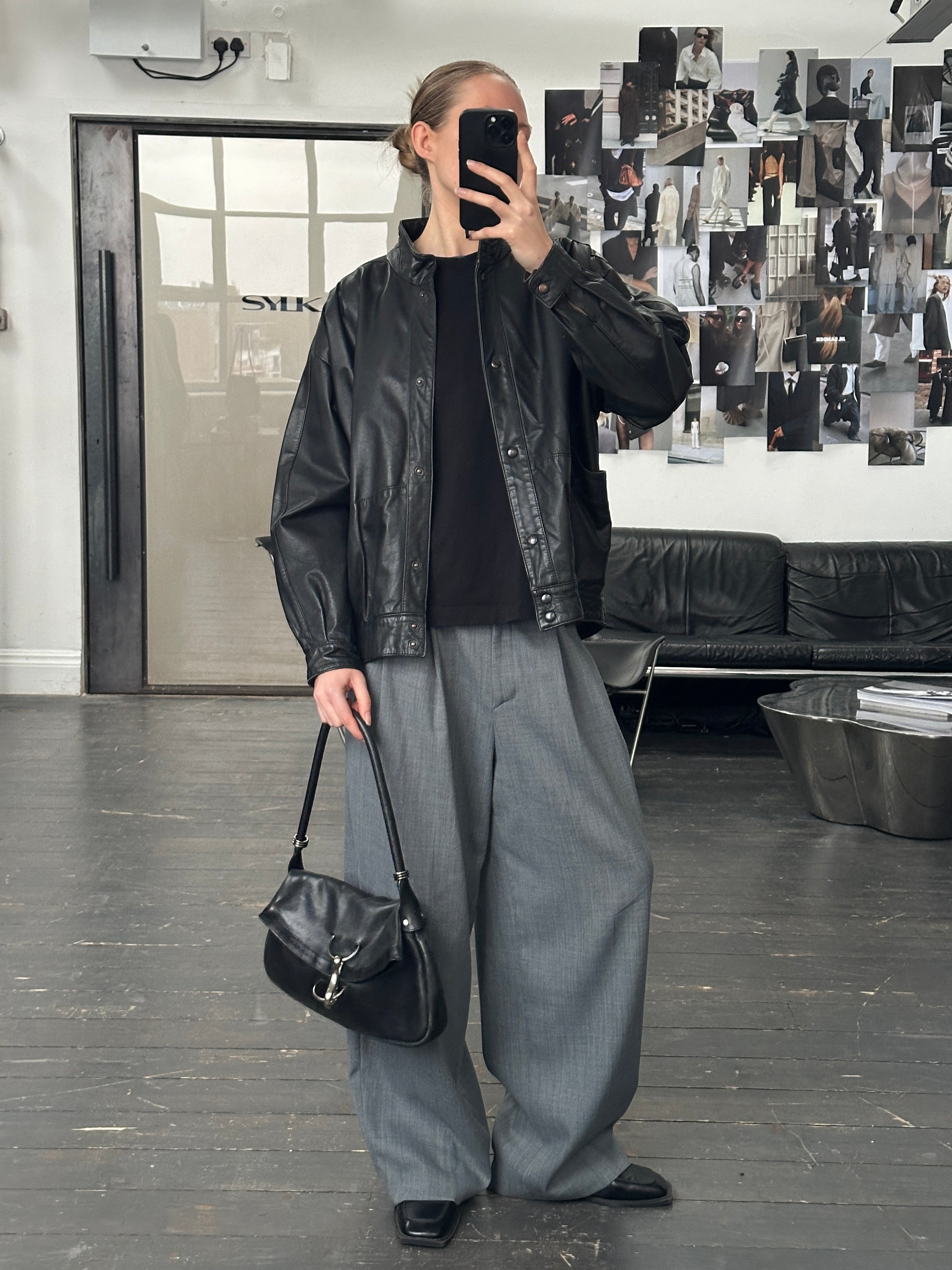 Vintage black leather jacket from the 1990s featuring a clean high neck with popper fastening, soft pleating around the shoulders, and a relaxed silhouette through the body. A minimal leather piece with subtle structure.