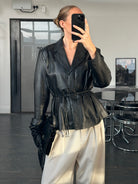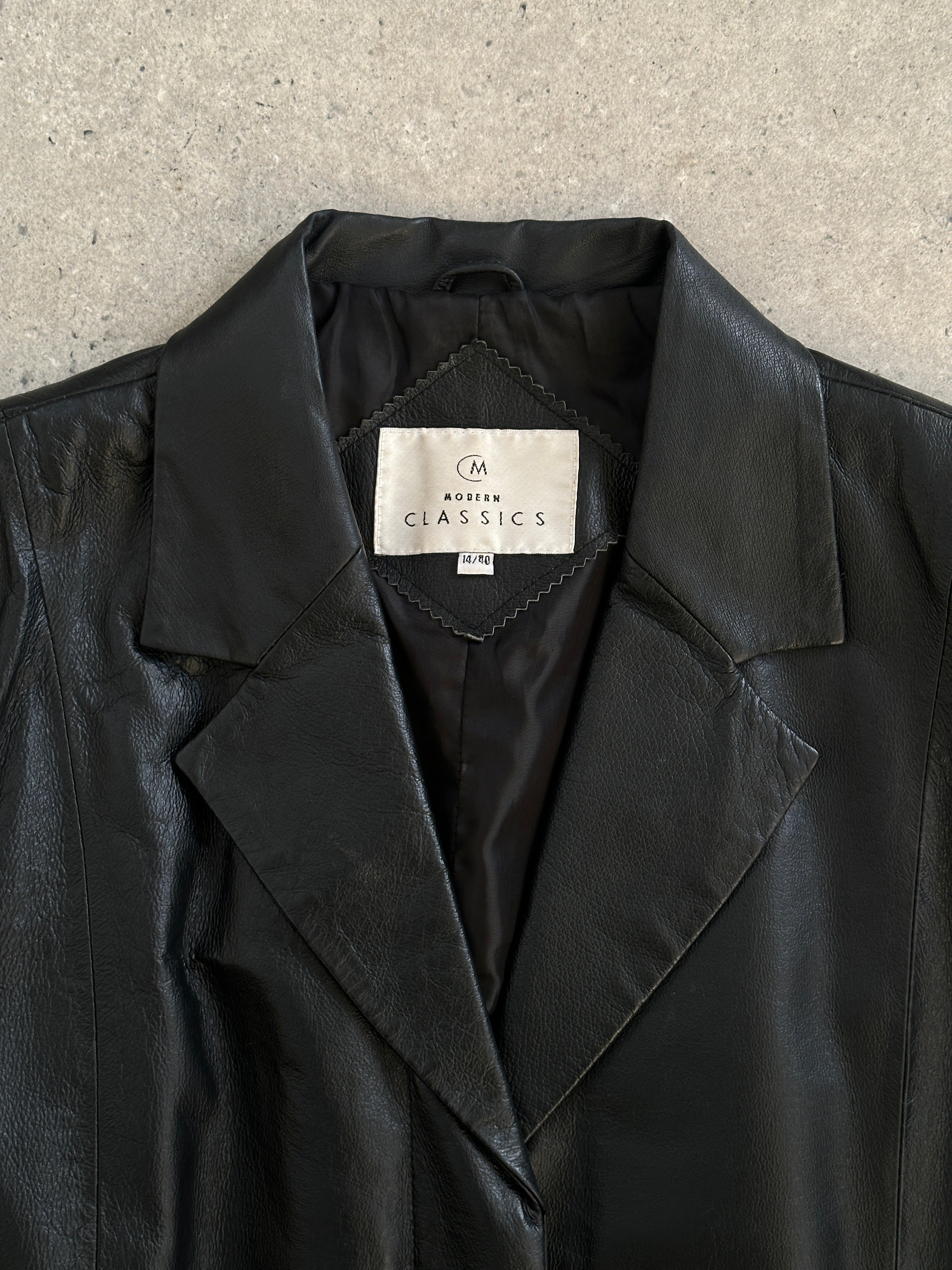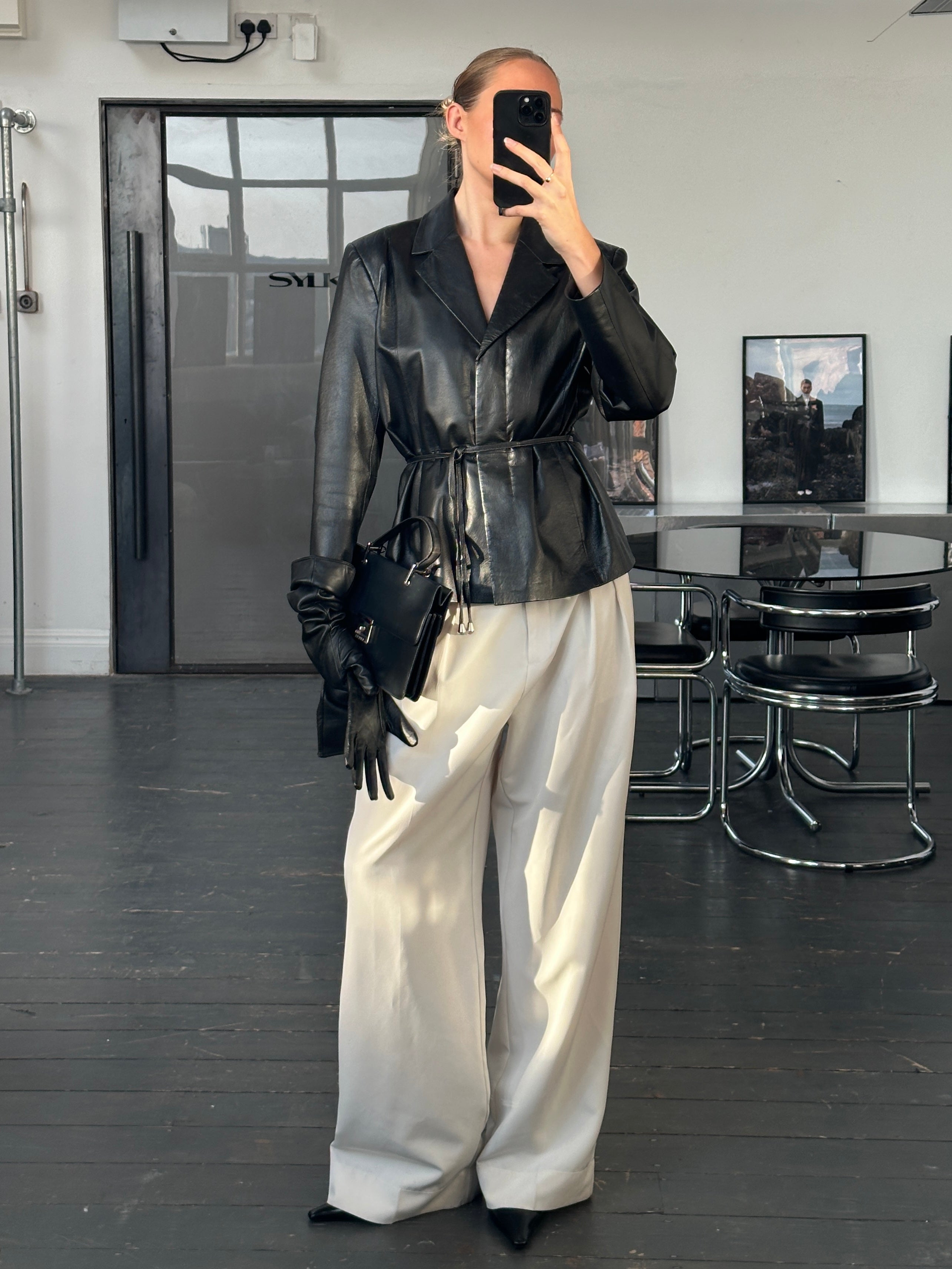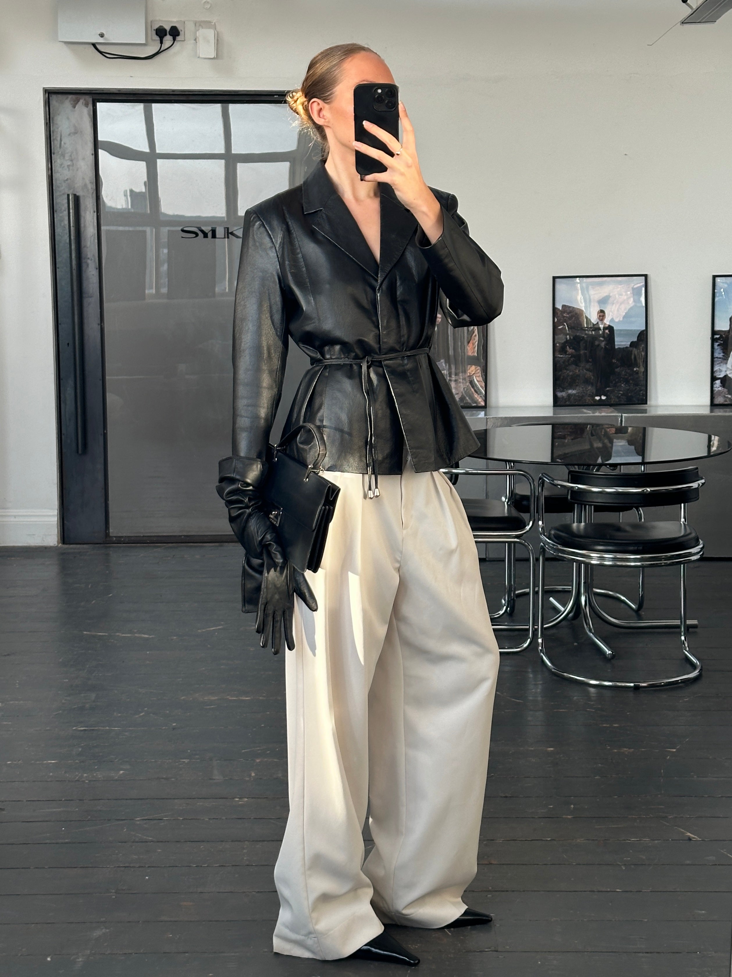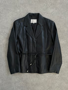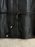 A softly structured 2000s leather jacket by Modern Classic with a clean concealed placket and a minimal tailored silhouette. Designed with a slim rope belt tie to define the waist, finished with a sharp notched collar and smooth nappa leather that sits close to the body. A refined, understated piece that bridges tailoring and outerwear.