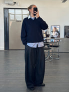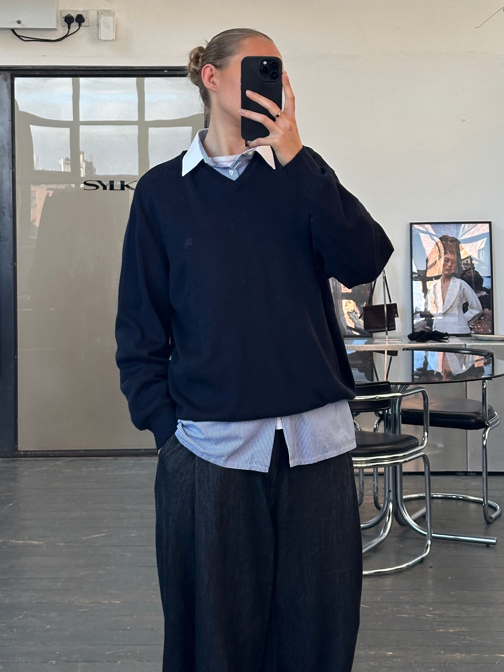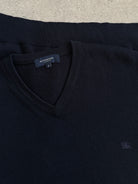Vintage soft merino wool navy V neck jumper featuring the discreet tonal Equestrian Knight logo and classic Burberry London construction from the 2000s era.