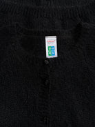 A vintage black cardigan with a soft mohair-blend handle, featuring a clean collarless neckline and classic square button fastening. A timeless layering piece with subtle texture and an understated silhouette typical of late 1990s British knitwear.