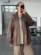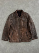 Vintage 1990s brown leather jacket crafted from genuine leather with a naturally aged patina and quilted interior lining.