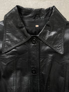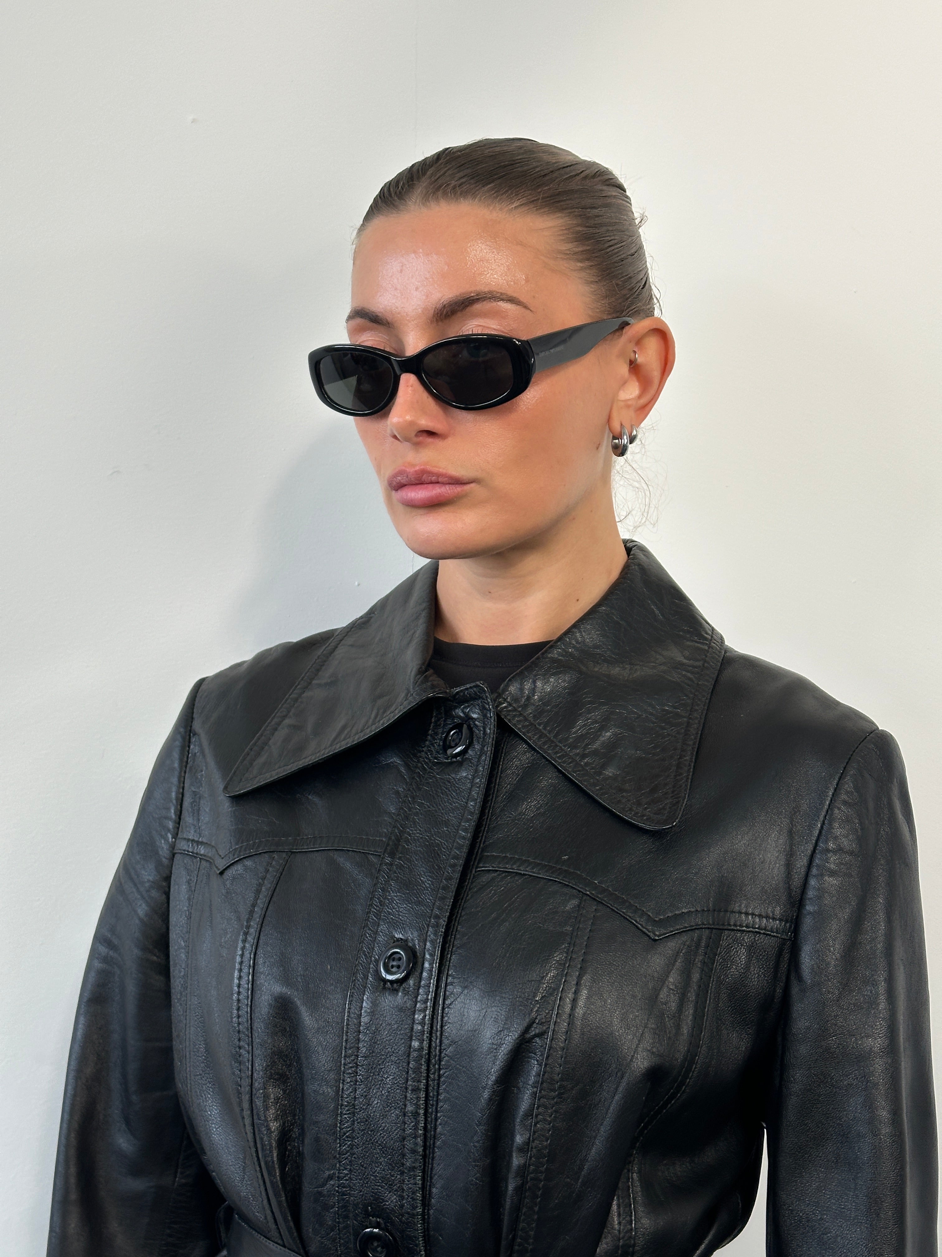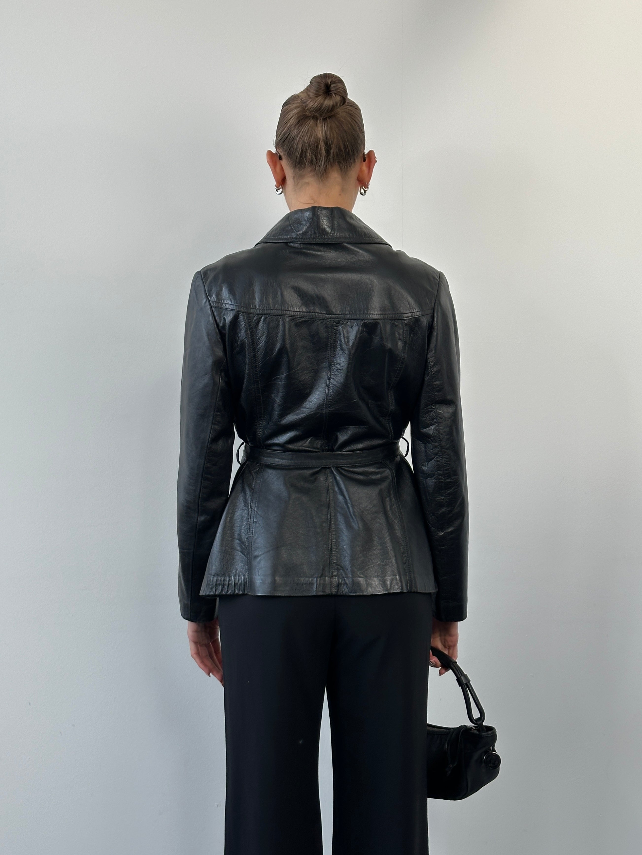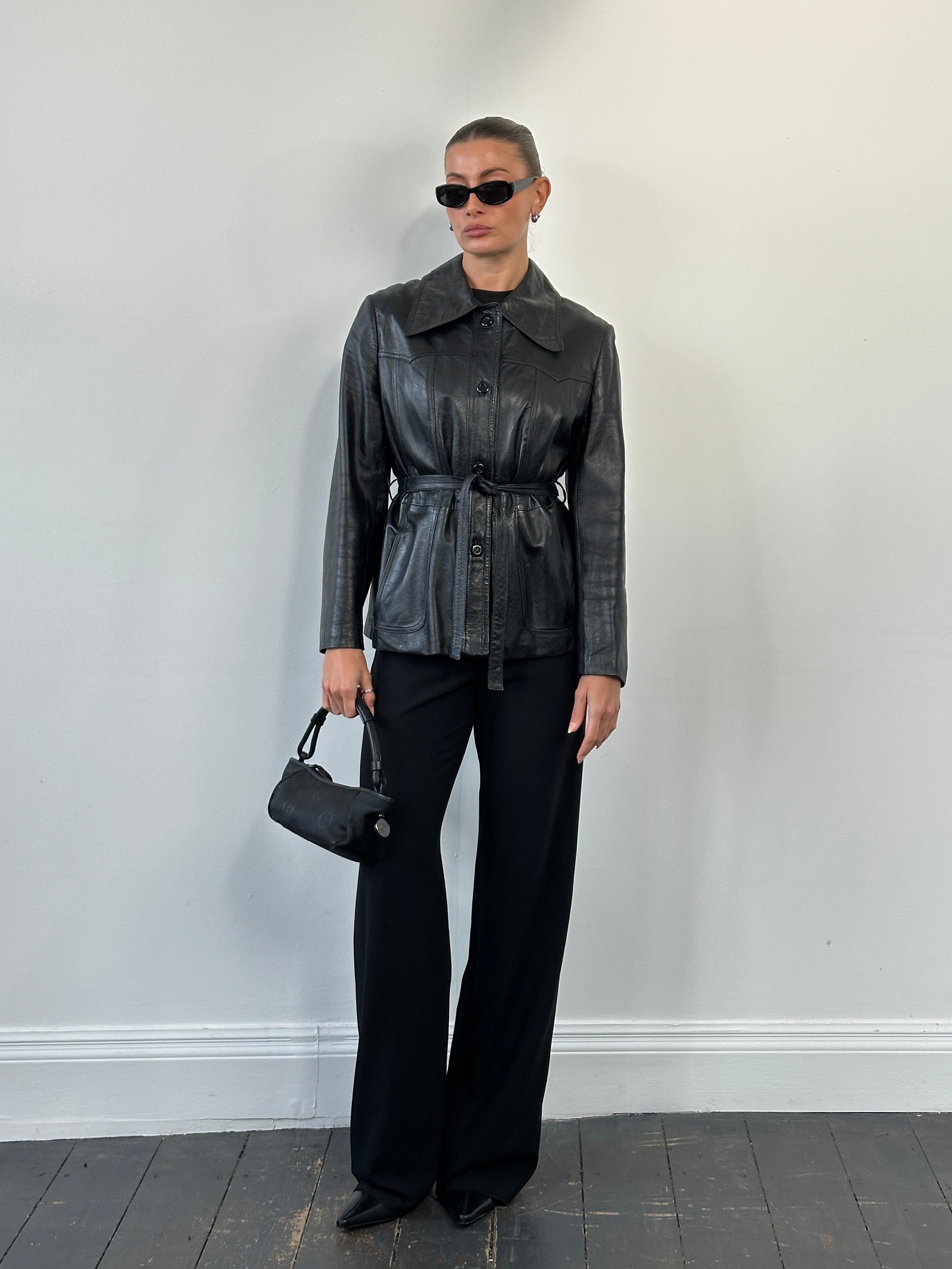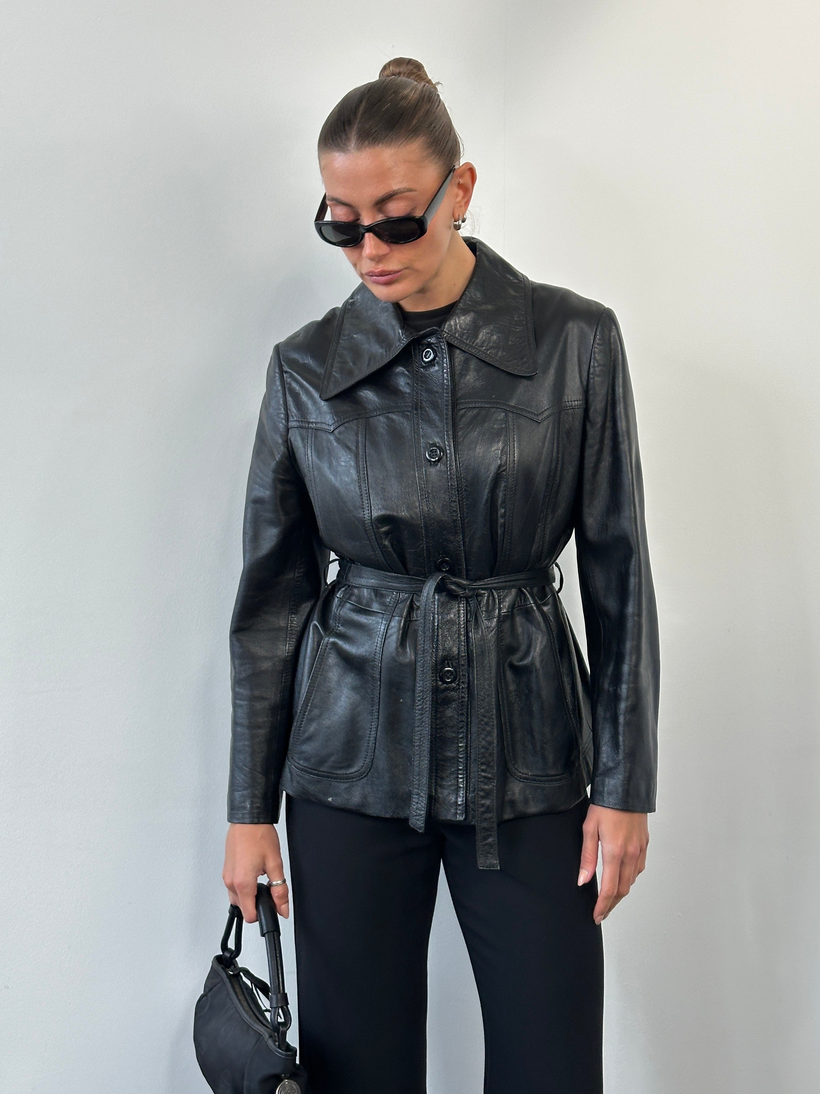 A vintage 1990s black leather jacket with a sharp dagger collar, sculpted panel seams, and a self-tie belt that cinches the waist for a clean, elongated silhouette. Finished with a smooth leather handle and minimal detailing.