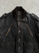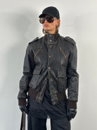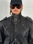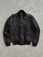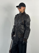 A structured italian vintage leather jacket featuring a high neck fastening and multiple utility pockets. Finished in textured brown leather with ribbed trims and zip detailing, offering a strong early 2000s utility-led silhouette.