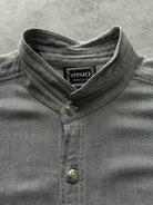 Vintage 1990s Versace Jeans Couture grey woven twill shirt featuring a clean grandad collar, dual chest pockets, and silver bespoke Medusa-engraved buttons. A relaxed, oversized silhouette with a soft drape.