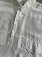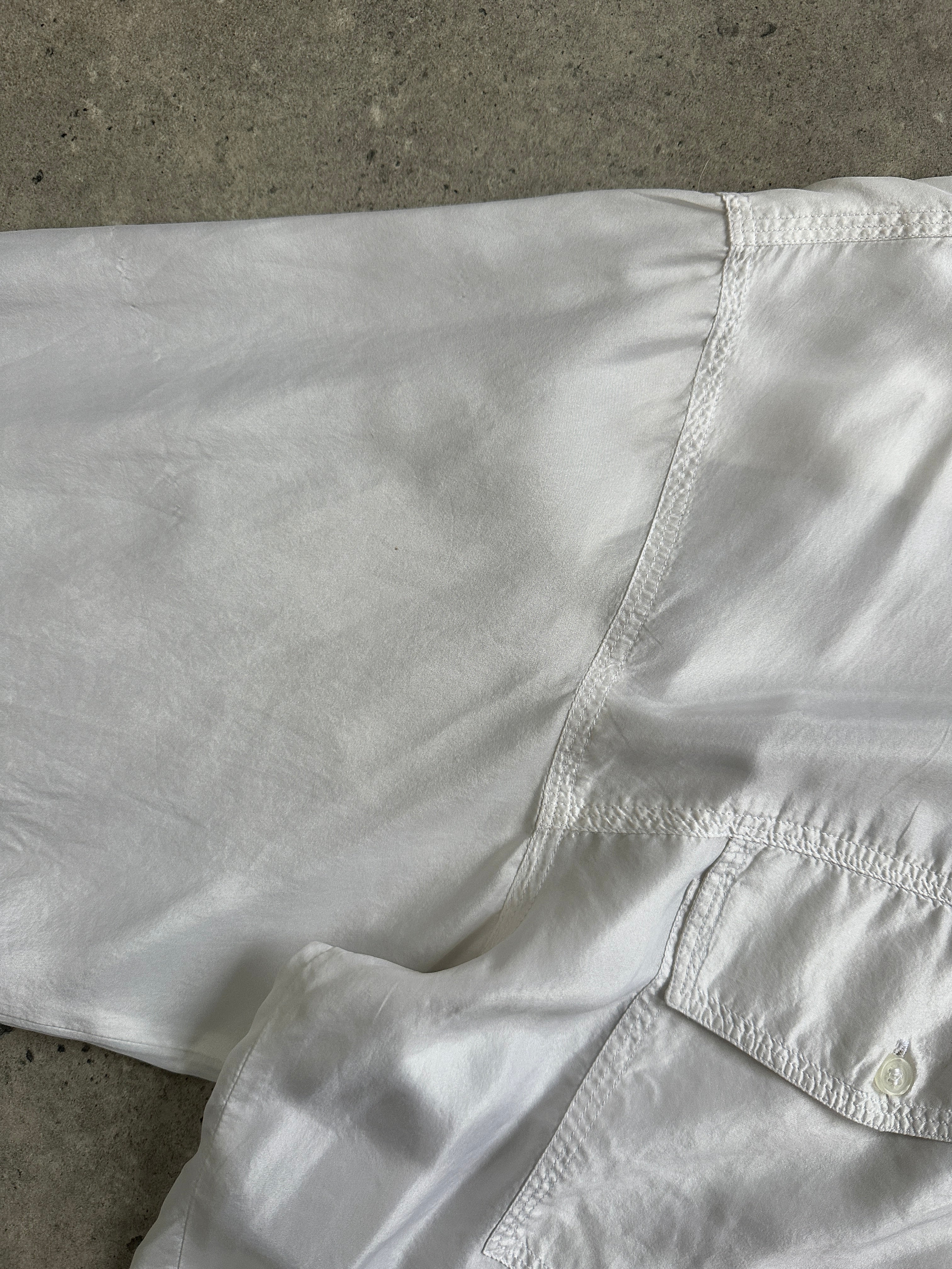 Vintage white pure silk shirt by Umberto Rosetti featuring a soft drape, subtle chest embroidery and relaxed tailoring. A minimal 1990s piece with a clean oversized silhouette.