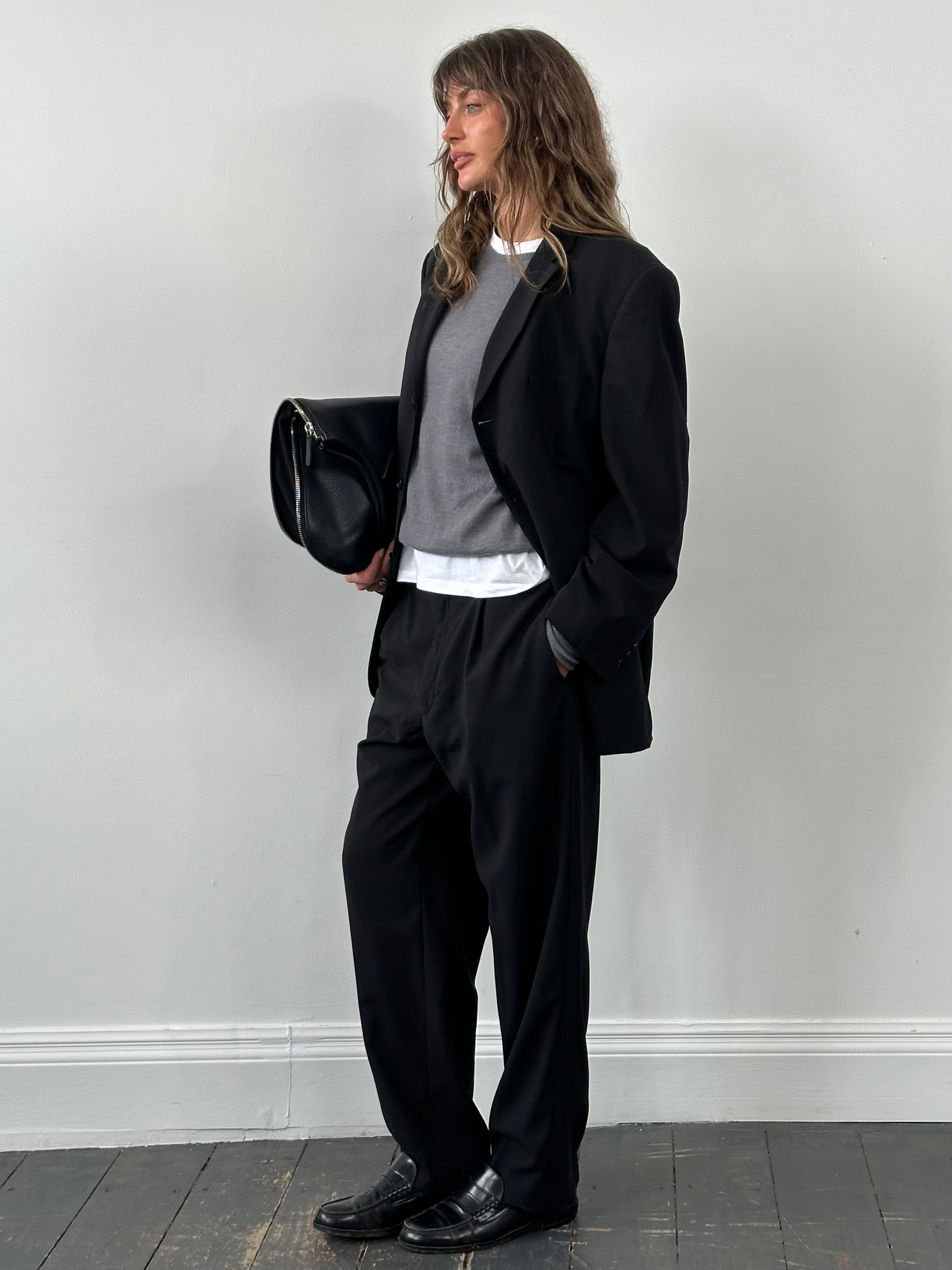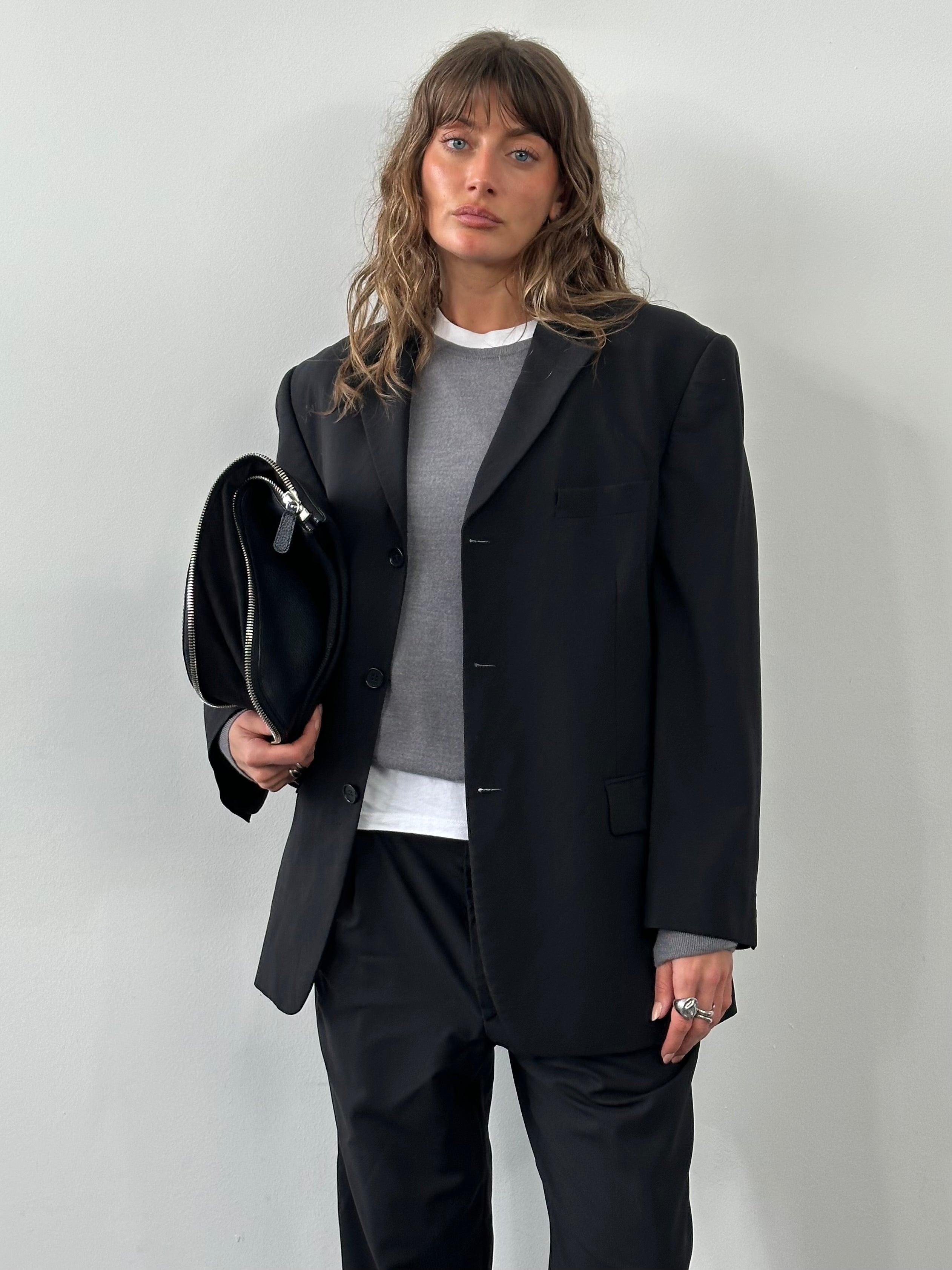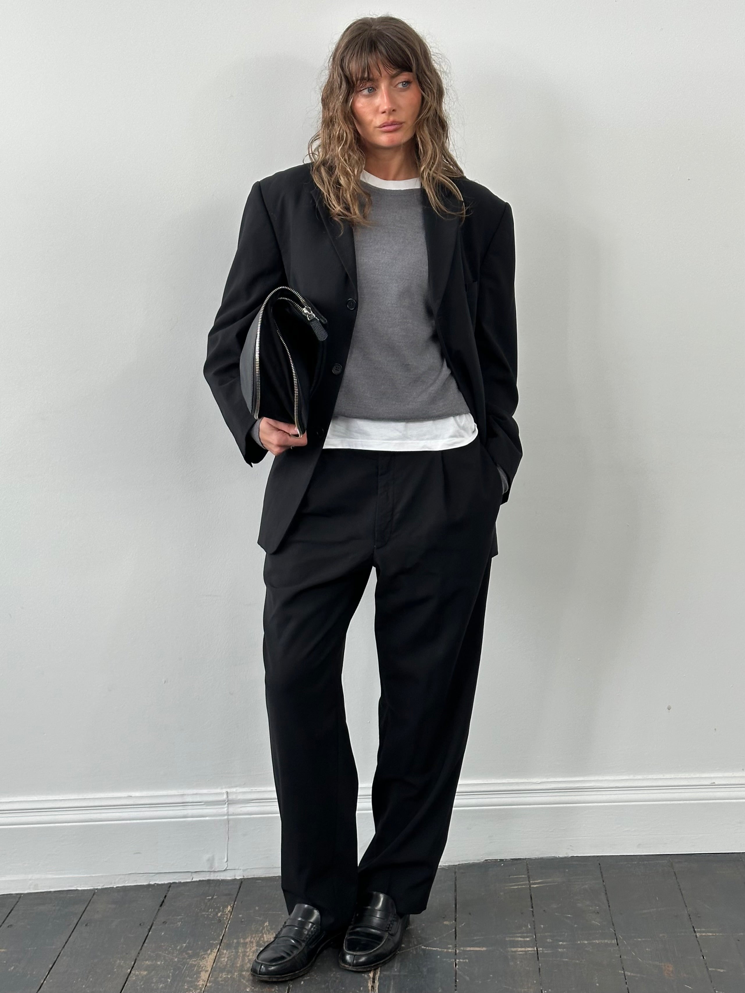 Balmain Paris 1990s vintage pure wool black suit featuring a clean single breasted blazer with comfort stretch construction and monogram logo lining. Tailored with a structured shoulder and straight leg trousers for a sharp, minimal silhouette.