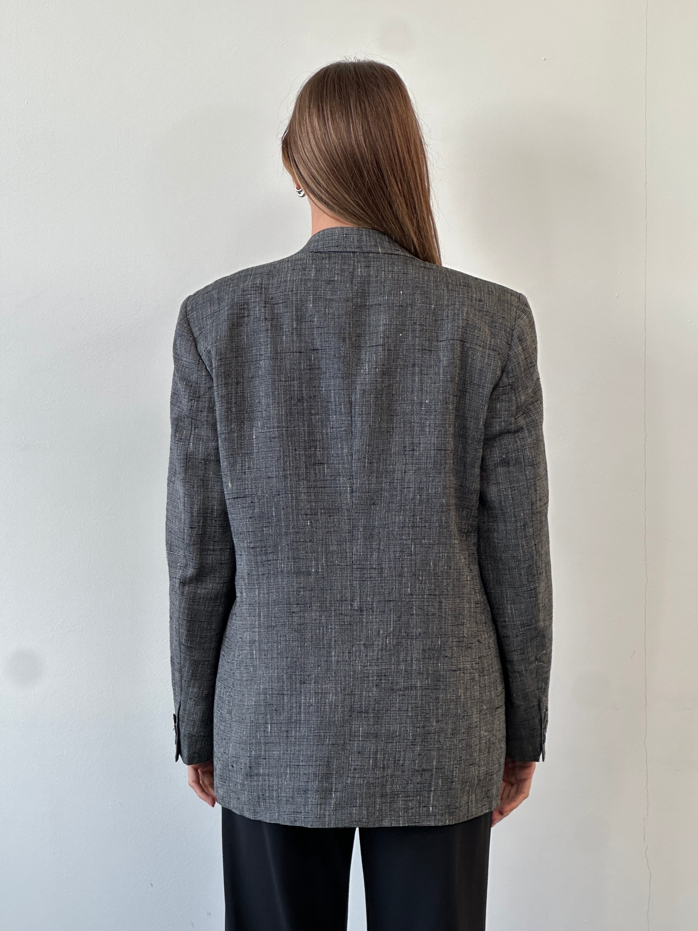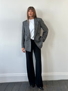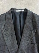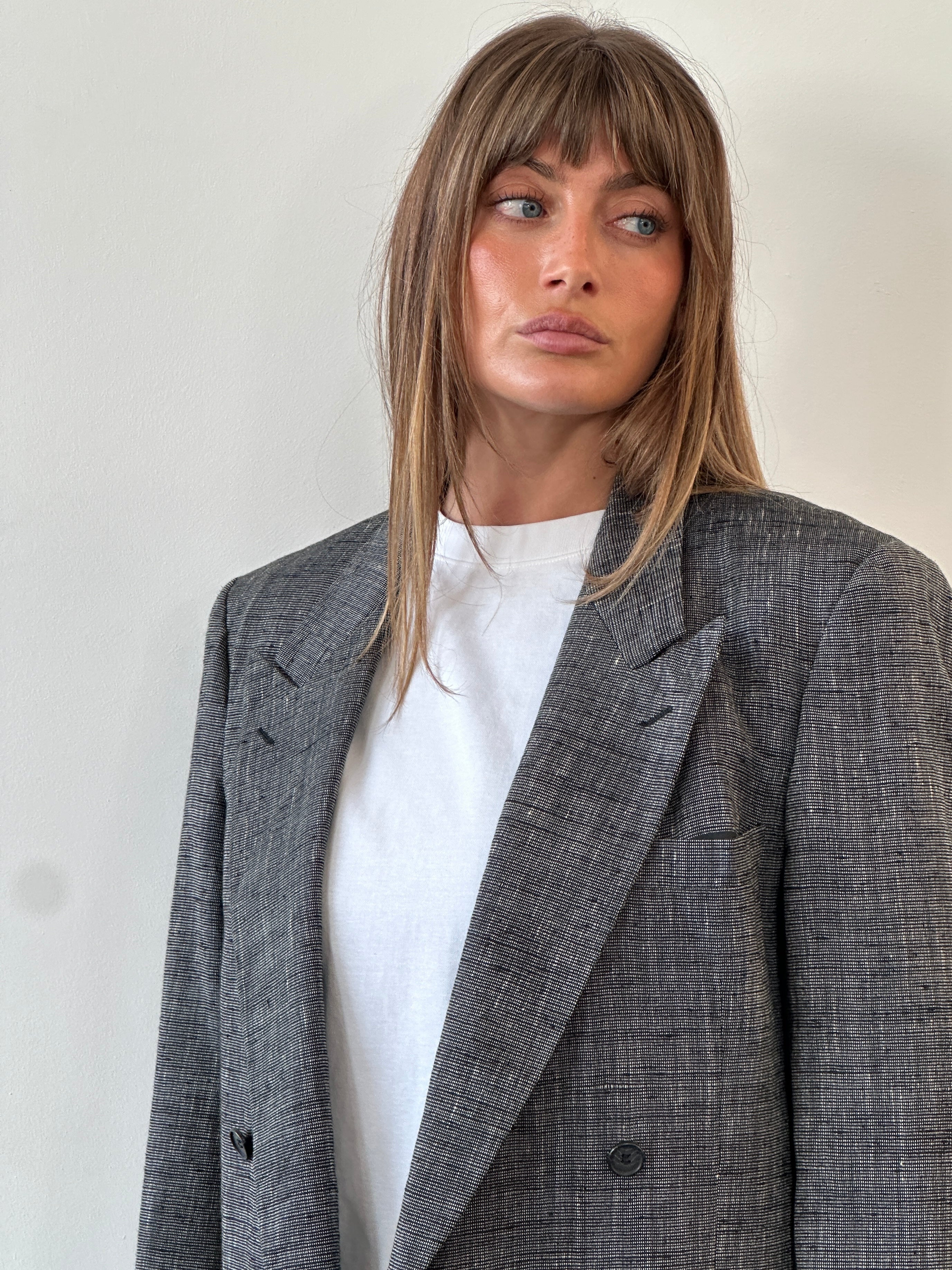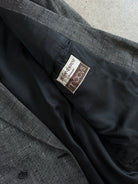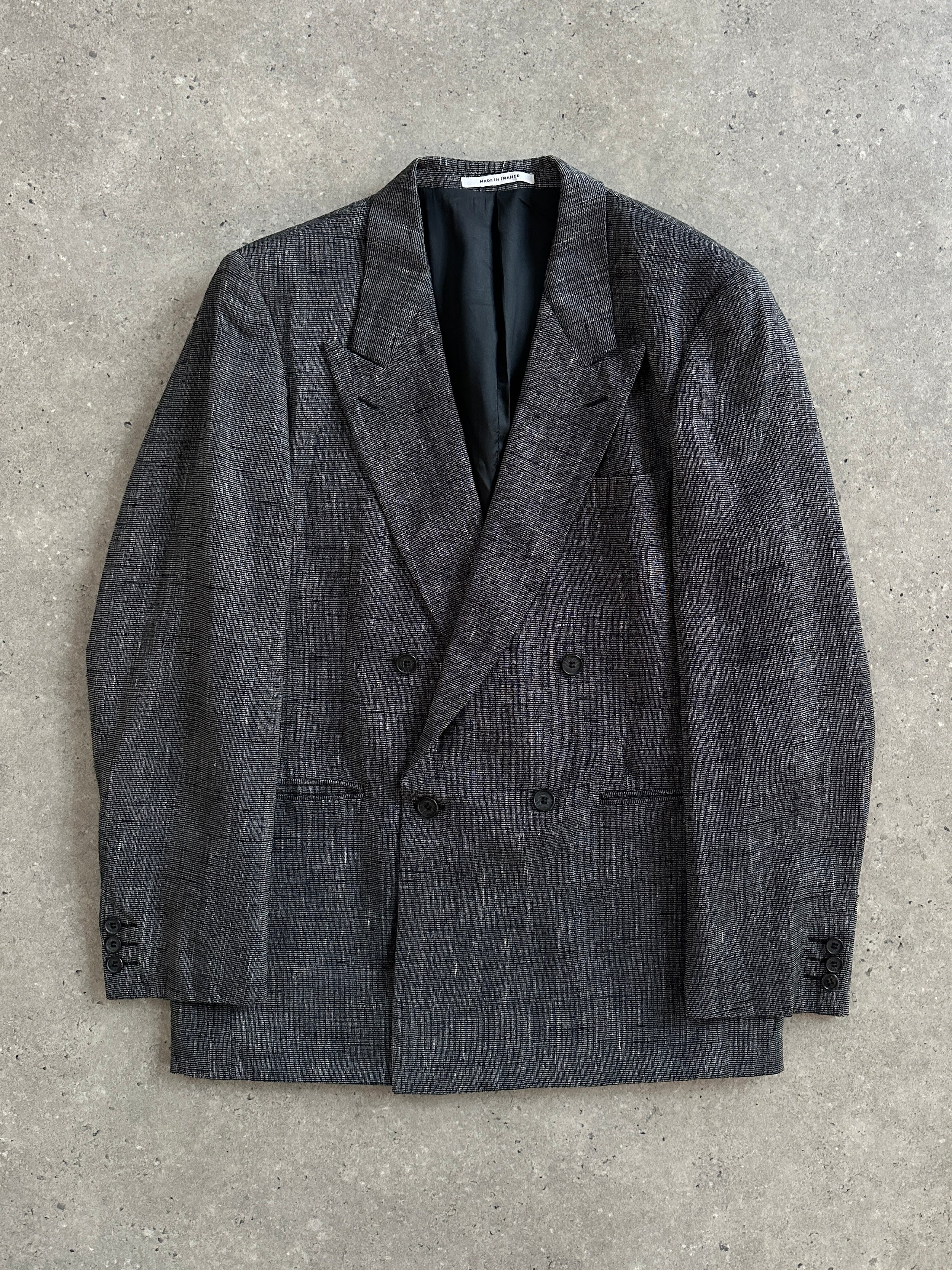 Vintage 1980s Yves Saint Laurent Menswear grey woven blazer with a clean double breasted front and soft structure, offering an easy oversized drape in womenswear. Created as part of an authorised collaboration with Macy’s for the US market.
