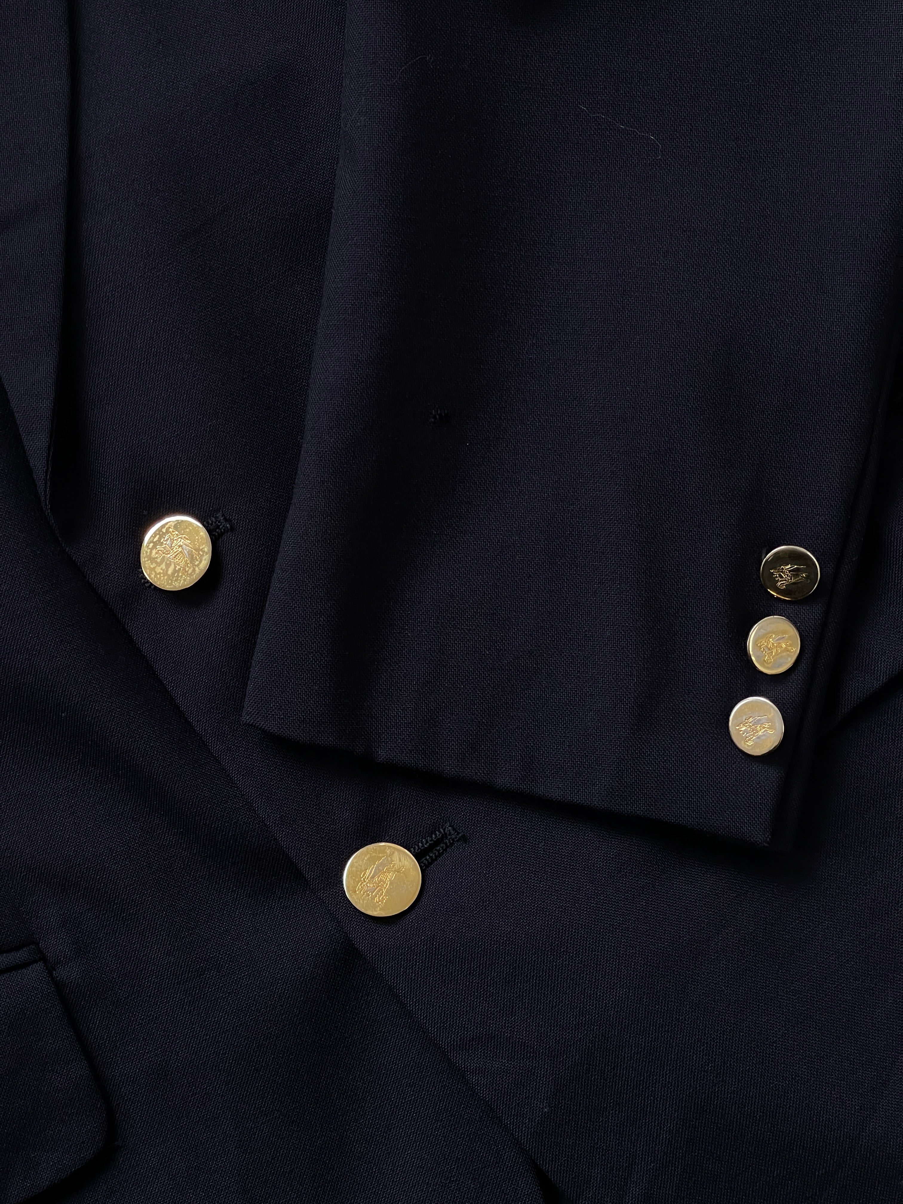 Burberrys of London 1980s tailored blazer in deep navy pure wool with structured shoulders and polished gold crest buttons. Designed with classic notch lapels, flap pockets and distinctive EDK monogram lining, originally made for Bloomingdale’s.