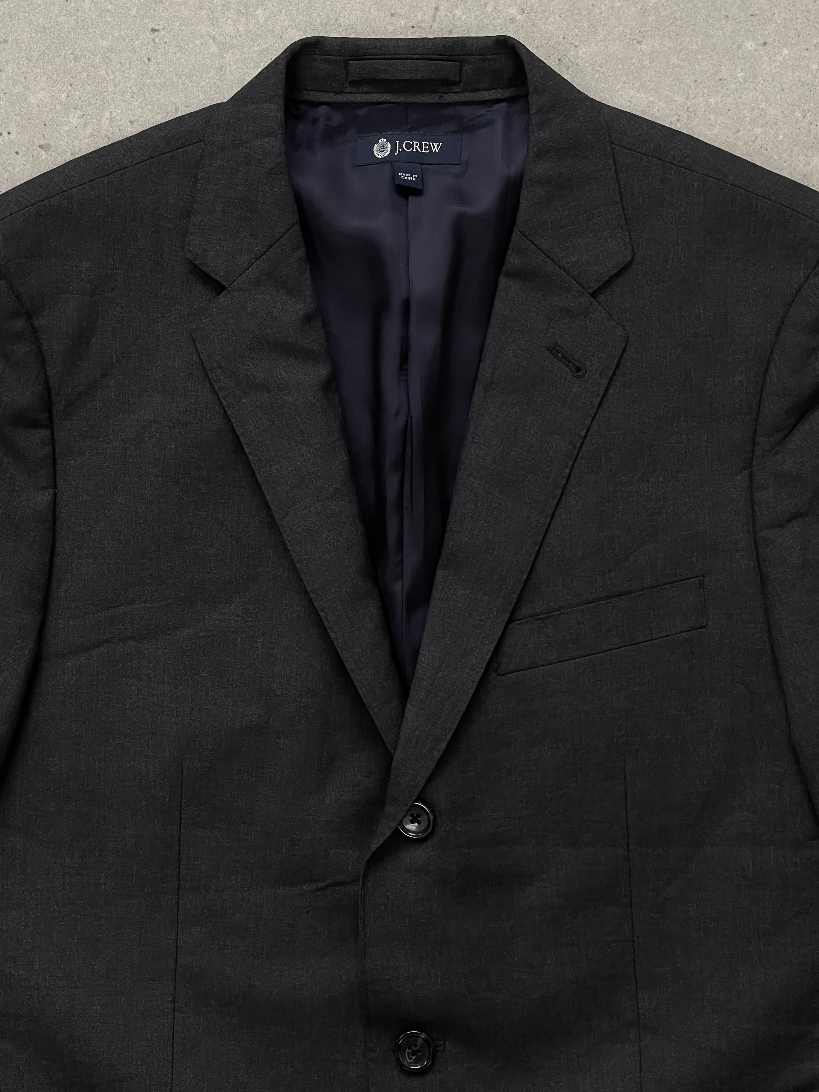 J.Crew tailored single breasted blazer in mid grey Italian Super 120’s wool by Ing. Loro Piana & Co. A clean two button silhouette with structured shoulders and classic notch lapels, offering refined early 2000s minimal tailoring with a smooth lightweight drape.