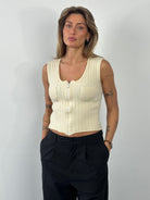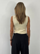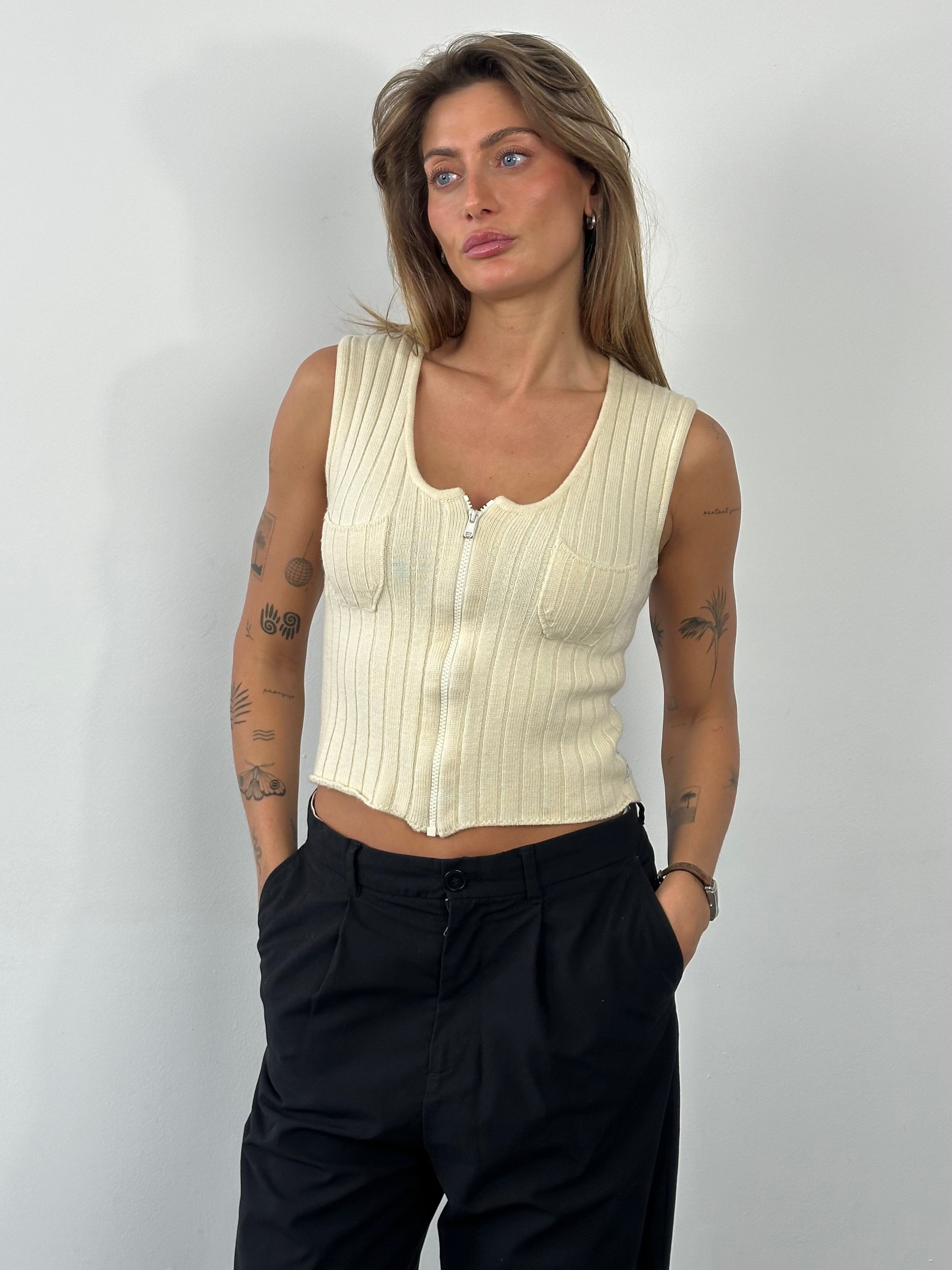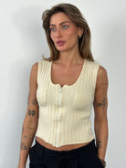 Vintage Armani Jeans sleeveless knit waistcoat in cream with a fine vertical rib texture. Features a full front zip, rounded neckline and two small patch pockets at the chest. Cut in a close, minimal silhouette typical of late 1990s to early 2000s casual knitwear.