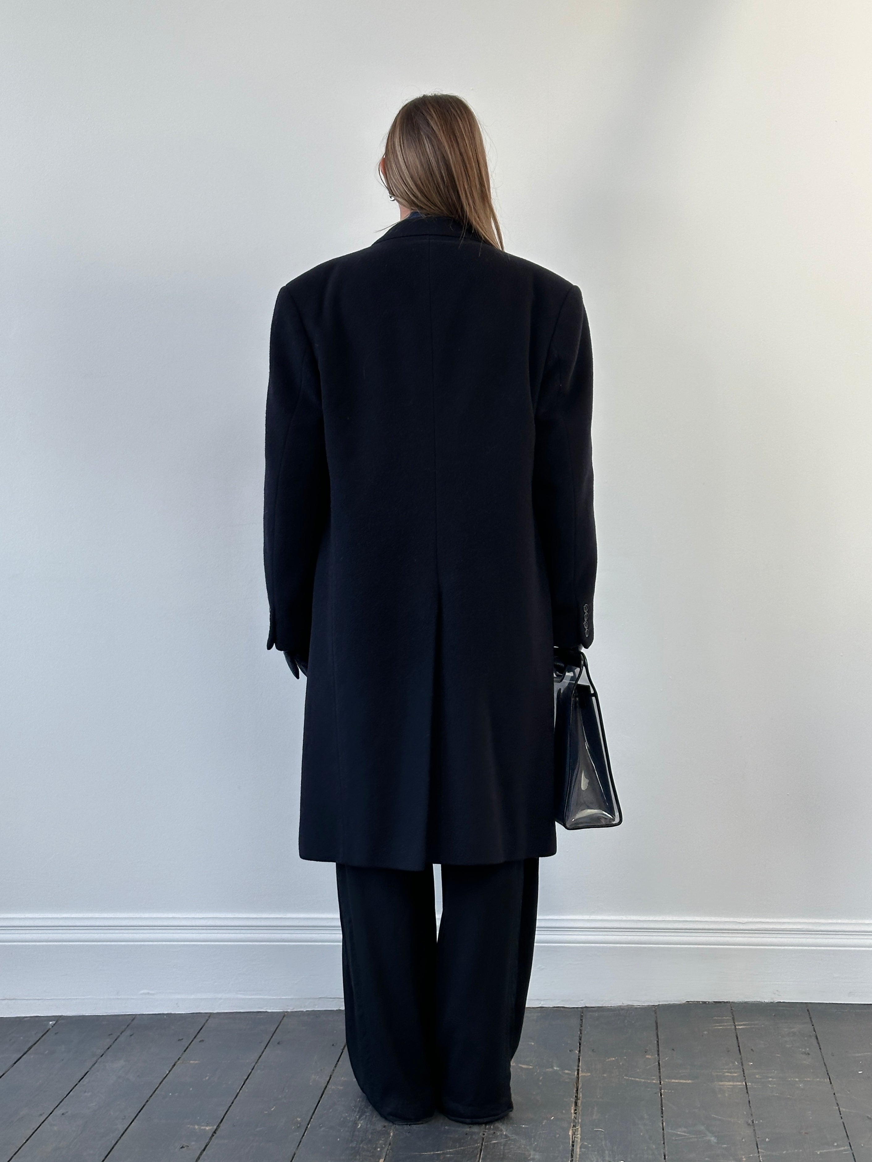 British vintage Savoy Taylors Guild double breasted navy coat from the 1990s with Italian fabric. Features six buttons, strong structured shoulders and a refined tailored silhouette.