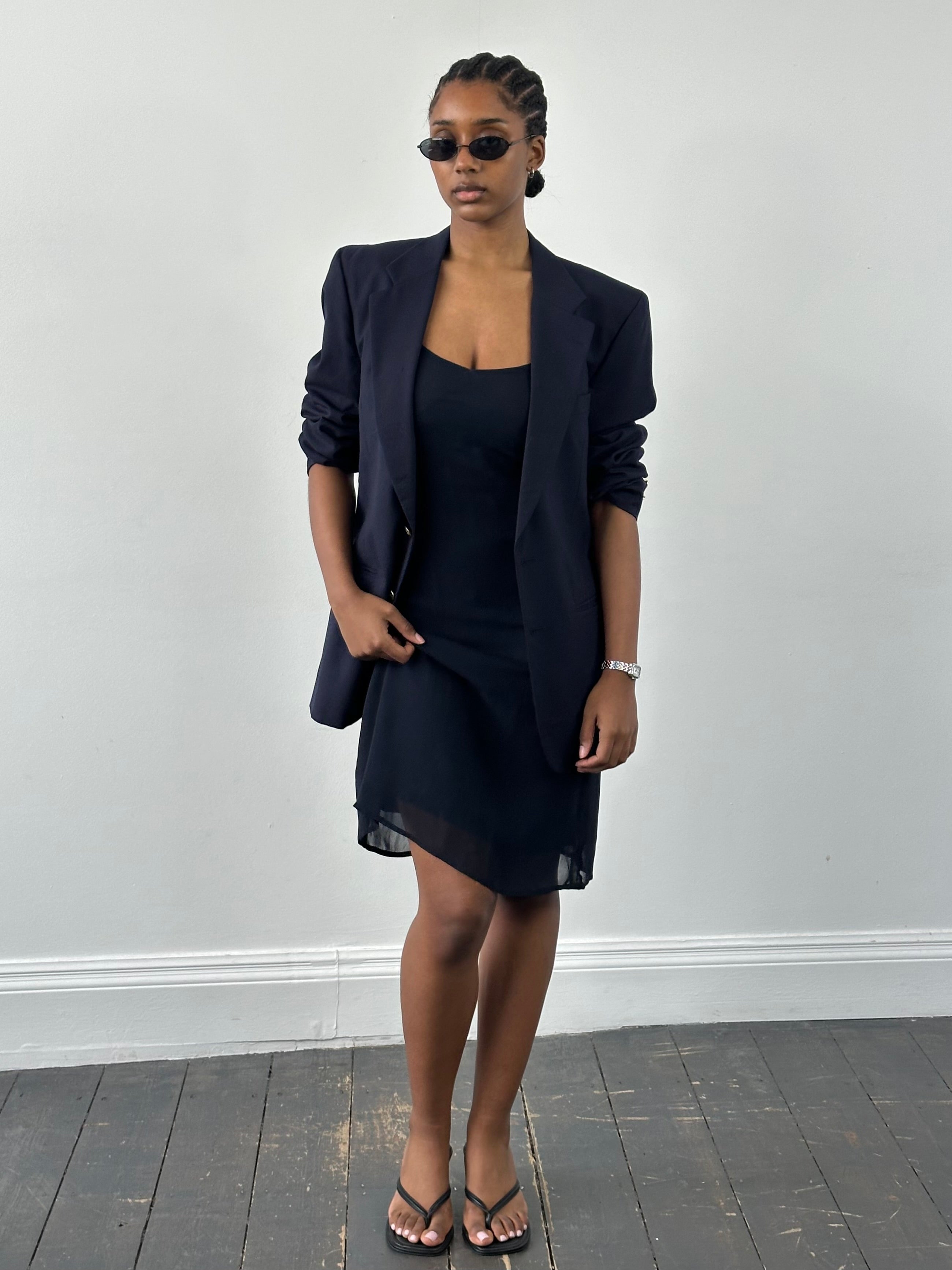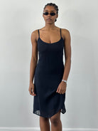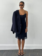 Versus Gianni Versace 1990s slip dress in deep navy with a fluid sheer outer layer and soft internal lining. Cut with fine straps and a minimal straight silhouette that falls just below the knee, creating a clean, understated evening shape.
