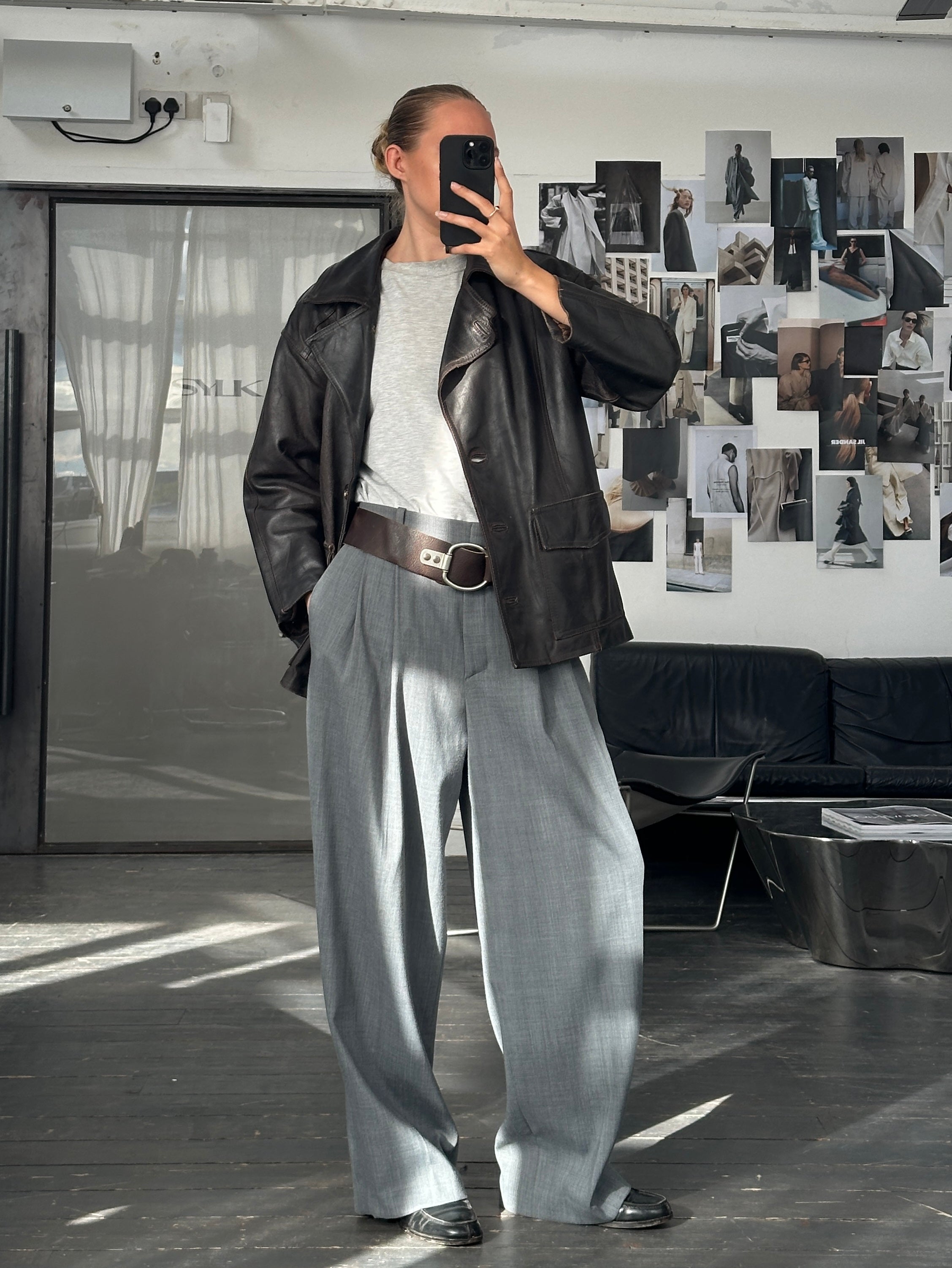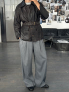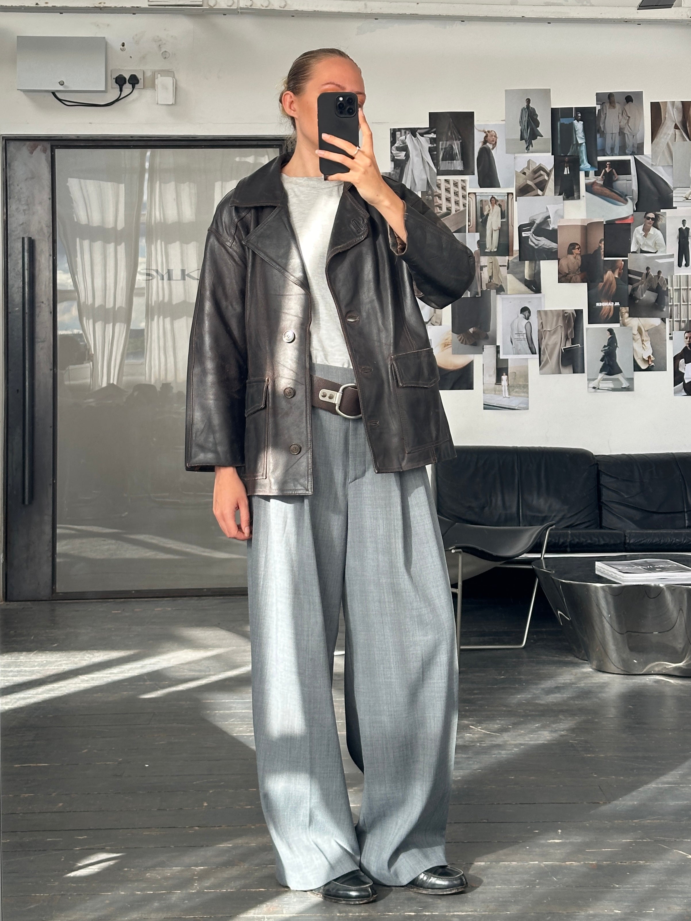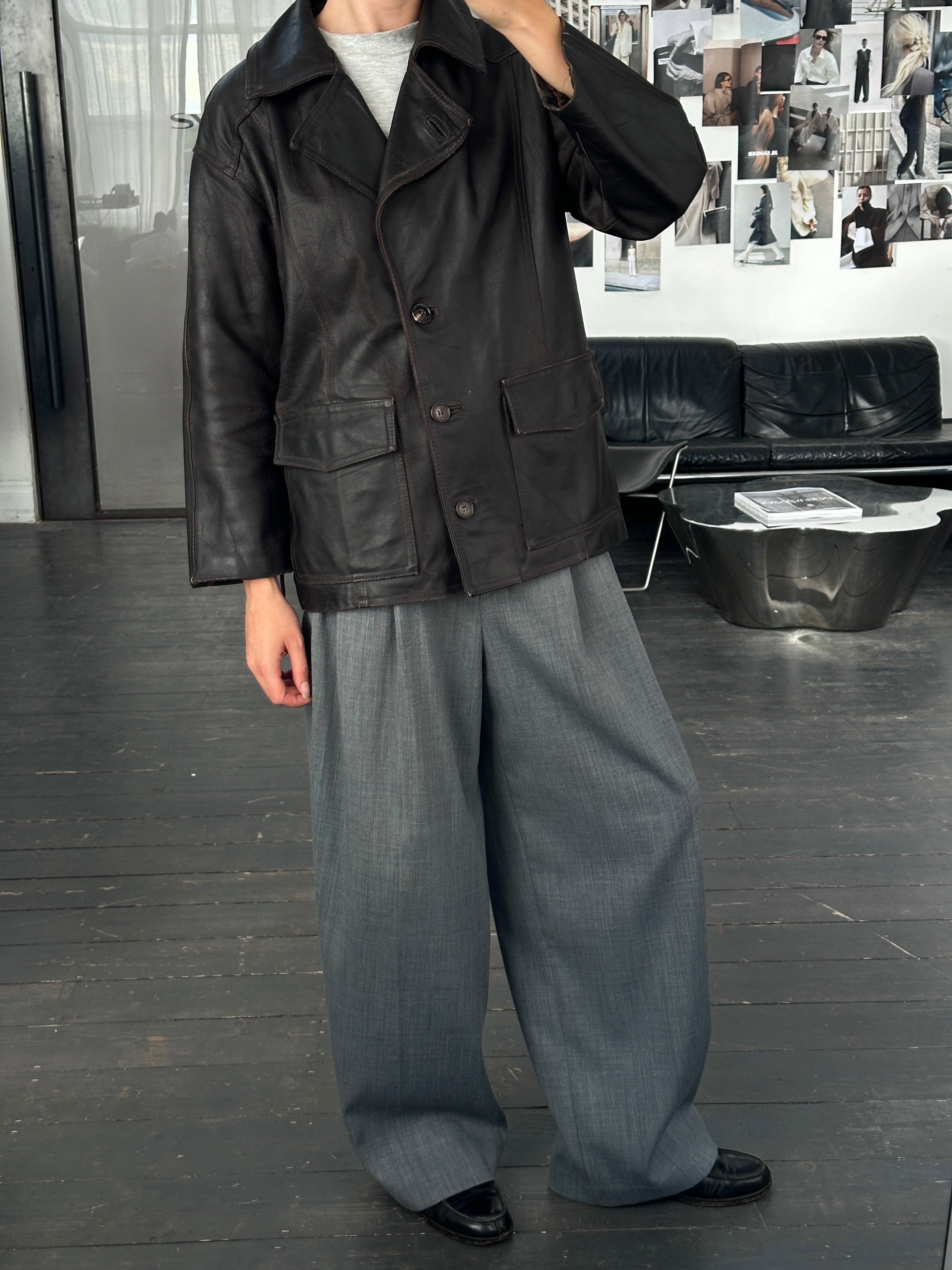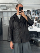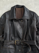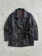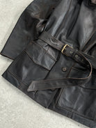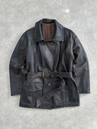A structured Italian leather belted jacket, crafted in the late 70s - 80s with a wide collar, oversized pockets and a fully lined in pure viscose.