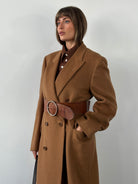 A tan brown Italian-made cashmere coat with a soft brushed texture and a clean double-breasted silhouette. Crafted by Playboy Florence in the 1980s this piece blends minimal tailoring with a rich warm tone.